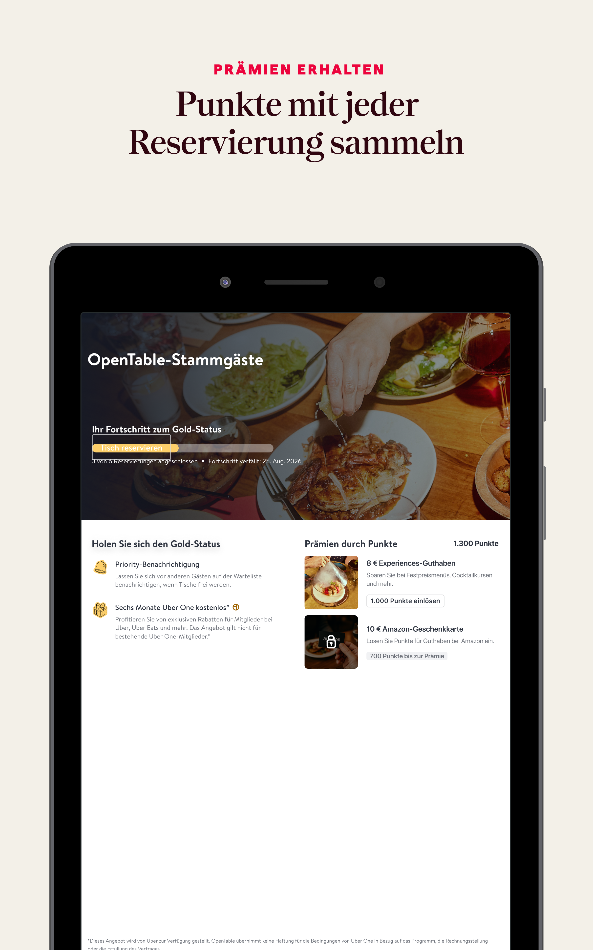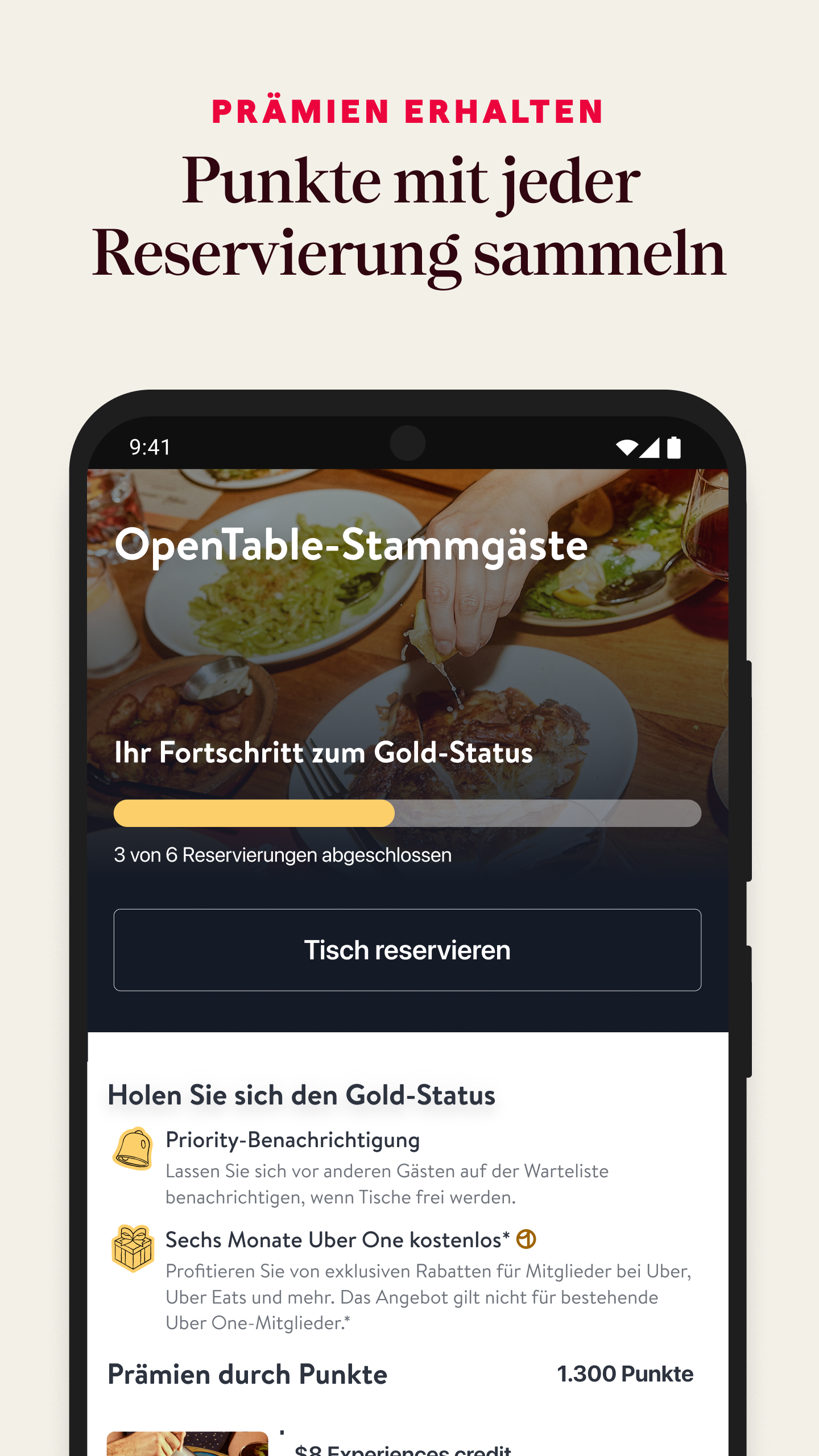 Ein großartiges Restauranterlebnis beginnt mit OpenTable. Laden Sie die App herunter, um das perfekte Restaurant zu finden, egal wo Sie gerade unterwegs sind. Entdecken Sie großartige Restaurants - Wählen Sie aus über 60.000 Restaurants weltweit - Suchen Sie nach Menüs, Angeboten und anderen besonderen Experiences - Lesen Sie verifizierte Bewertungen von echten Gästen, die das Restaurant besucht haben - Filtern Sie nach Art der Küche, Preis und mehr, um genau zu finden, wonach Sie suchen - Profitieren Sie von den Empfehlungen unserer Expertinnen und Experten mit den OpenTable-Guides - Entdecken Sie die besten Restaurants in Ihrer Nähe mit der Kartenansicht Finden Sie Tisch zu Uhrzeiten, die Ihnen passen - Suchen Sie nach bestimmten Daten, Zeiten und Orten, um zu sehen, wo Sie buchen können - Erfahren Sie, wann in Ihrem Lieblingsrestaurant der nächste Tisch frei ist - Verwenden Sie ""Benachrichtigen Sie mich"", um Mitteilungen zu erhalten, sobald Tische in angesagten Restaurants frei werden Verwalten Sie Ihre Restaurantbesuche in einer App - Überblicken Sie all Ihre Reservierungen und ändern Sie sie über die App - Senden Sie Direktnachrichten an das Restaurant, um Fragen zu stellen, wichtige Informationen wie Ernährungsbedürfnisse mitzuteilen und vieles mehr - Wenn Sie ein OpenTable-Konto erstellen, sammeln Sie Bonuspunkte, wenn Sie in bestimmten Restaurants essen gehen Folgen Sie uns auf: https://www.instagram.com/opentablede https://www.tiktok.com/@opentable https://www.youtube.com/c/OpenTable https://www.facebook.com/OpenTableDe/ Brauchen Sie Hilfe? Wir freuen uns, von Ihnen zu hören! Kontaktieren Sie uns unter https://help.opentable.com/