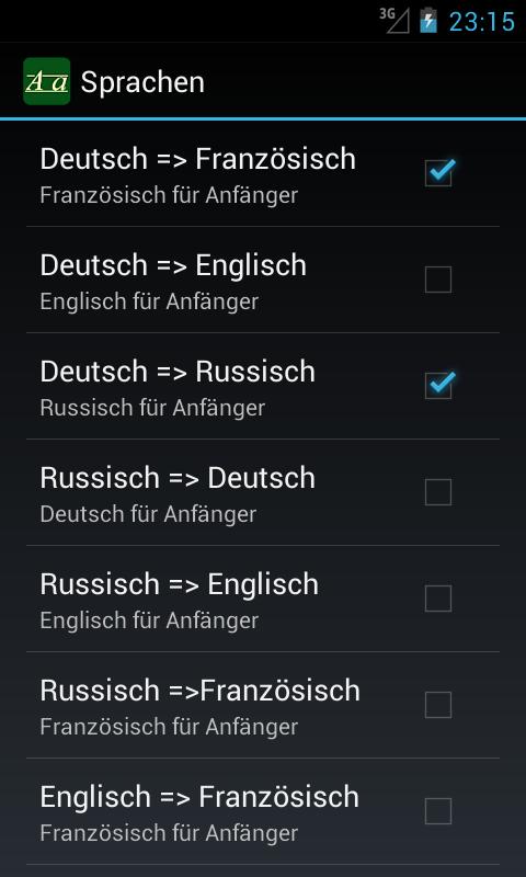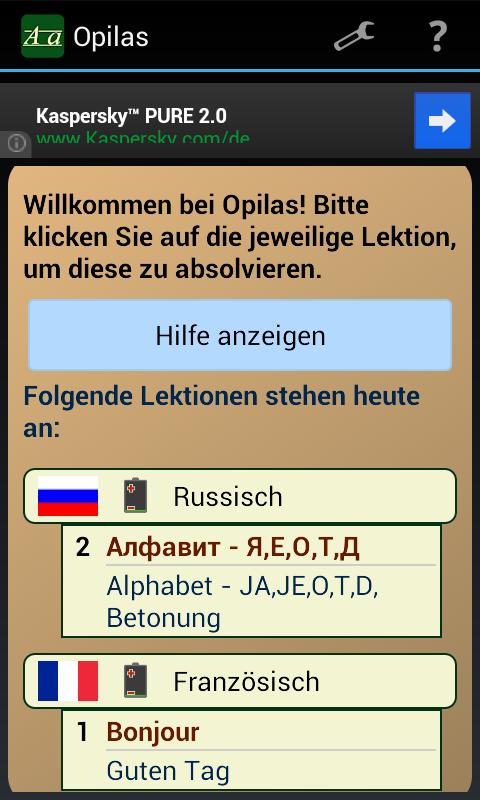 Willkommen in der Sprachen-Lernen-App Opilas! Opilas Vokabeltrainer wird Ihnen helfen, eine oder mehrere Sprachen leicht und schnell zu lernen - und das ganz kostenlos. Keine Vorkenntnisse sind erforderlich. Sie erlernen die Grammatik auf eine Intuitive Art und Weise - so wie Kinder es tun. Die Anwendung ist für Anfänger entwickelt worden, eignet sich aber auch hervorragend für Fortgeschrittene, um bereits vorhandenen Wortschatz aufzufrischen bzw. zu wiederholen. Sie lernen durch Einprägen von einfachen Sätzen in einer übersichtlichen Anzahl von Flashkarten pro Tag. Durch Verwendung einer ausgeklügelten Vorgehensweise und neuester Erkenntnisse aus der Gedächtnisforschung werden Sie auf eine spielerische Art und Weise und ohne großen Zeitaufwand mehrere hundert Wörter der jeweiligen Sprache innerhalb kurzer Zeit erlernen und benutzen können. Nach ein paar Wochen täglicher Übungen ersetzt diese App einen Sprachführer. Sie können Diese Sprachkurs-App auf eine (Geschäfts-) Reise mitnehmen und mit Flashkarten Wörter und Phrasen lernen. Lesen und Sprechen Sie 5-10 Minuten pro Tag. Sie kennen die Situation: Sie befinden sich im Urlaub oder auf Reisen und kein Übersetzer kann Ihnen bei der Kommunikation helfen. Dafür gibt es jetzt eine Lösung - Lernen sie Ihre Lieblingssprache: Sie machen einfach die entsprechenden Übungen (eine Lektion für jeweils eine Sprache / Tag), wenn die App Sie täglich dazu auffordert. Pro Tag wird einen neue Lektion freigeschaltet sofern Sie die vorhergehende absolviert haben. Sie können diese App sowohl für Kinder als auch für Erwachsene verwenden. Sie unterstützt Sie auch beim lernen von Verben. Opilas ist ihr persönlicher Nachhilfelehrer. Benutzen sie Opilas als Vokabeltrainer - profitieren und lernen Sie Ihre Sprachen von der Community. Momentan sind folgende Sprachen verfügbar Deutsch => Russisch (mind. 28 Tage / 4 Wochen) Deutsch => Englisch (mind. 42 Tage / 6 Wochen) Deutsch => Französisch (mind. 28 Tage / 4 Wochen) Deutsch => Spanisch (neu, 1 Lektion) Deutsch => Italienisch (neu, 1 Lektion) Englisch => Russisch (mind. 28 Tage / 4 Wochen) Englisch => Deutsch (mind. 36 Tage / 5 Wochen) Englisch => Französisch (mind. 28 Tage / 4 Wochen) Englisch => Spanisch Englisch => Italienisch Russisch => Deutsch (mind. 36 Tage / 5 Wochen) Russisch => Englisch (mind. 42 Tage / 6 Wochen) Russisch => Französisch (mind. 28 Tage / 4 Wochen) Russisch => Spanisch Russisch => Italienisch Opilas Phrasen- und Vokabeltrainer hilft Ihnen, Alltagssituationen zu bewältigen - wie beispielsweise im Hotel, Restaurant, Einkaufen, Urlaub, Small Talk, sich kennen lernen, beim Arzt, Büro usw. Nach unserer Meinung lernen Sie am besten nicht mehr als eine Sprache auf einmal. Erstellen Sie Lektionen / Korrekturen selbst unter http://www.opilas.de/ Wir suchen noch Muttersprachler für Lektionen in / nach französisch, spanisch, italienisch. Besuchen Sie uns auf Facebook unter: http://www.facebook.com/pages/Opilasde/430898540312619 Wir erfassen keine sensiblen Daten - wie Telefonnummern o.ä. Es sind Standard-Berechtigungen, die für Werbung / automatische Erinnerungen, Speichern des Fortschritts usw. benötigt werden. Viel Spaß beim Vokabeln Lernen von französisch, englisch, russisch, spanisch, italienisch und deutsch wünscht Ihnen Ihr Opilas Team