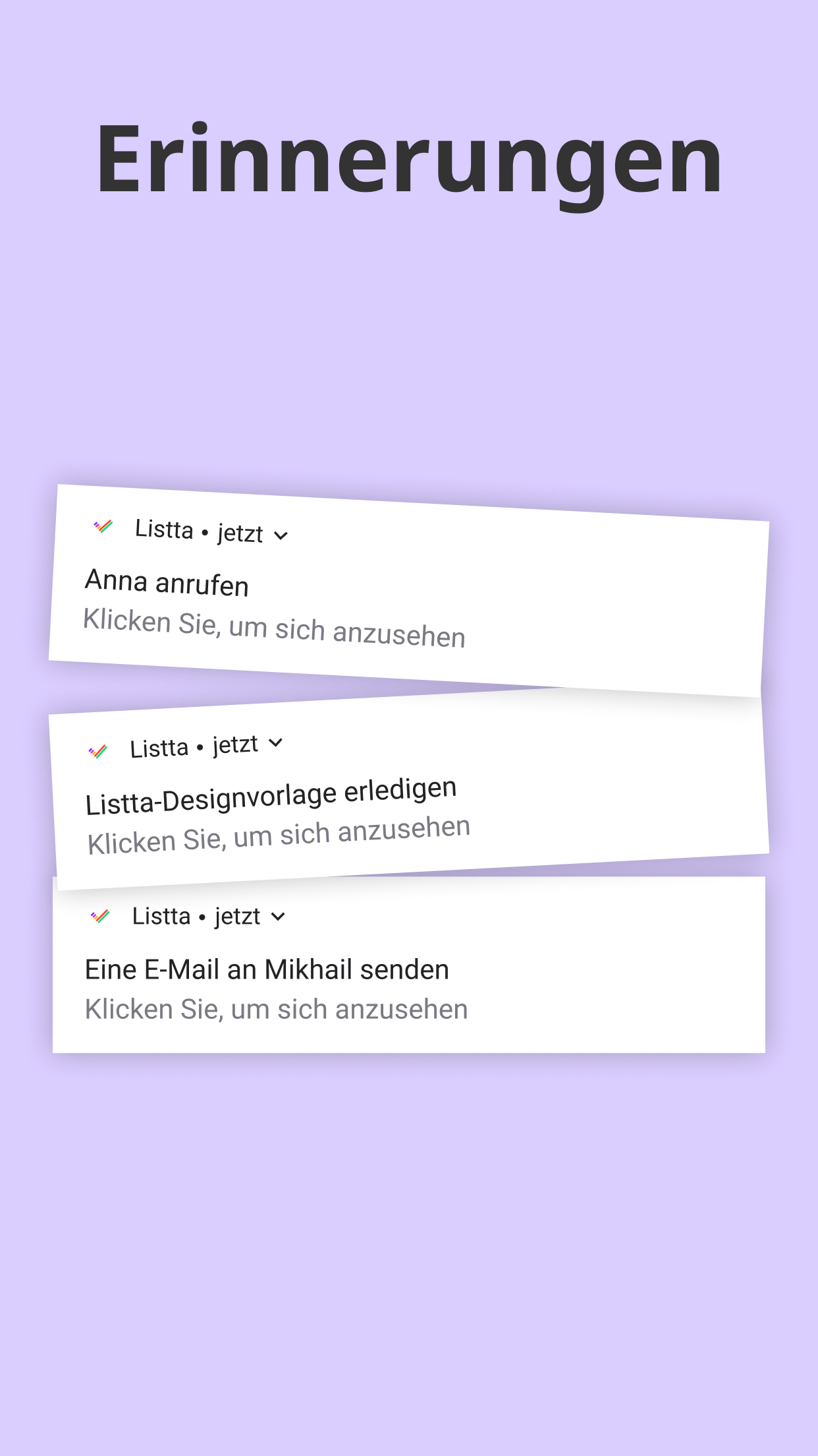 Sie brauchen keine Zeit zum Lernen, da es einfach zu bedienen ist. Mit Listta können Sie schnell mit der Planung Ihres Tagesablaufs beginnen, Ihre Produktivität steigern, wichtige Aufgabenlisten und Terminerinnerungen erhalten, Aufgaben pünktlich erledigen und alle Ihre Ideen und Notizen ablegen.