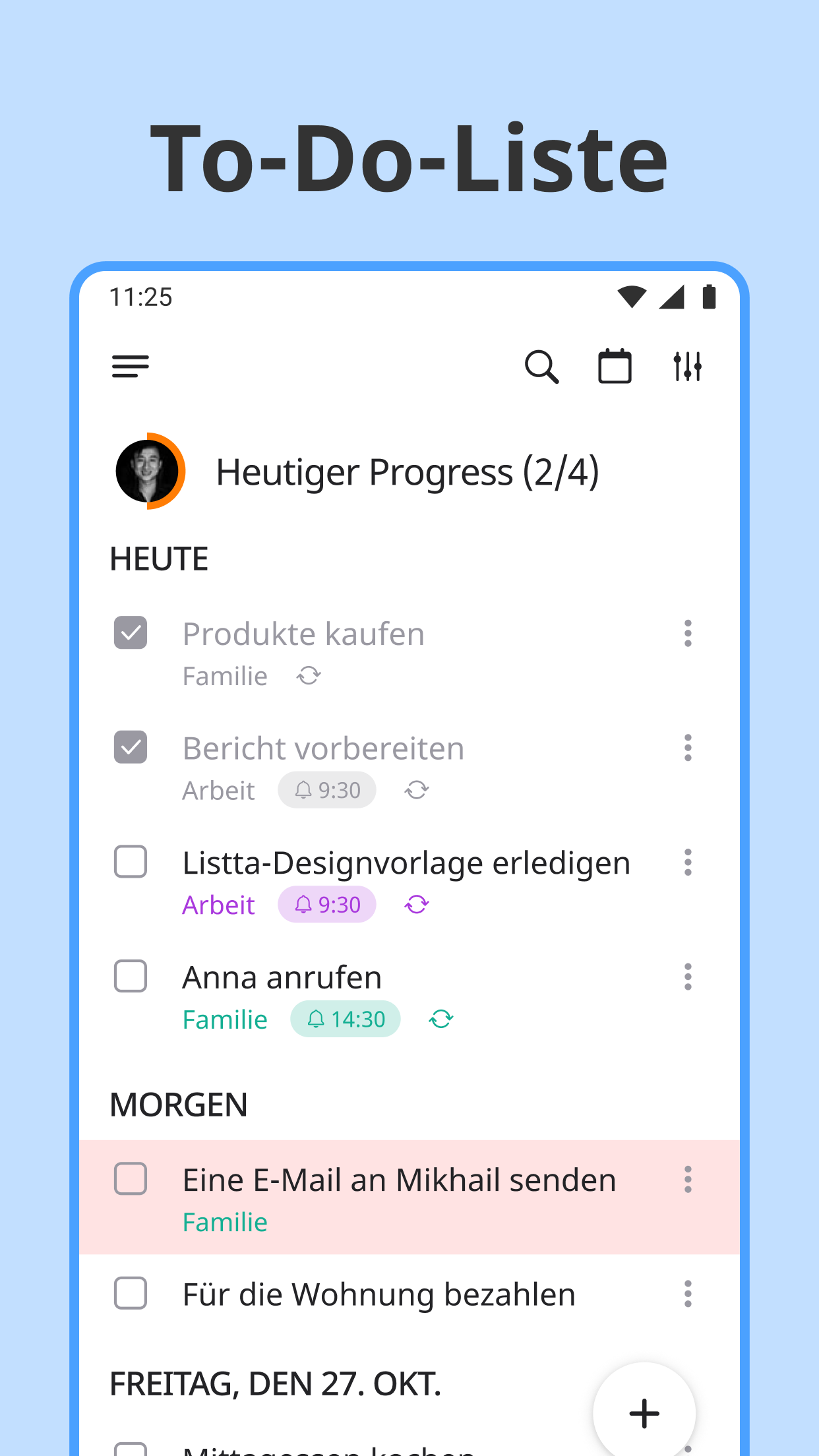 Praktischer Planer und einfach zu bedienender Aufgabenmanager. Erstellen Sie Aufgabenlisten, planen Sie Ihre Tage, verwalten Sie den Kalender, setzen Sie Erinnerungen und machen Sie Notizen. Verwalten Sie Ihre tägliche Agenda und steigern Sie Ihre Produktivität mit Listta!