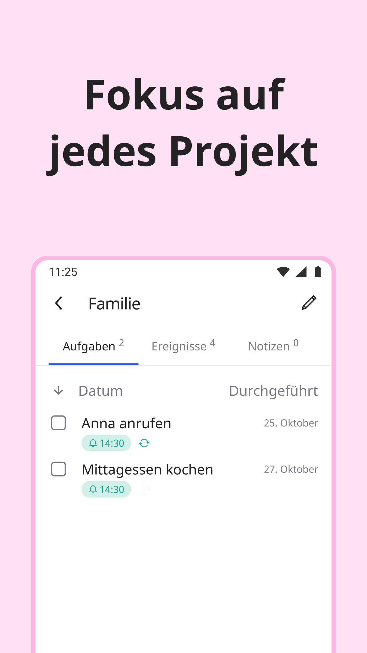 - Einfaches Anzeigen von Aufgaben, Ereignissen und Notizen, die mit einem bestimmten Projekt verbunden sind;