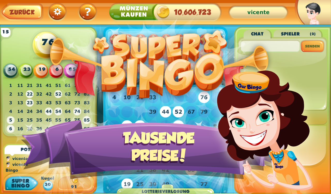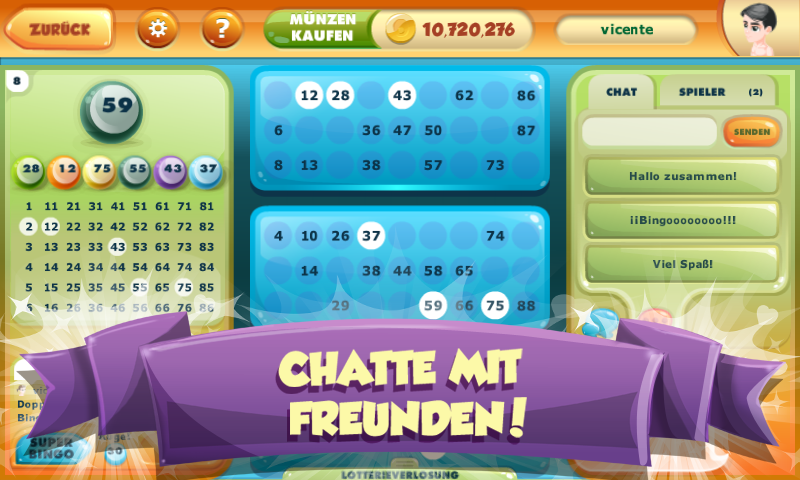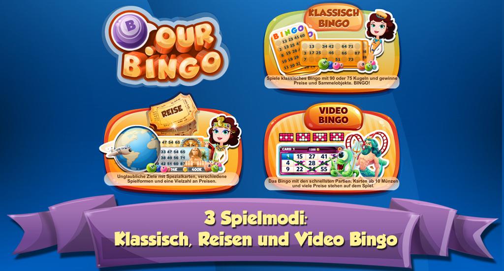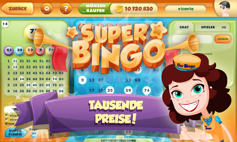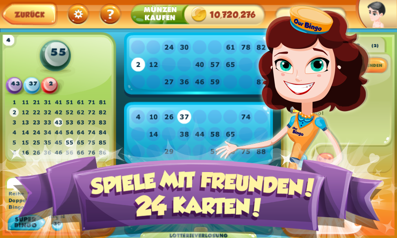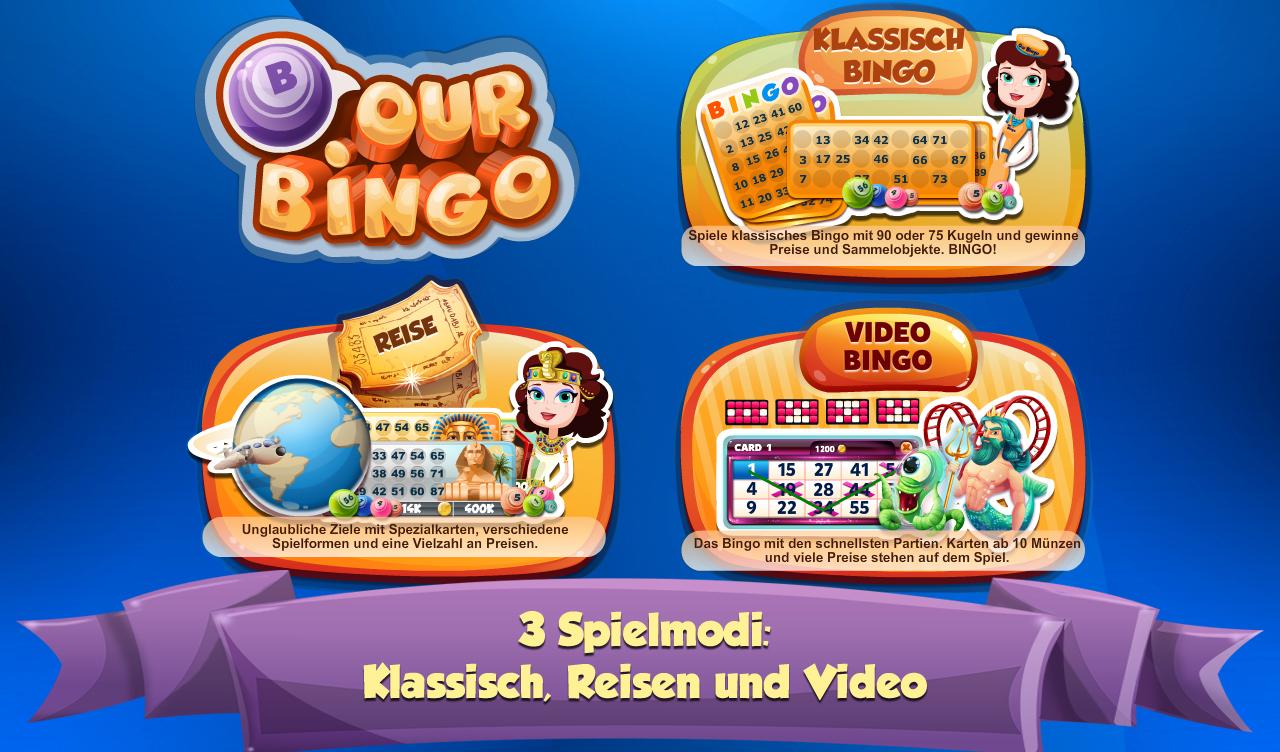 Du kannst schon von deinem Mobilgerät aus auf Our Bingo spielen und mit deinen Freunden Spaß bei Bingo haben! LADE das Spiel gratis HERUNTER und rufe von jedem Ort aus Bingo! Wenn Du neu bei Our.com bist, schenken wir Dir 5000 Münzen!! Genieße dieses Bingo-Vergnügen in Echtzeit und zusammen mit anderen Spielern auf der ganzen Welt. Wenn du Our Bingo schon auf Facebook oder im Internet gespielt hast, kannst du deine Münzen und deinen Fortschritt behalten, sowohl beim Spielen auf dem Mobilgerät als auch im Ordner. Version beinhaltet: -MULITPLAYER-Bingo in Echtzeit Spiele an jedem Ort der Welt mit deinen Freunden oder anderen Spielern in Echtzeit. -Wähle zwischen DREI SPIELMODI Du kannst zwischen klassischem Bingo mit 75 oder 90 Kugeln, dem Saal, in dem du Teile erwerben und viele Preise rufen kannst oder Video Bingos, schellen Partien mit Themensälen und Extra-Kugeln wählen. -CHAT Rede mit anderen Spieler in Echtzeit. Wenn du keine Lust zum Tippen hast, verwende die Stimmerkennung, um Nachrichten zu schicken. Man muss nur die Stimme an das Mobilgerät halten anstatt zu schreiben! -BONUS Wir schenken dir jeden Tag Münzen, damit du spielen kannst. -AUTOMATISCHE MARKIERUNG Mach dir keine Sorgen um das Ausstreichen der Nummern, Our Bingo erledigt das automatisch! -LOTTERIEAUSLOSUNG Nur durch Spielen hast du die Möglichkeit, an einer Lotterieverlosung teilzunehmen, bei der du tausende Münzen gewinnen kannst. -AUTOMATISCHER KAUF Kauf deine Karten für die folgenden Partien automatisch, und du sparst dir die Mühe, sie jedes Mal zu kaufen. -TEILE und VERÖFFENTLICHE DEINE PREISE AUF FACEBOOK Our Bingo ist mit den wichtigsten SOZIALEN NETZWERKEN wie Facebook und Twitter verbunden, über die du deine Leistungen teilen kannst. -SPRACHEN Du kannst zwischen sechs Sprachen wählen: Englisch, Spanisch, Französisch, Portugiesisch und Deutsch. -GEWINNE UND SAMMLUNGEN Hol dir Gewinne und vervollständige die verschiedenen unterhaltsamen Sammlungen, die wir Dir vorschlagen und die Du gegen Gratis-Münzen eintauschen kannst. Wir arbeiten weiter daran, dem Spiel neue Funktionen hinzuzufügen. Schon bald gibt es Neuigkeiten! Mindestanforderungen, um spielen zu können: 1. Internetverbindungen (Gescwindigkeit3G, WIFI empfohlen) 2. 1Gb RAM 3. 100 MBs zusätzlicher freier Speicherplatz auf der SD-Karte 4. Bildschirmauflösung mindestens 800x480 Pixel Folge uns auf unseren sozialen Netzwerken und halte dich so auf dem Laufenden über alle NEUIGKEITEN und MÜNZGESCHENKE: https://www.facebook.com/OurBingo/ https://twitter.com/our_com https://www.youtube.com/user/OurPerson Hast du Probleme? Besuche das Help Centre von Our.com: http://es.our.com/faq/