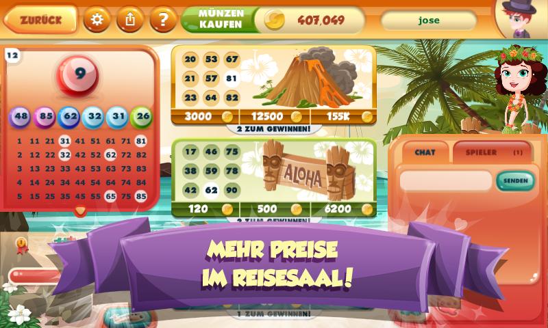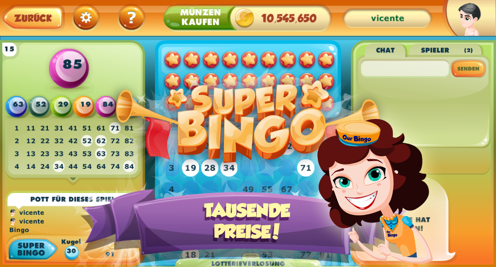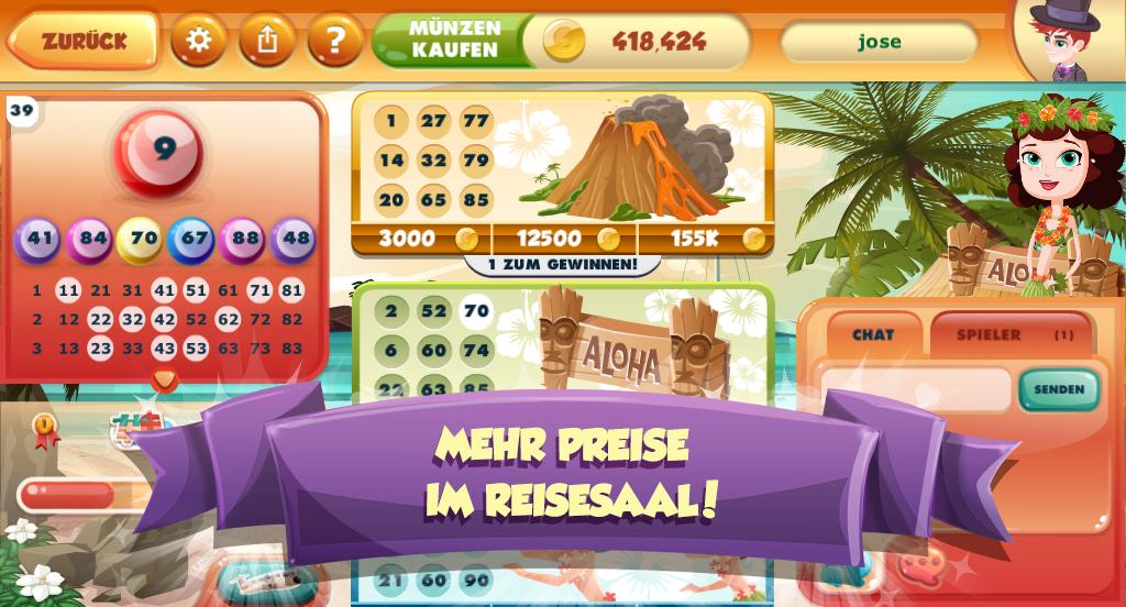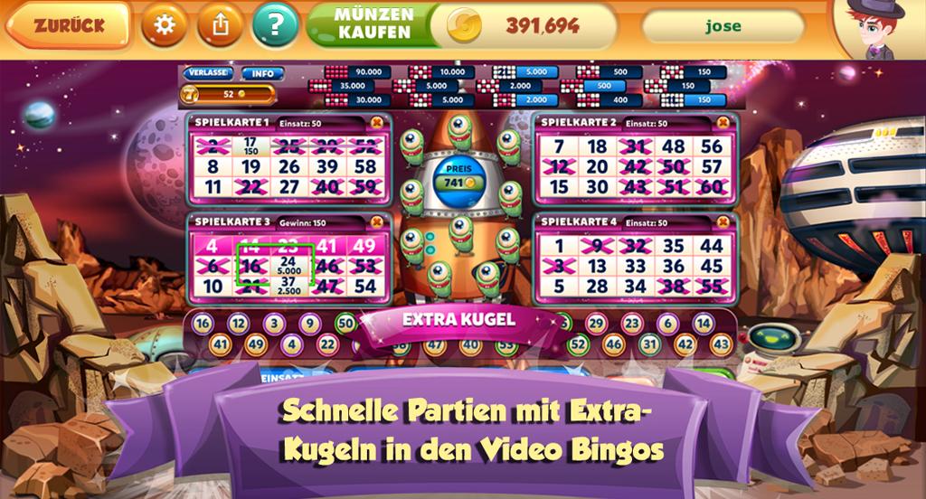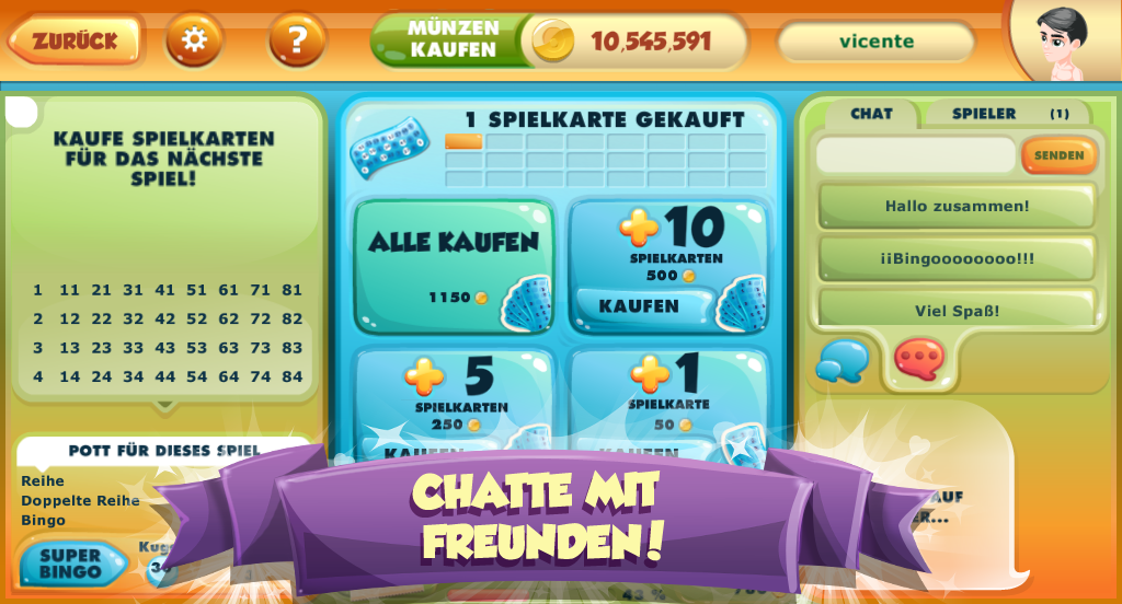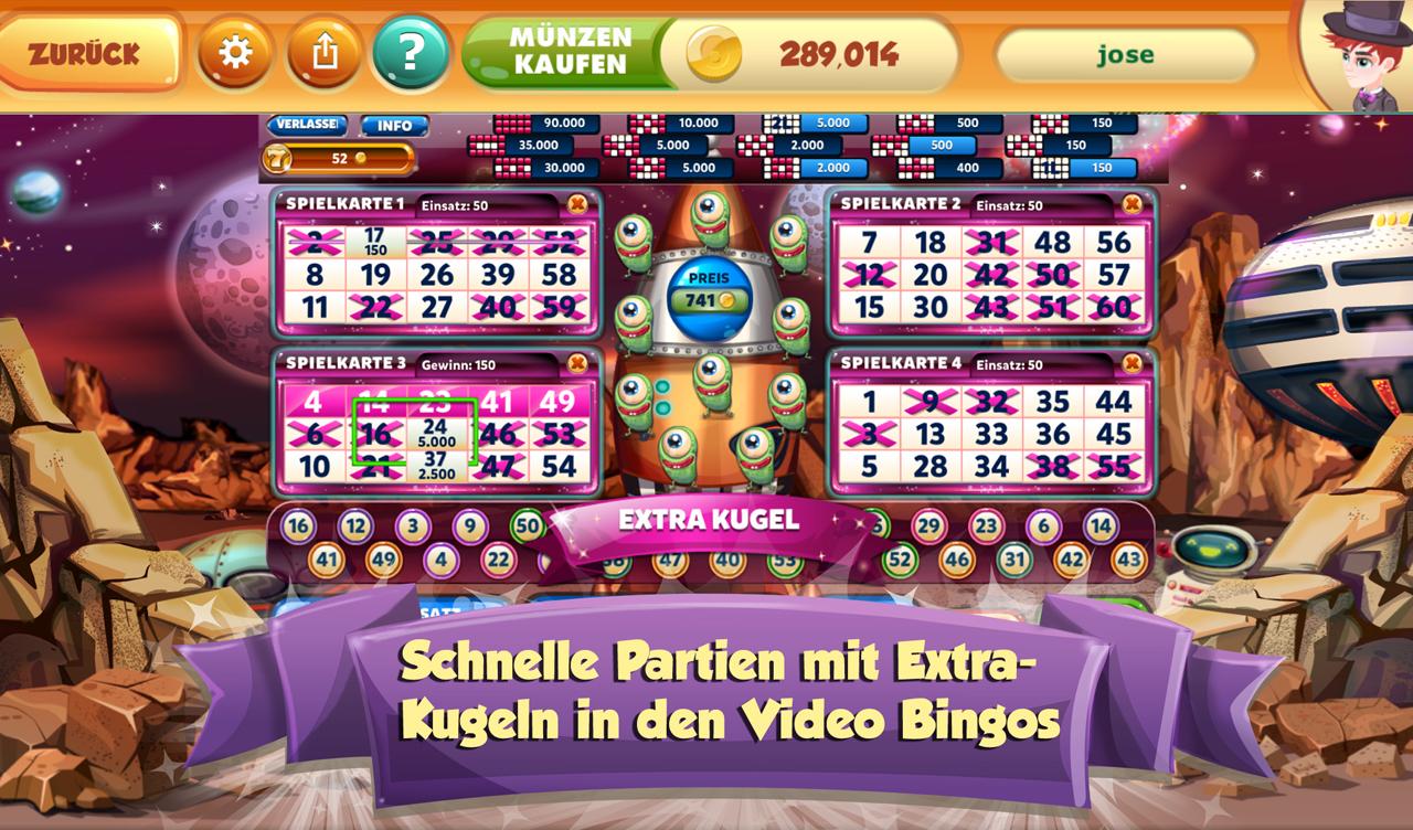 Du kannst schon von deinem Mobilgerät aus auf Our Bingo spielen und mit deinen Freunden Spaß bei Bingo haben! LADE das Spiel gratis HERUNTER und rufe von jedem Ort aus Bingo! Wenn Du neu bei Our.com bist, schenken wir Dir 5000 Münzen!! Genieße dieses Bingo-Vergnügen in Echtzeit und zusammen mit anderen Spielern auf der ganzen Welt. Wenn du Our Bingo schon auf Facebook oder im Internet gespielt hast, kannst du deine Münzen und deinen Fortschritt behalten, sowohl beim Spielen auf dem Mobilgerät als auch im Ordner. Version beinhaltet: -MULITPLAYER-Bingo in Echtzeit Spiele an jedem Ort der Welt mit deinen Freunden oder anderen Spielern in Echtzeit. -Wähle zwischen DREI SPIELMODI Du kannst zwischen klassischem Bingo mit 75 oder 90 Kugeln, dem Saal, in dem du Teile erwerben und viele Preise rufen kannst oder Video Bingos, schellen Partien mit Themensälen und Extra-Kugeln wählen. -CHAT Rede mit anderen Spieler in Echtzeit. Wenn du keine Lust zum Tippen hast, verwende die Stimmerkennung, um Nachrichten zu schicken. Man muss nur die Stimme an das Mobilgerät halten anstatt zu schreiben! -BONUS Wir schenken dir jeden Tag Münzen, damit du spielen kannst. -AUTOMATISCHE MARKIERUNG Mach dir keine Sorgen um das Ausstreichen der Nummern, Our Bingo erledigt das automatisch! -LOTTERIEAUSLOSUNG Nur durch Spielen hast du die Möglichkeit, an einer Lotterieverlosung teilzunehmen, bei der du tausende Münzen gewinnen kannst. -AUTOMATISCHER KAUF Kauf deine Karten für die folgenden Partien automatisch, und du sparst dir die Mühe, sie jedes Mal zu kaufen. -TEILE und VERÖFFENTLICHE DEINE PREISE AUF FACEBOOK Our Bingo ist mit den wichtigsten SOZIALEN NETZWERKEN wie Facebook und Twitter verbunden, über die du deine Leistungen teilen kannst. -SPRACHEN Du kannst zwischen sechs Sprachen wählen: Englisch, Spanisch, Französisch, Portugiesisch und Deutsch. -GEWINNE UND SAMMLUNGEN Hol dir Gewinne und vervollständige die verschiedenen unterhaltsamen Sammlungen, die wir Dir vorschlagen und die Du gegen Gratis-Münzen eintauschen kannst. Wir arbeiten weiter daran, dem Spiel neue Funktionen hinzuzufügen. Schon bald gibt es Neuigkeiten! Mindestanforderungen, um spielen zu können: 1. Internetverbindungen (Gescwindigkeit3G, WIFI empfohlen) 2. 1Gb RAM 3. 100 MBs zusätzlicher freier Speicherplatz auf der SD-Karte 4. Bildschirmauflösung mindestens 800x480 Pixel Folge uns auf unseren sozialen Netzwerken und halte dich so auf dem Laufenden über alle NEUIGKEITEN und MÜNZGESCHENKE: https://www.facebook.com/OurBingo/ https://twitter.com/our_com https://www.youtube.com/user/OurPerson Hast du Probleme? Besuche das Help Centre von Our.com: http://es.our.com/faq/
