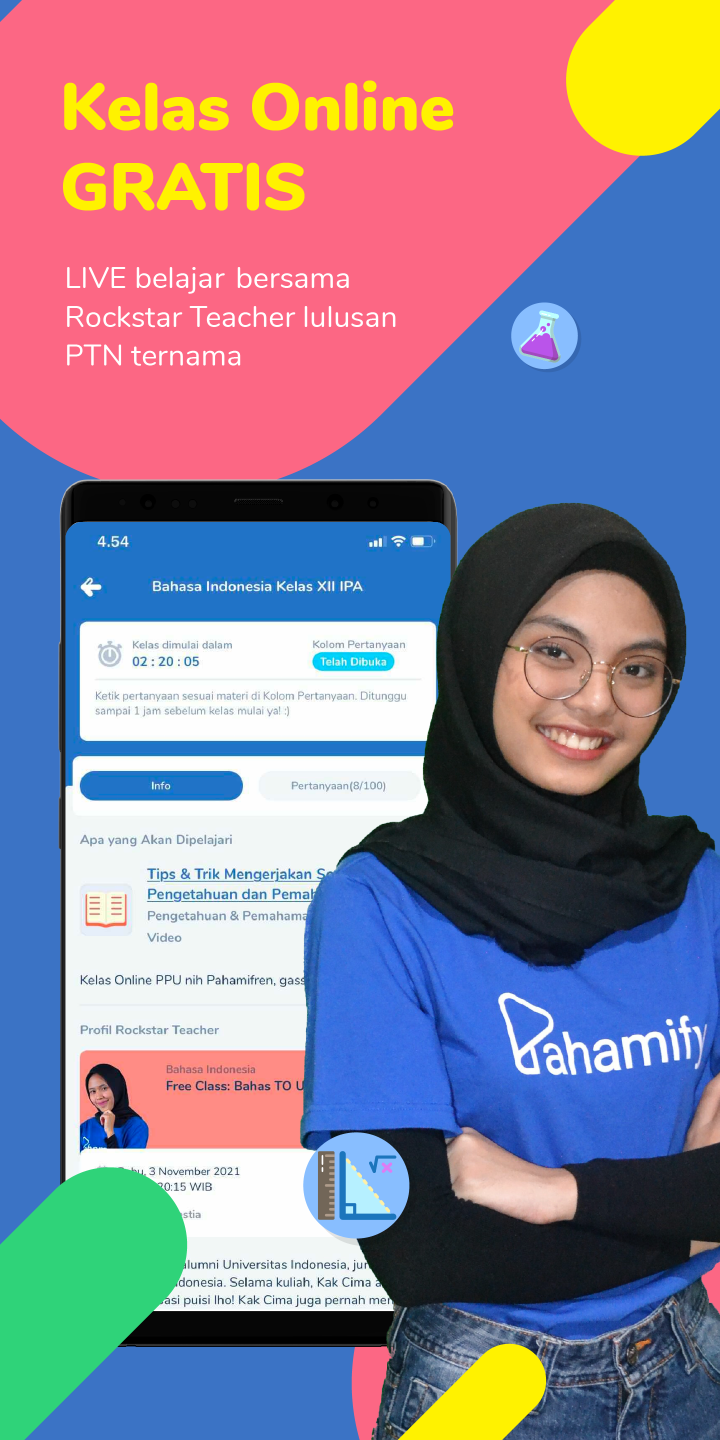 Pahamify hilft Ihnen bei der Wahl Ihres Hauptfachs, beim Lernen von Konzepten, beim Üben adaptiver Fragen, beim Live-Lernen mit Rockstar-Lehrern bis hin zu routinemäßigen UTBK-Simulationsversuchen jeden Monat.