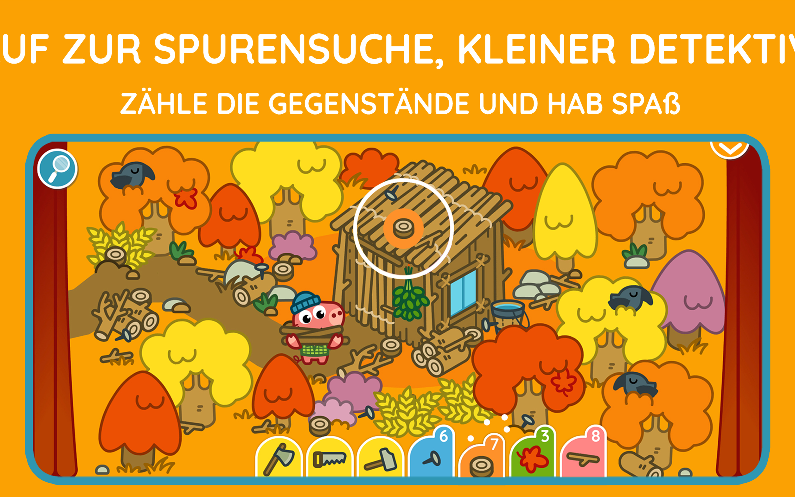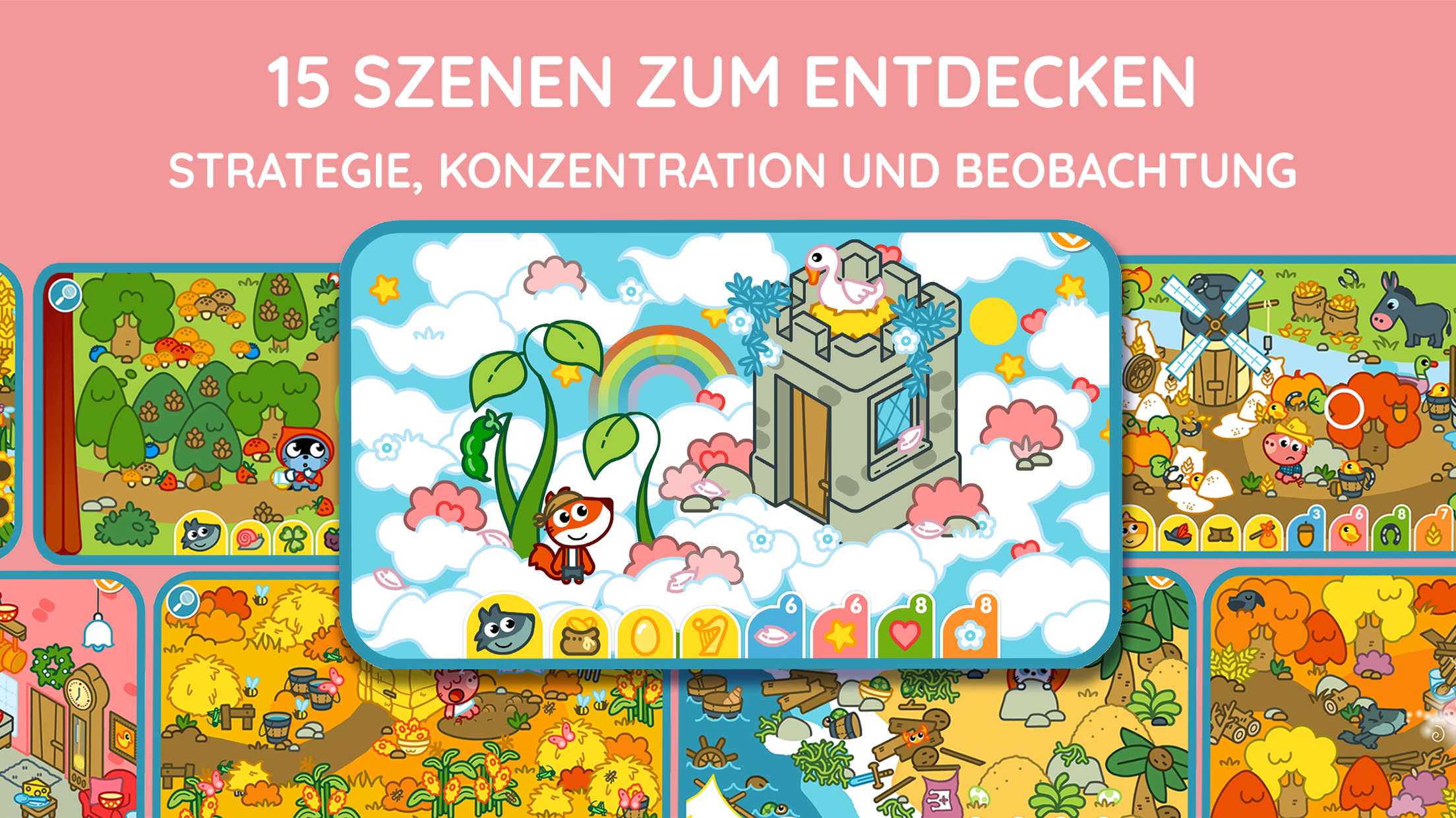 Erkunden und durchstöbern Sie die Bilder mit den Fingerspitzen. Hinter Felsen, unter Tischen, in den Bäumen… Öffnen, anheben, beiseiteschieben… überall gibt es Verstecke! Wenn etwas schwer zu finden ist, hilft die Lupe! Ein einfaches, motivierendes und beruhigendes Gameplay, entwickelt für Kinder von 3 bis 5 Jahren.