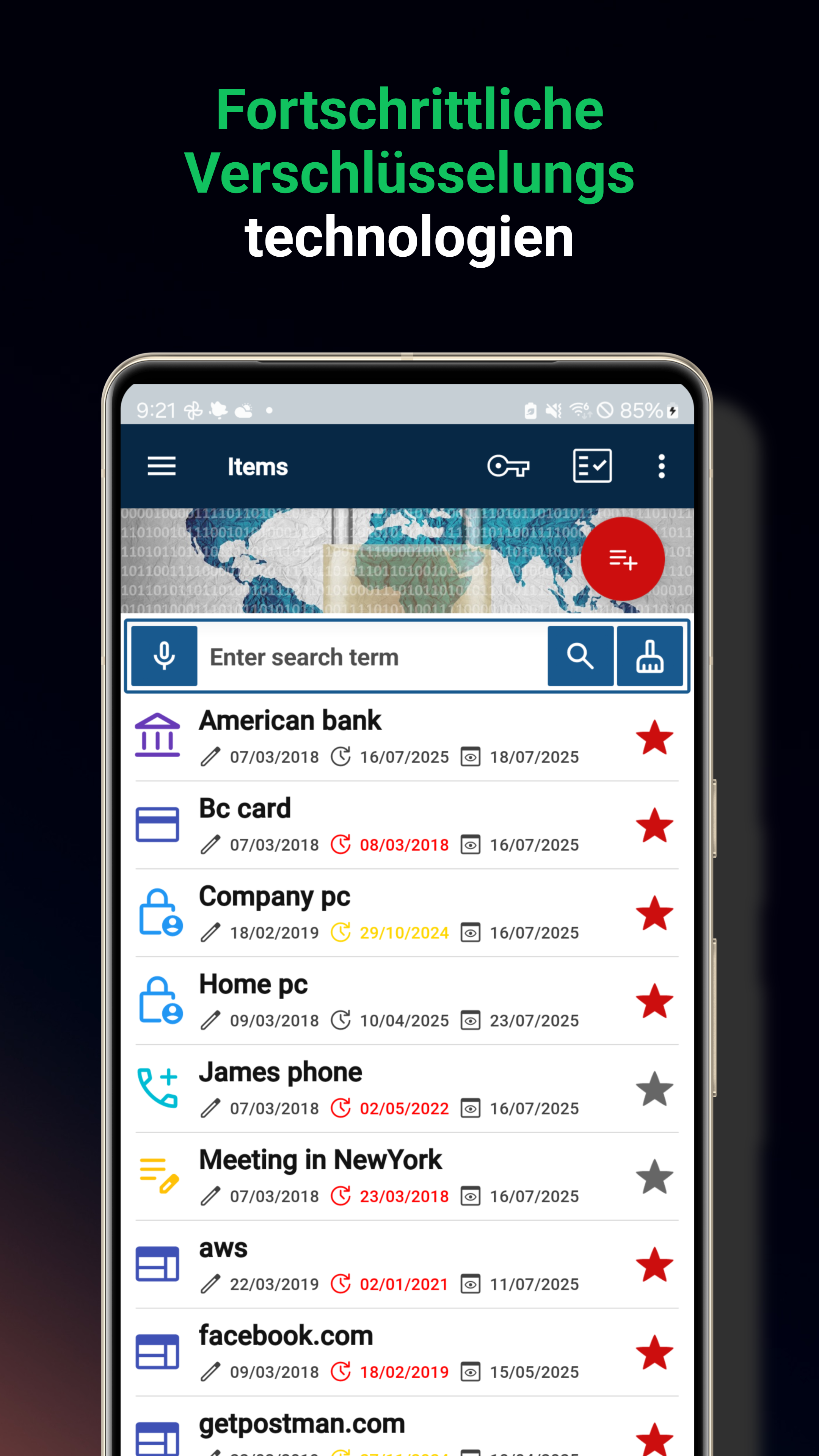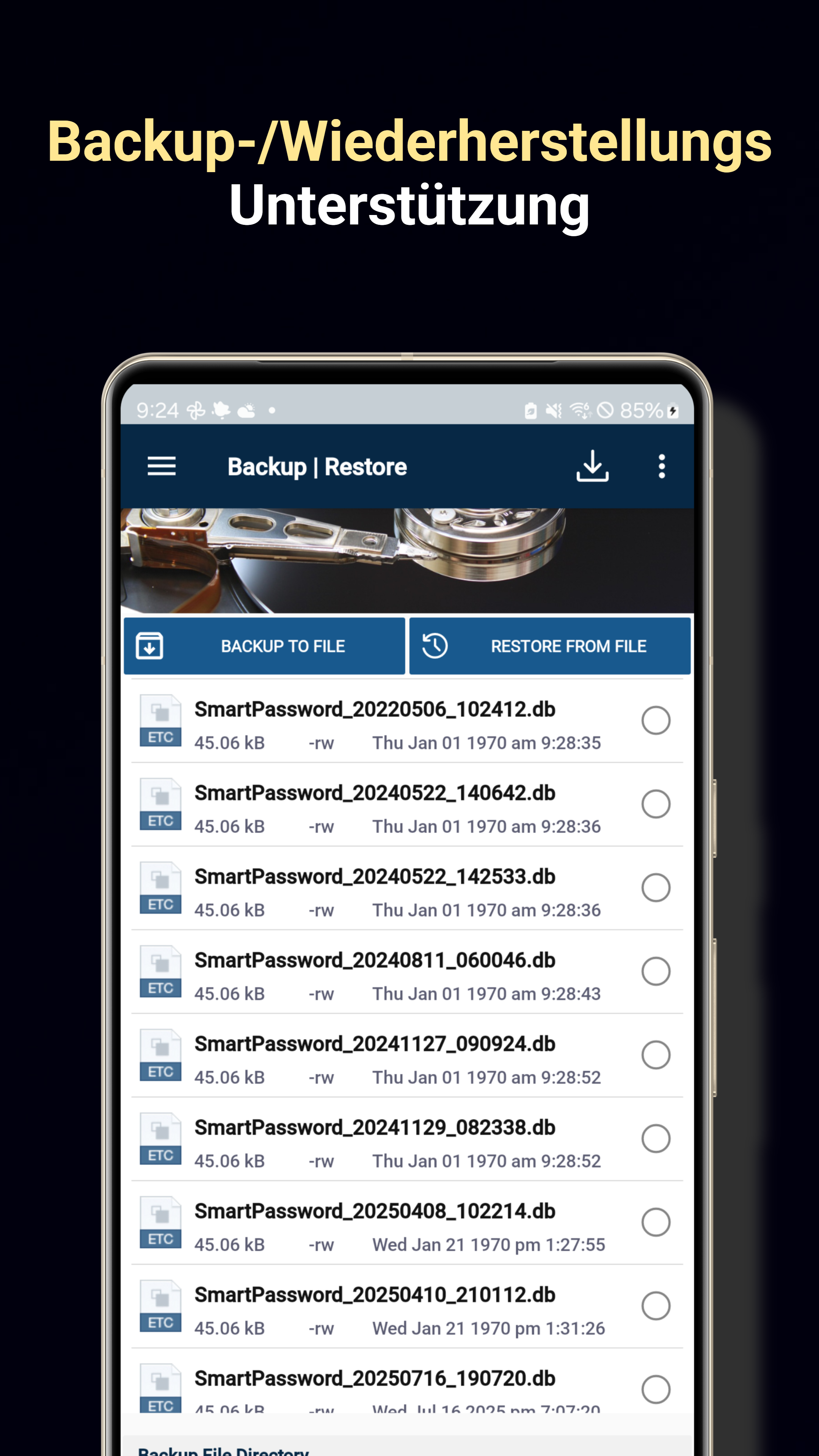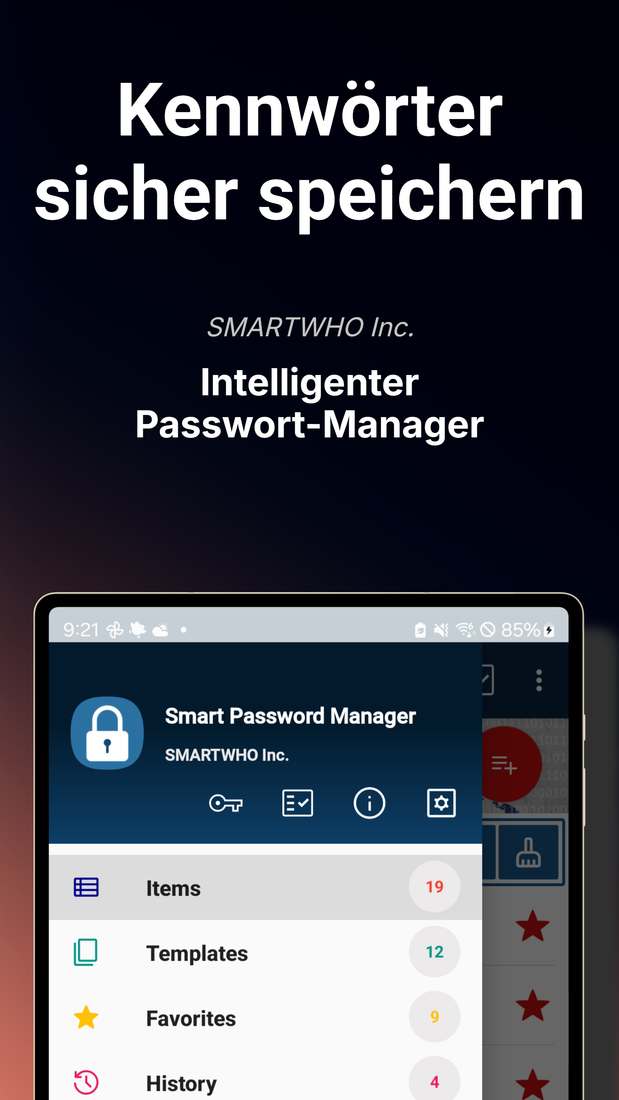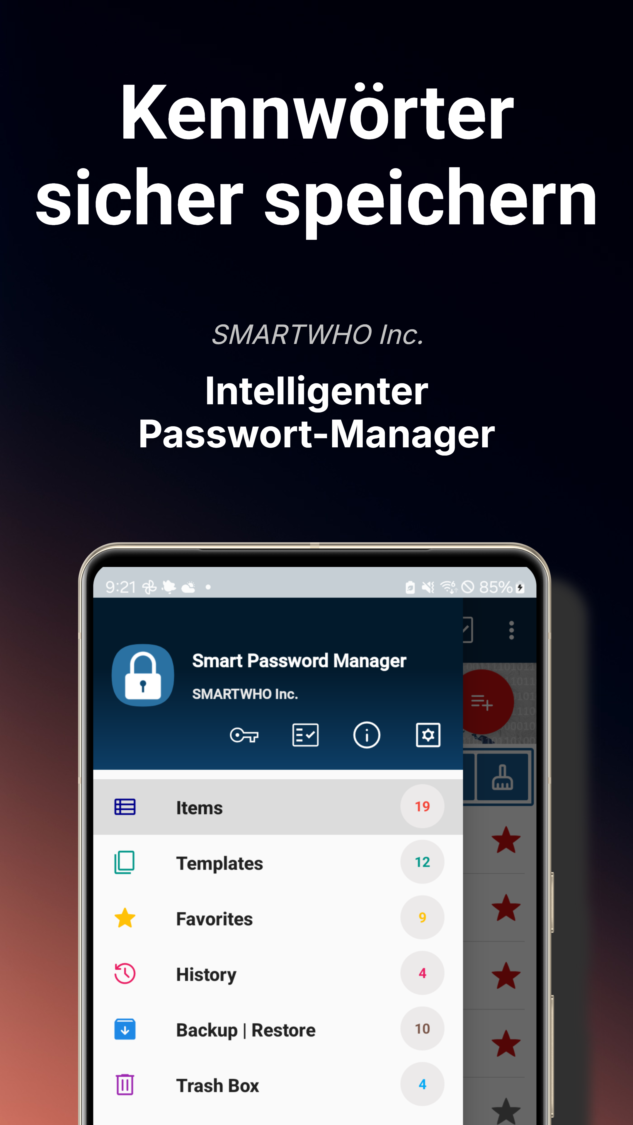 ■ Smart Password Manager – Einführung Verwalten Sie Ihre wertvollen Daten sicher – mit Smart Password Manager Keine Sorgen mehr über vergessene Passwörter oder Sicherheitsbedenken. Smart Password Manager ist ein leistungsstarkes Tool, das Ihre sensiblen Daten sicher und effizient schützt und organisiert. ■ Warum Smart Password Manager so herausragend ist 1. Höchste Sicherheit – Nutzt modernste Verschlüsselungstechnologien für umfassenden Schutz Ihrer Daten. – Vollständig von externen Netzwerken getrennt, um unbefugten Zugriff zu verhindern. 2. Umfassender Datenschutz – Alle Daten werden ausschließlich auf Ihrem Smartphone gespeichert und niemals an externe Server übertragen. – Nur der Benutzer kennt das Master-Passwort; einmal verloren, kann es nicht wiederhergestellt werden. – Regelmäßige Backup-Funktionen verhindern Datenverlust. 3. Intuitive Benutzererfahrung – Einfaches Hinzufügen von Informationen mithilfe einfacher und anpassbarer Vorlagen. – Finden Sie schnell, was Sie brauchen – mit Kategorien, Favoriten und Suchfunktionen. – Unterstützt sichere und bequeme Anmeldung durch biometrische Authentifizierung. ■ Hauptfunktionen - Vorlagenverwaltung: Verwalten Sie verschiedene Kategorien wie Websites, E-Mails, Banken, Kreditkarten, Reisepässe und Versicherungen. - Passwortgenerator: Erstellen Sie automatisch sichere, schwer zu erratende Passwörter. - Passwortstärkeanalyse: Analysieren Sie die Stärke Ihrer aktuellen Passwörter und erkennen Sie Schwachstellen. - Sichern und Wiederherstellen: Schützen Sie Ihre Daten mit automatischen und manuellen Backups und stellen Sie sie bei Bedarf wieder her. - Papierkorb: Speichern Sie gelöschte Einträge vorübergehend und stellen Sie sie bei Bedarf wieder her. - Favoriten: Markieren Sie häufig verwendete Elemente schnell als Favoriten. - Nutzungsverlauf: Behalten Sie Ihre Datennutzung und -aktivität im Blick. ■ Vorlagenbeispiele - Websites: URL, Benutzername, Passwort. - Persönliche Daten: Name, Geburtsdatum, Ausweisnummer. - Finanzinformationen: Kreditkartennummer, CVV, Bankverbindung, SWIFT- und IBAN-Codes. - Dokumente/Lizenzen: Führerschein, Reisepass, Softwarelizenzen. - Erweiterte Notizen: Fügen Sie benutzerdefinierte Notizen hinzu, um detaillierte Informationen zu speichern. [Jetzt starten] Erleben Sie eine Intelligenter und sicherer Umgang mit Ihren Daten mit dem Smart Password Manager. Schluss mit dem Ärger über vergessene Zugangsdaten – schützen Sie Ihr digitales Leben mit Zuversicht.