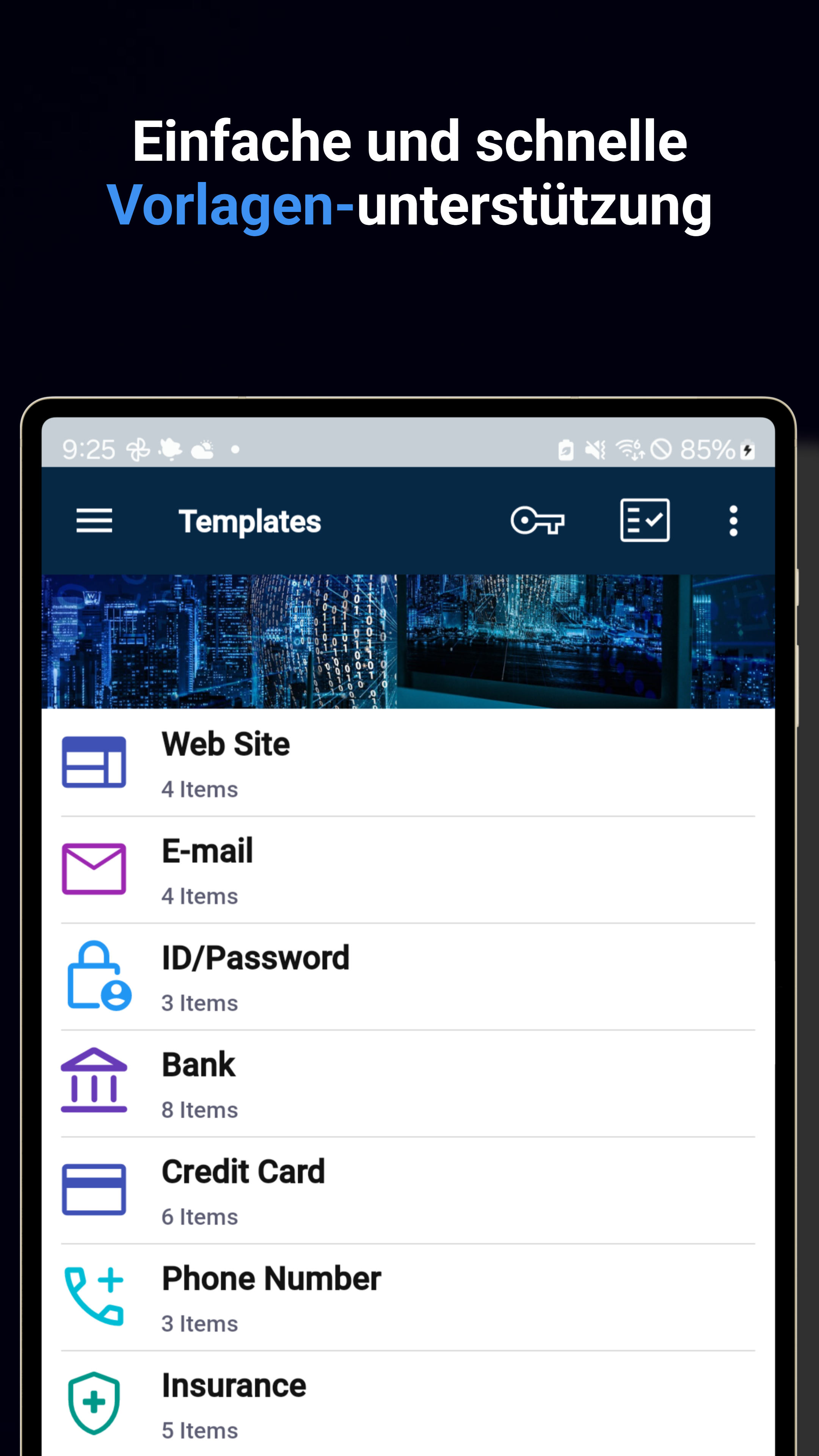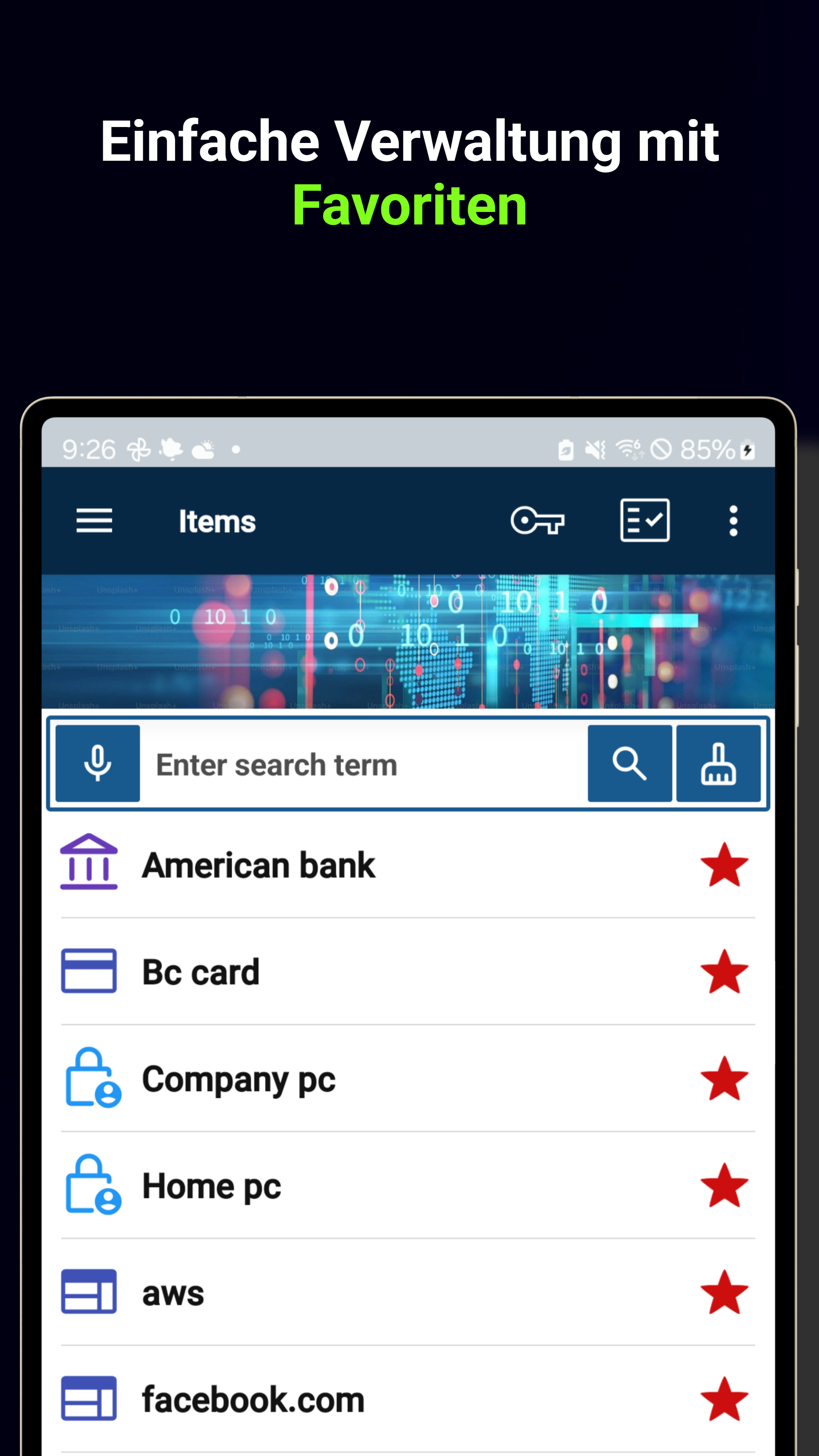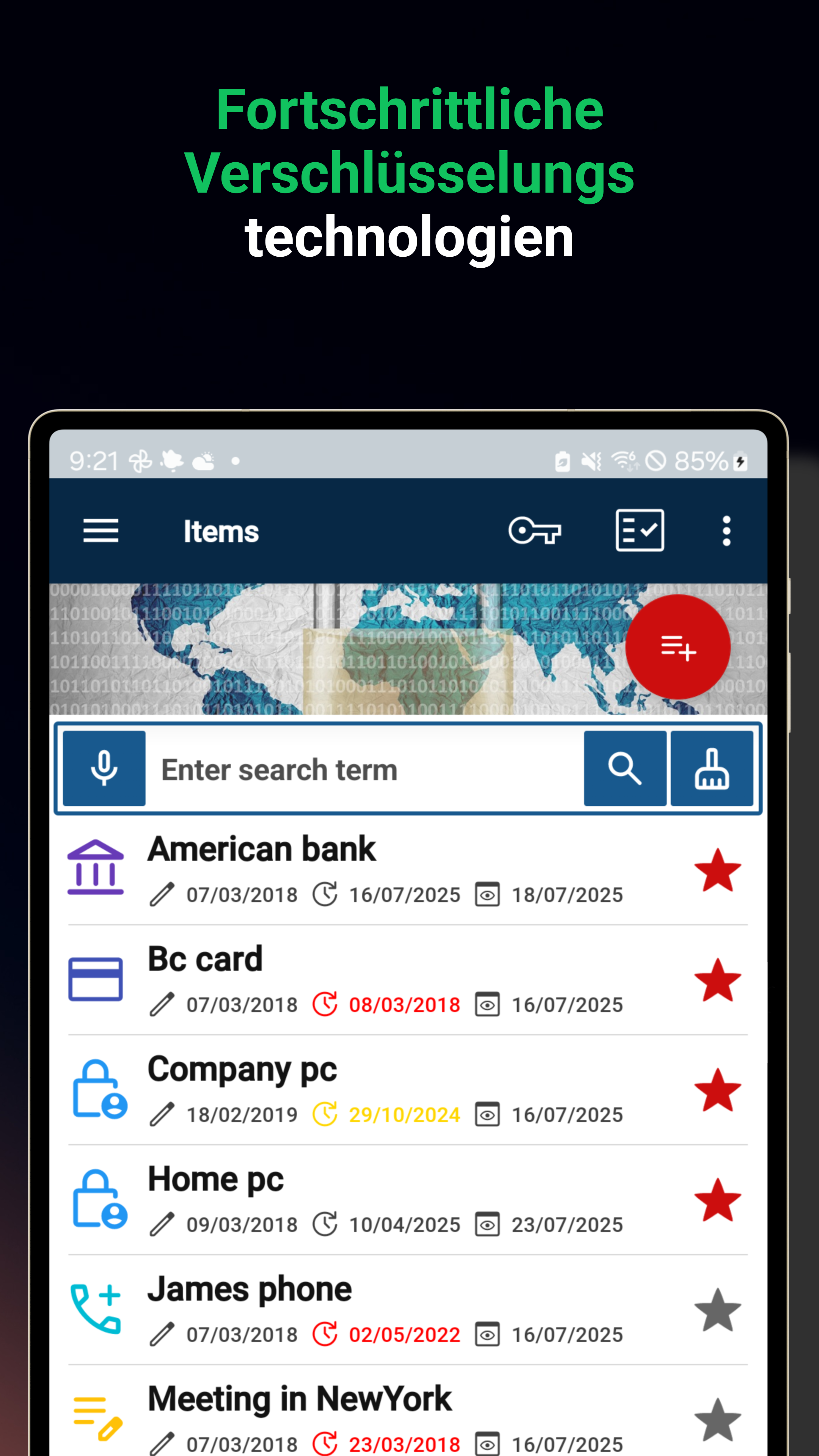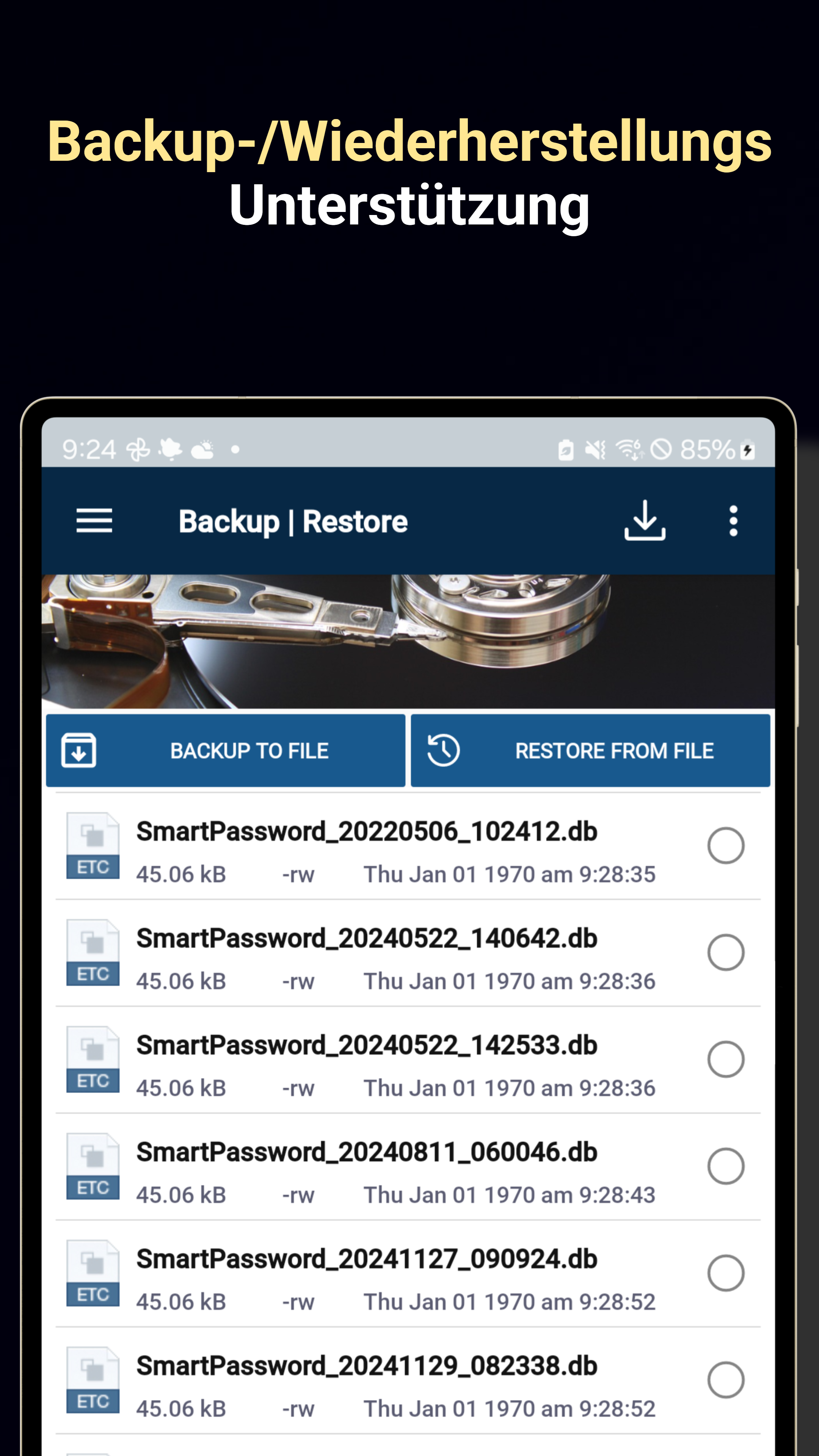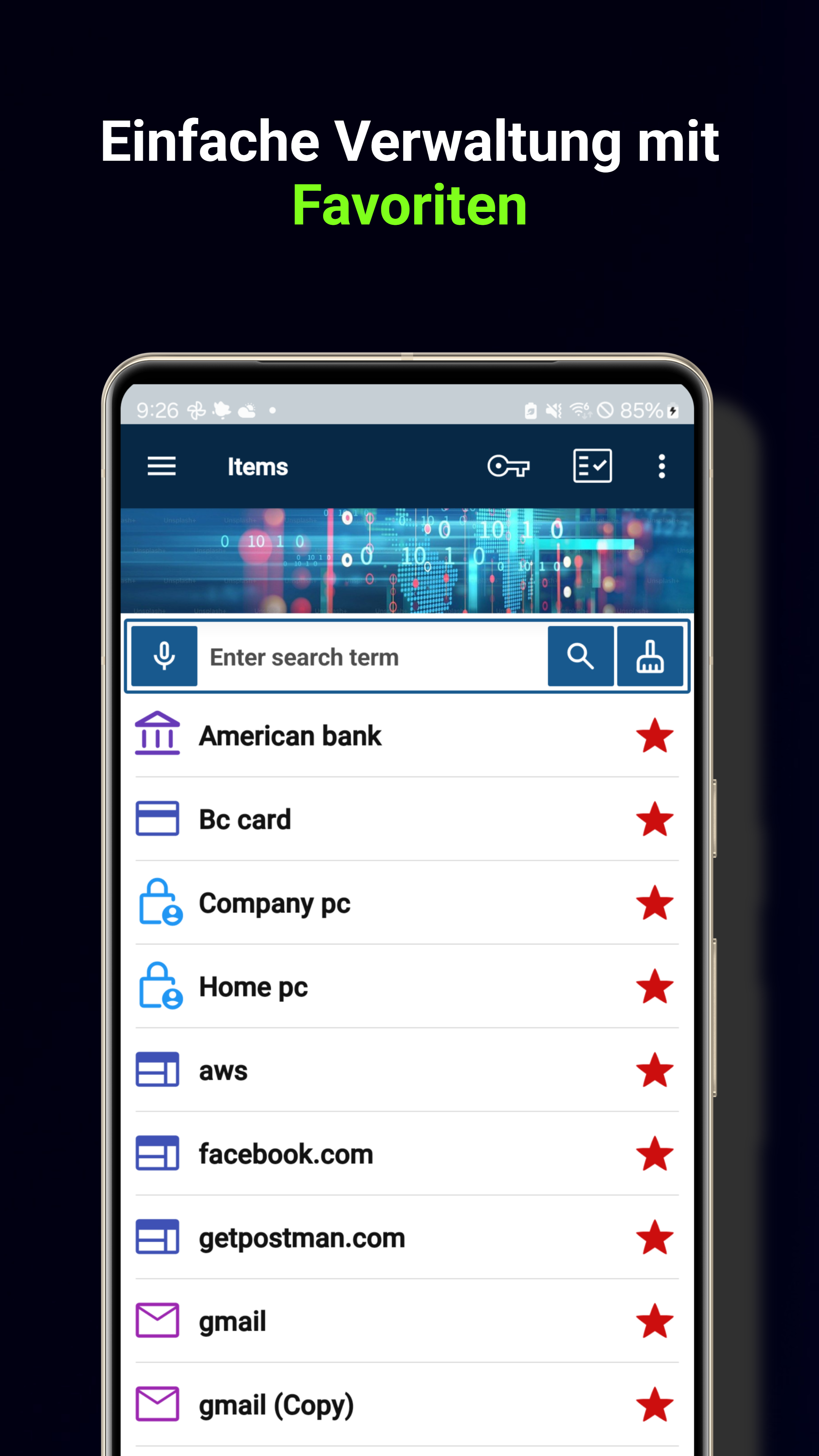 ■ Smart Password Manager – Einführung Verwalten Sie Ihre wertvollen Daten sicher – mit Smart Password Manager Keine Sorgen mehr über vergessene Passwörter oder Sicherheitsbedenken. Smart Password Manager ist ein leistungsstarkes Tool, das Ihre sensiblen Daten sicher und effizient schützt und organisiert. ■ Warum Smart Password Manager so herausragend ist 1. Höchste Sicherheit – Nutzt modernste Verschlüsselungstechnologien für umfassenden Schutz Ihrer Daten. – Vollständig von externen Netzwerken getrennt, um unbefugten Zugriff zu verhindern. 2. Umfassender Datenschutz – Alle Daten werden ausschließlich auf Ihrem Smartphone gespeichert und niemals an externe Server übertragen. – Nur der Benutzer kennt das Master-Passwort; einmal verloren, kann es nicht wiederhergestellt werden. – Regelmäßige Backup-Funktionen verhindern Datenverlust. 3. Intuitive Benutzererfahrung – Einfaches Hinzufügen von Informationen mithilfe einfacher und anpassbarer Vorlagen. – Finden Sie schnell, was Sie brauchen – mit Kategorien, Favoriten und Suchfunktionen. – Unterstützt sichere und bequeme Anmeldung durch biometrische Authentifizierung. ■ Hauptfunktionen - Vorlagenverwaltung: Verwalten Sie verschiedene Kategorien wie Websites, E-Mails, Banken, Kreditkarten, Reisepässe und Versicherungen. - Passwortgenerator: Erstellen Sie automatisch sichere, schwer zu erratende Passwörter. - Passwortstärkeanalyse: Analysieren Sie die Stärke Ihrer aktuellen Passwörter und erkennen Sie Schwachstellen. - Sichern und Wiederherstellen: Schützen Sie Ihre Daten mit automatischen und manuellen Backups und stellen Sie sie bei Bedarf wieder her. - Papierkorb: Speichern Sie gelöschte Einträge vorübergehend und stellen Sie sie bei Bedarf wieder her. - Favoriten: Markieren Sie häufig verwendete Elemente schnell als Favoriten. - Nutzungsverlauf: Behalten Sie Ihre Datennutzung und -aktivität im Blick. ■ Vorlagenbeispiele - Websites: URL, Benutzername, Passwort. - Persönliche Daten: Name, Geburtsdatum, Ausweisnummer. - Finanzinformationen: Kreditkartennummer, CVV, Bankverbindung, SWIFT- und IBAN-Codes. - Dokumente/Lizenzen: Führerschein, Reisepass, Softwarelizenzen. - Erweiterte Notizen: Fügen Sie benutzerdefinierte Notizen hinzu, um detaillierte Informationen zu speichern. [Jetzt starten] Erleben Sie eine Intelligenter und sicherer Umgang mit Ihren Daten mit dem Smart Password Manager. Schluss mit dem Ärger über vergessene Zugangsdaten – schützen Sie Ihr digitales Leben mit Zuversicht.