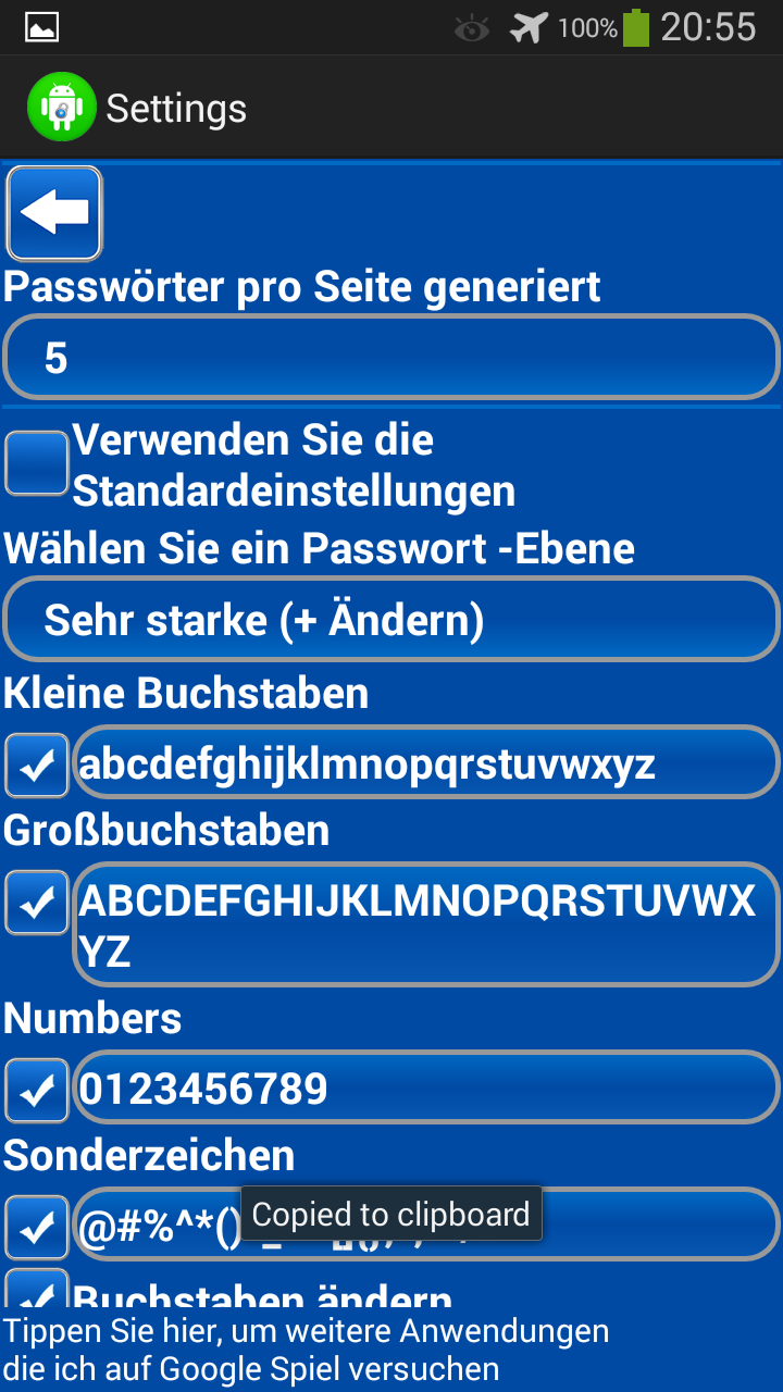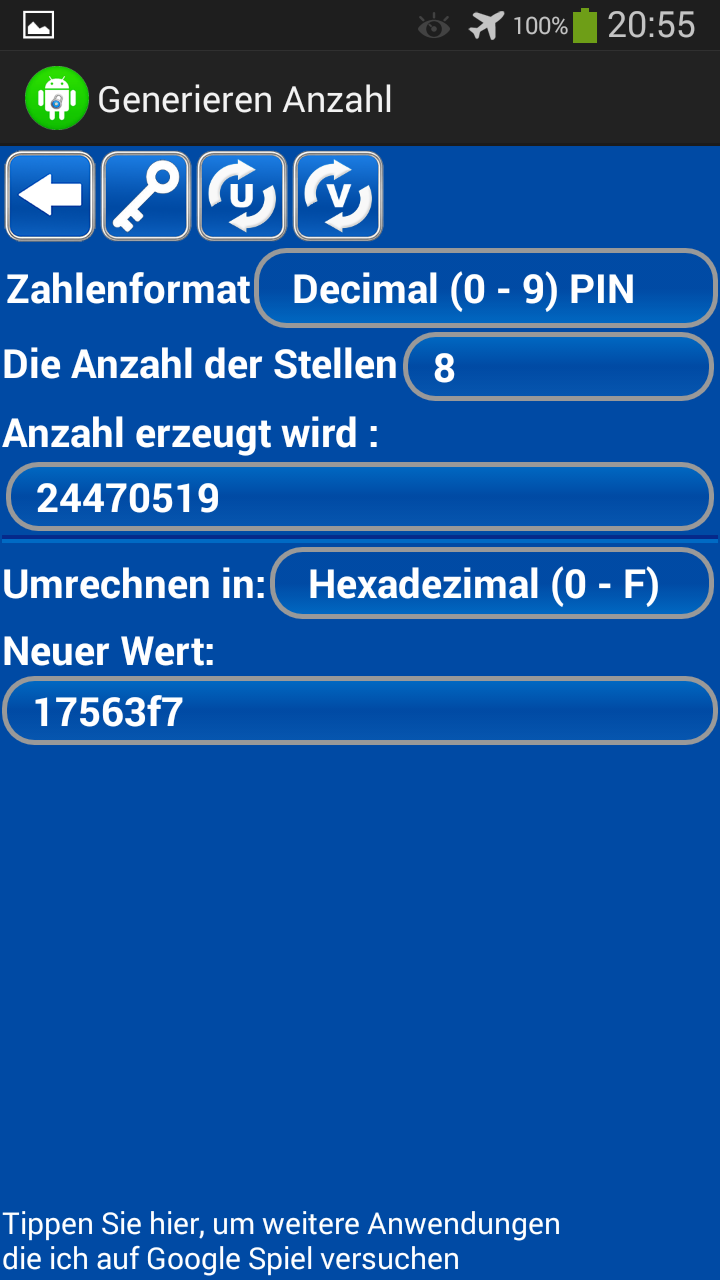 Diese anwendung generiert passwörter und zahlen. Sie können Ihre WiFi passwörter mit Ihrem Handy oder andere konten zu generieren. Sie können passwort-länge oder zahl erzeugt. Mit dieser anwendung können sie generieren zahlen in verschiedene formate (binär, oktal, dezimal oder hexadezimal). Wenn sie fragen haben oder möchten etwas neues auf diese anwendung hinzuzufügen haben, senden sie bitte eine e-Mail