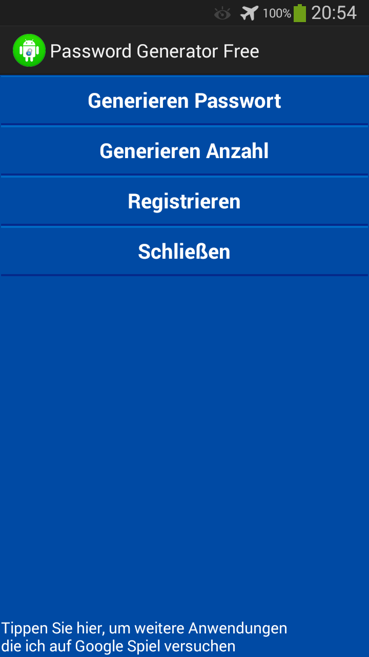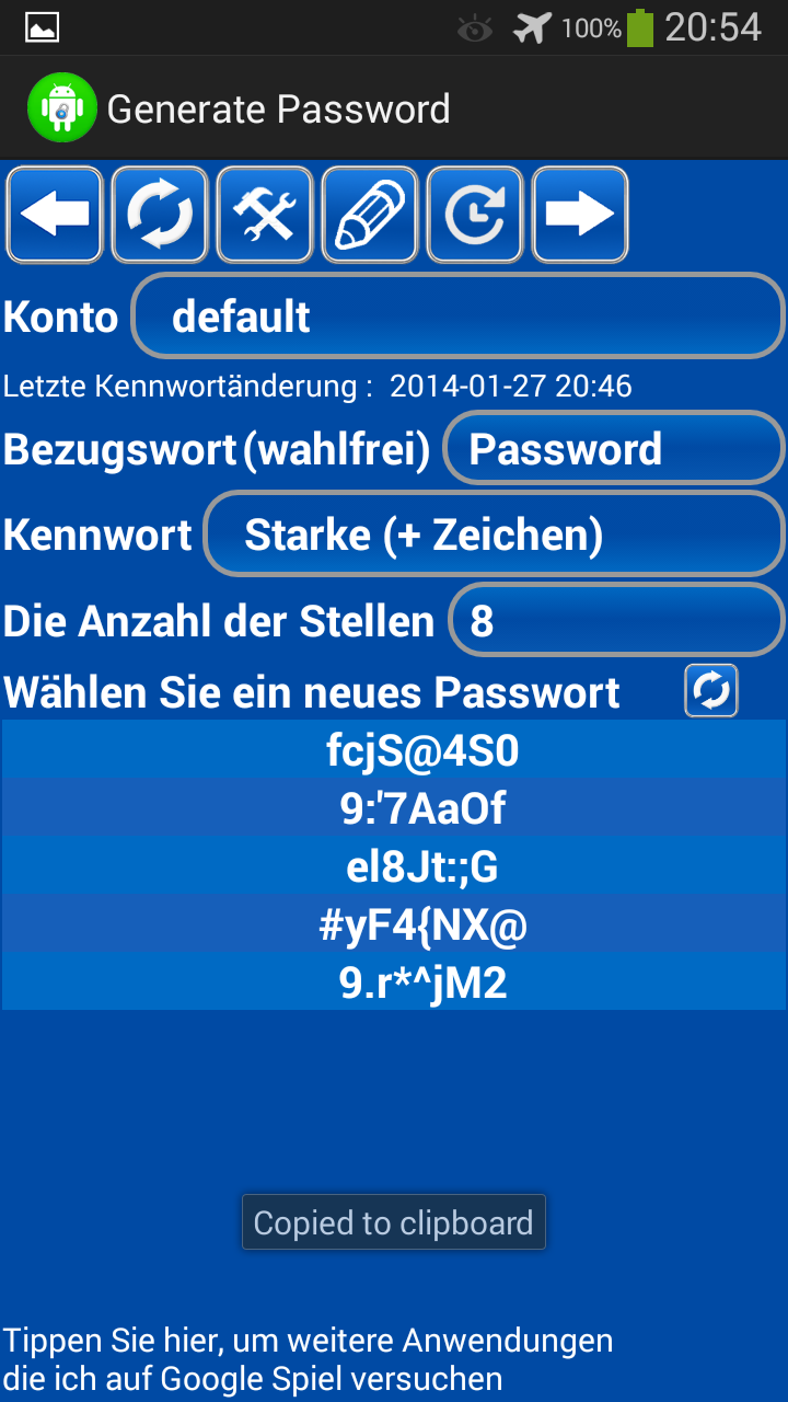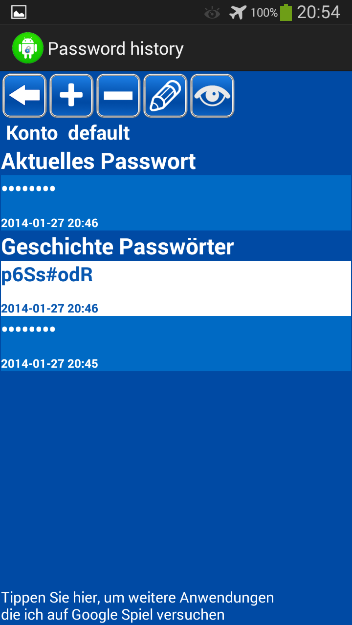 Passwörter Generator Freie (Paketname: com.logan19gp.pswgenfree) wird von GEORGE entwickelt und die neueste Version von Passwörter Generator Freie 2.45 wurde am 2. März 2014 aktualisiert. Passwörter Generator Freie liegt in der Kategorie von Tools. Sie können alle Apps von dem Entwickler der Passwörter Generator Freie durchsuchen und 6 alternative Apps zu Passwörter Generator Freie auf Android finden. Derzeit ist diese APP kostenlos. Diese App kann auf Android 1.5+ auf APKFab oder Google Play heruntergeladen werden. Alle APK/XAPK Dateien auf APKFab.com sind original und 100% sicher, schnell herunterzuladen.