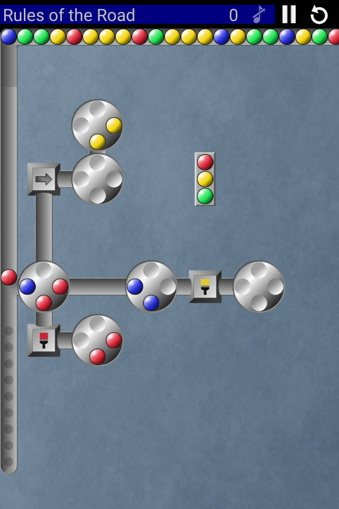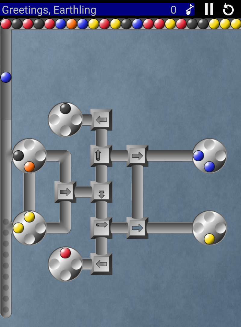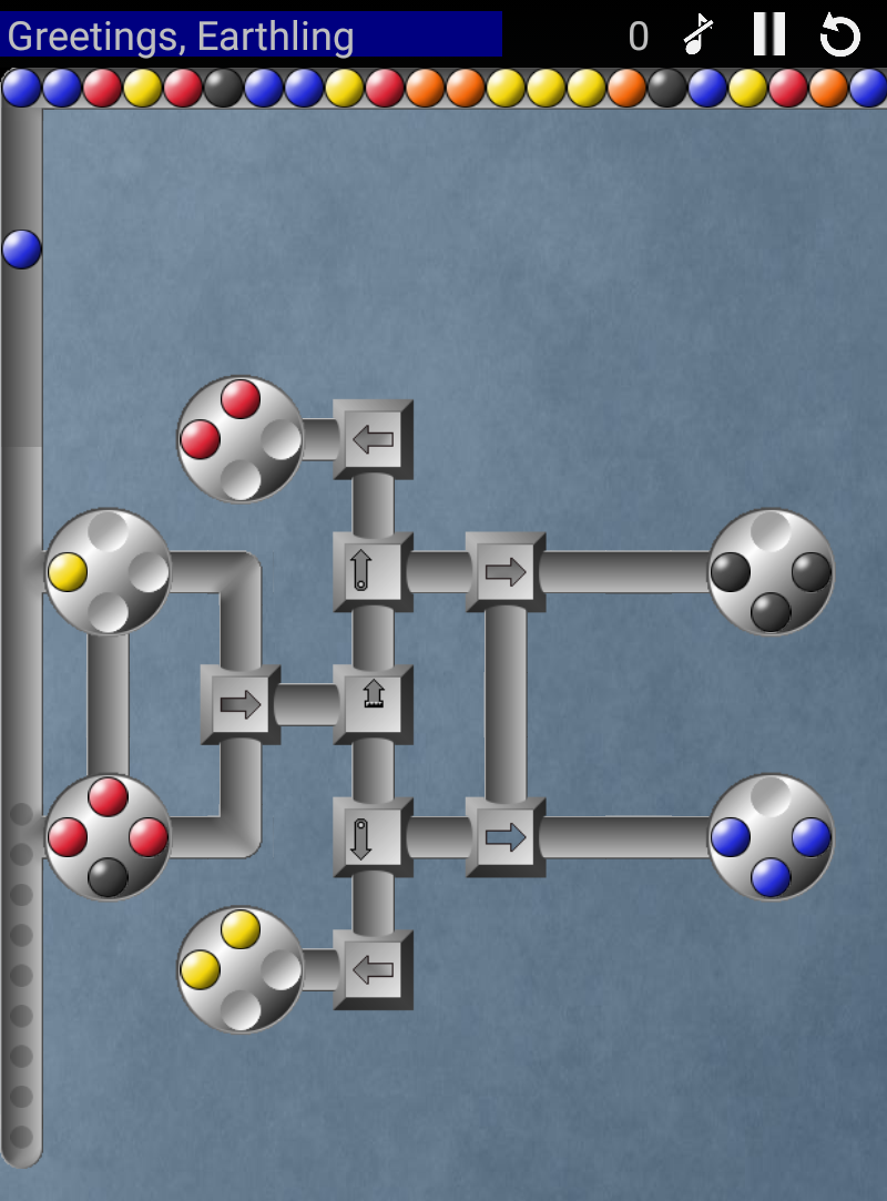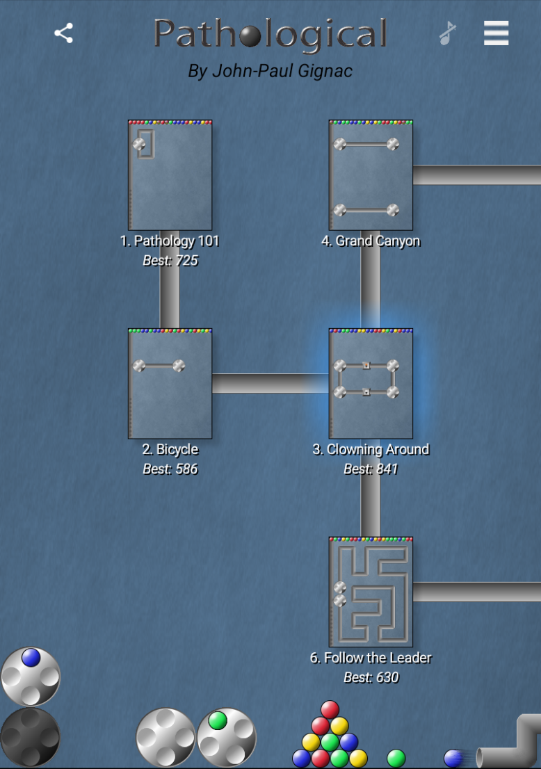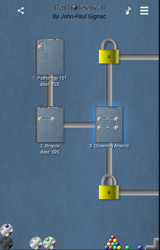 Pathological is an enriched clone of the game "Logical" by Rainbow Arts. To solve a level, fill each wheel with four marbles of matching color.