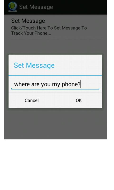 This is helpful app for Elders/Kids whome location you wanna know or if you lost your phone and wanna track where it is right now, you can just send SMS to that mobile and can know its location. You can set your own message and whenever you want to track your phone location just send that message to your phone through any other mobile and you will get your location url, just click that and you can see your phone location on Map. To set message click below button "Set Text Message" and on next screen click "Set Message". If you have set Message aleady you can see it below the button under Existing Message and if not yet set you can see message "not set yet..." so click button and set now.