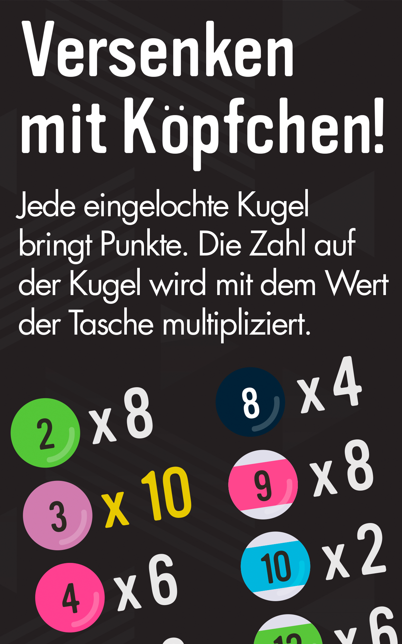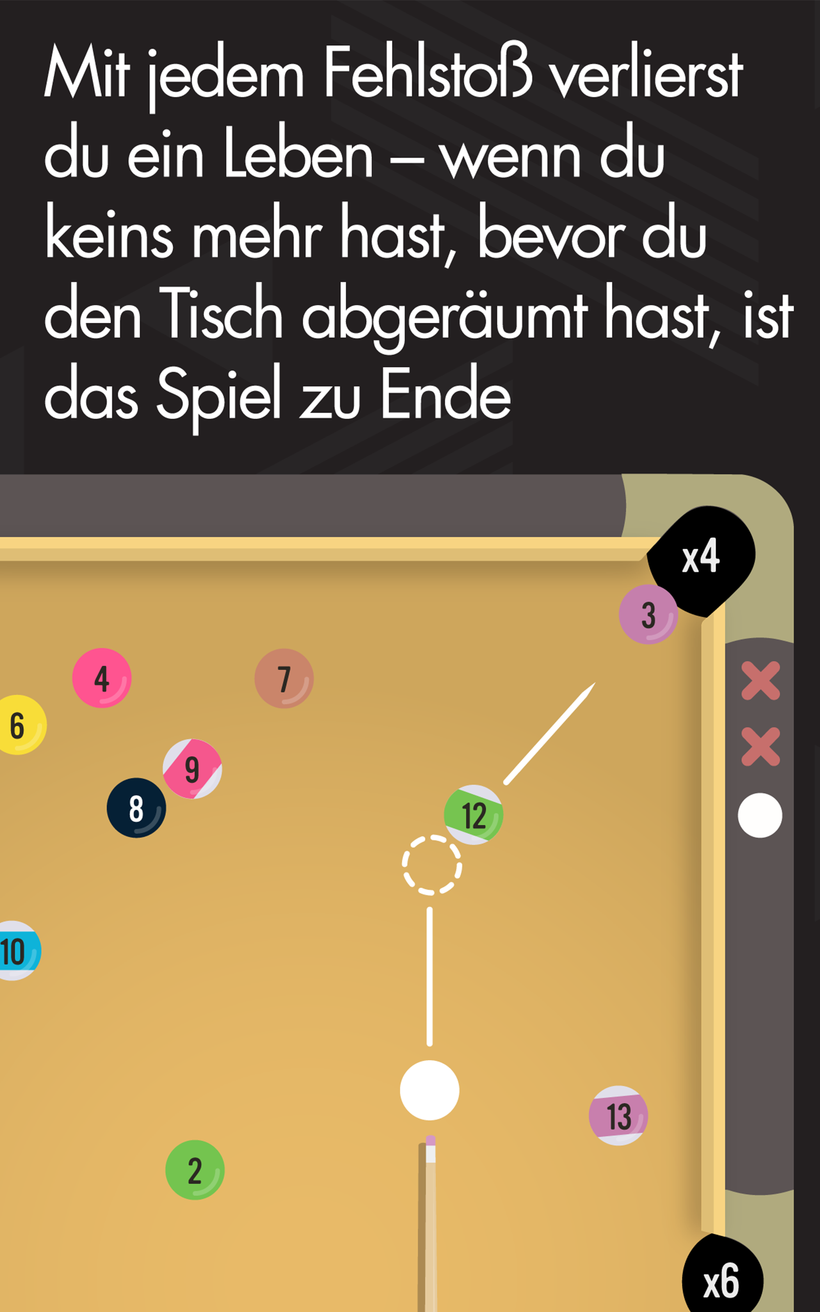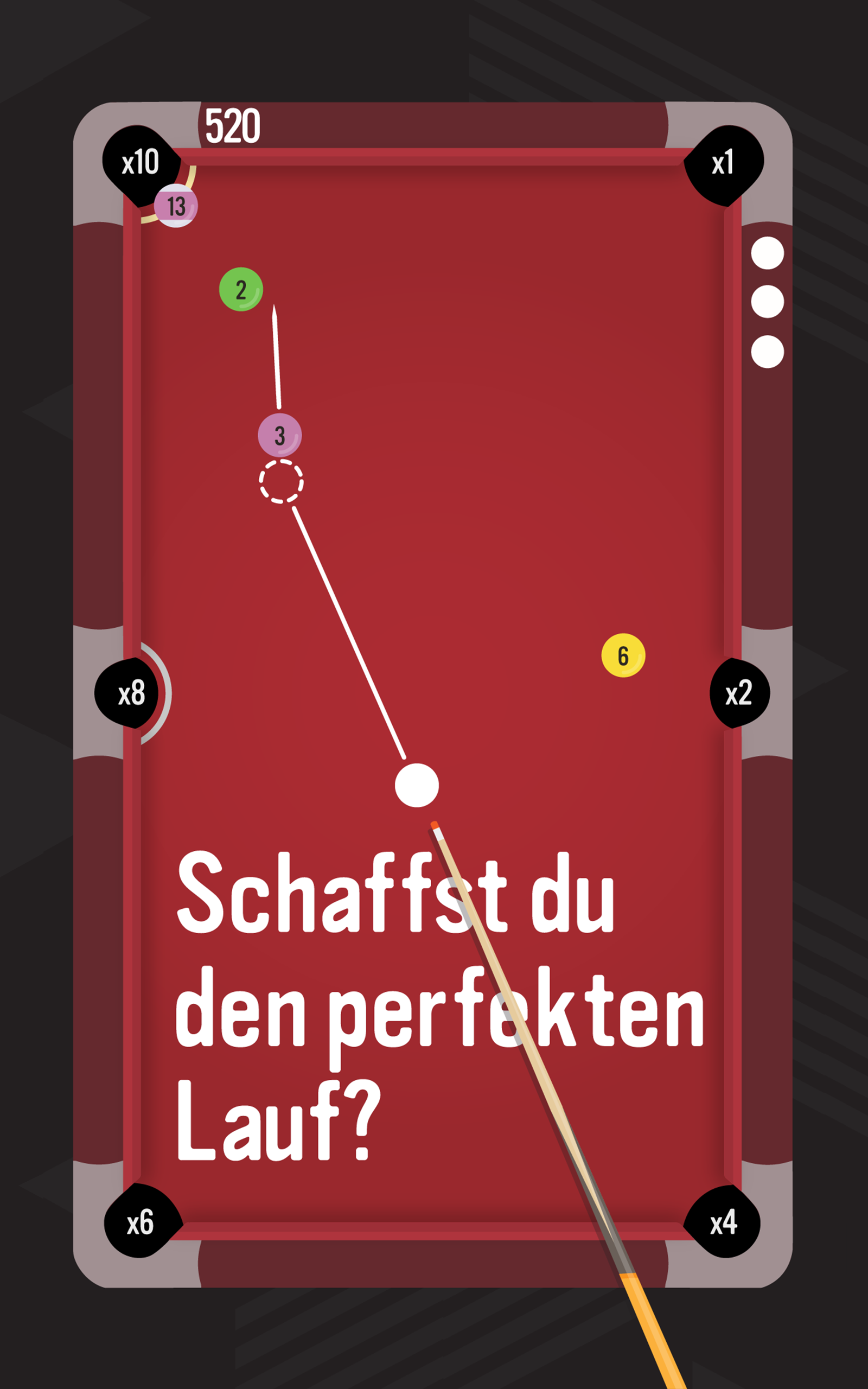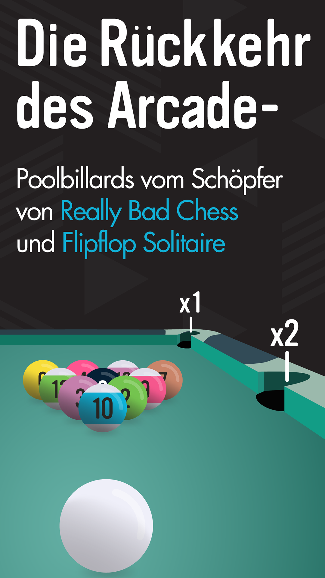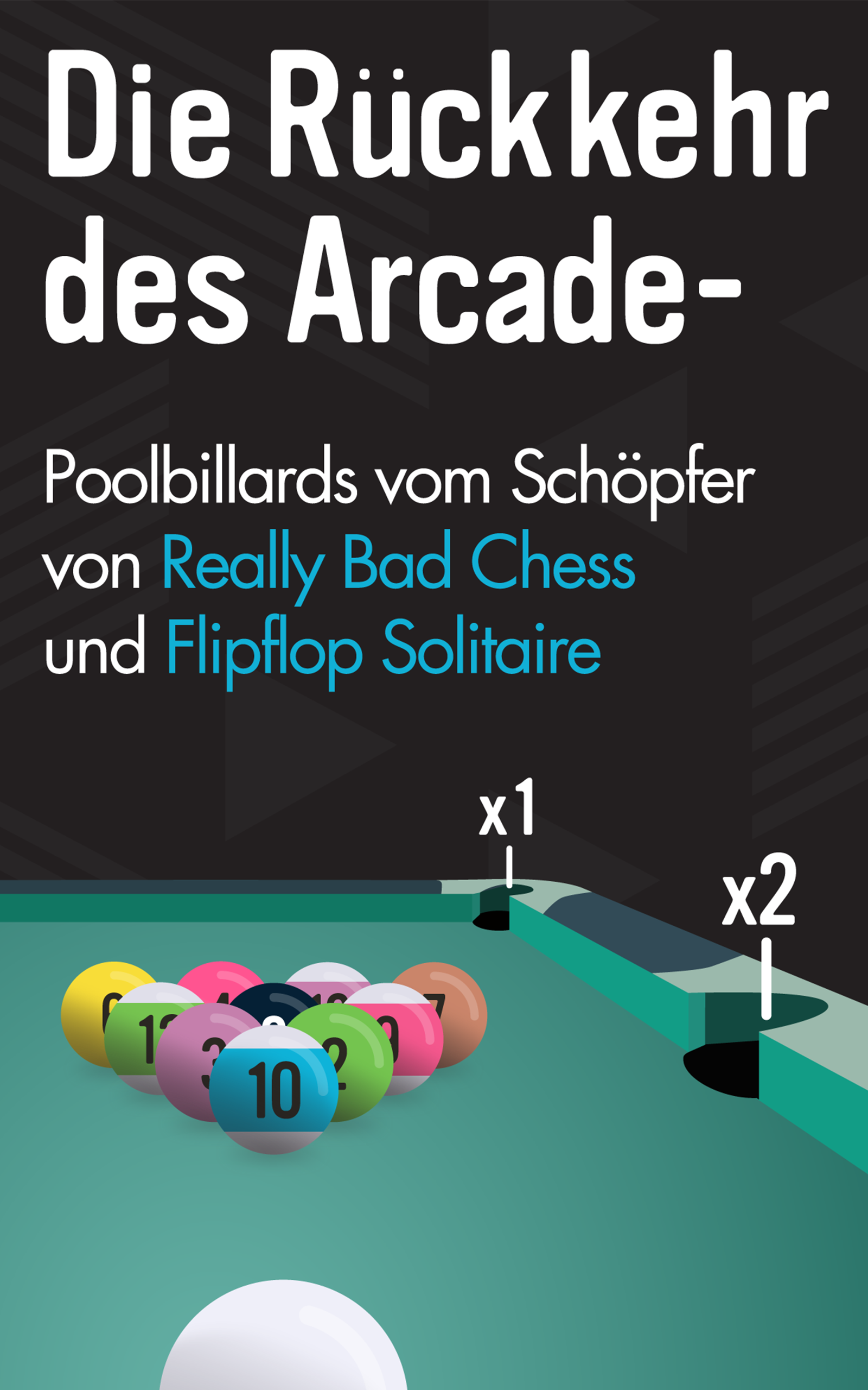 Die Rückkehr des Arcade-Poolbillards vom Schöpfer von Really Bad Chess und Flipflop Solitaire. Pocket-Run Pool kombiniert 8-Ball-Billard mit der spannenden Jagd nach dem Rekord. In Pocket-Run musst du natürlich alle Kugeln versenken, aber wo und wann du sie versenkst, ist von entscheidender Bedeutung! Mit jeder versenkten Kugel bekommst du Punkte je nach der Tasche, in der du die Kugel versenkt hast. Versenke mit Köpfchen! Aber pass auf, mit jedem Fehlstoß verlierst du ein Leben – wenn du keins mehr hast, bevor du den Tisch abgeräumt hast, ist das Spiel zu Ende Spiele gegen dich selbst, gegen die Welt oder gegen die Bank in einer Vielzahl von spannenden Spielmodi! Schaffst du den perfekten Lauf? Arcade-Poolbillard ist zurück! ------WAS WIRD GEBOTEN? – Spiele die Pocket-Run Pool-Modi Standard, Hoher Einsatz und Sofort-Turnier gratis! – Spiele gegen Spieler aus der ganzen Welt im Modus Sofort-Turnier um Gold! – Gehe volles Risiko unter allen möglichen Spielbedingungen (wie die hinterhältige Queue-Wand) im Modus Hoher Einsatz. – Schalte den Anstoß der Woche und alternative Hintergründe frei und entferne das Sofort-Turnier Startgeld mit einem In-App-Kauf – Verfolge die Statistiken für alle vier Modi. – Gewinne alternative Pool-Queues und Farbschemata im Modus Hoher Einsatz. ------EIN WORT VOM ENTWICKLER Ich habe schon immer Poolbillard geliebt und als ich mein erstes iPhone vor Jahren bekam, eröffnete sich mir die digitale Welt der Poolbillard-Spiele. Es gibt bereits zahlreiche Varianten, aber ein einfaches und unterhaltsames Billardspiel für Einzelspieler zu finden, war schwerer als gedacht. Ich fand schließlich eins, das mir gefiel, aber nach extensivem Spielen wurde es zu einfach, den Computer zu besiegen. Und da fiel es mir wie Schuppen von den Augen – spielt man gegen den Computer in einer Simulation, spielt man buchstäblich gegen einen Gott ... Ich meine damit, entweder der Computer macht es dir zu leicht (aus irgendeinem Grund), oder er spielt das perfekte Spiel und du verlierst deinen ganzen Einsatz. Mir dämmerte also, dass, wenn ich ein gutes Billardspiel für Einzelspieler möchte, ich einen neuen Weg gehen muss – und eine Variante erschaffen, die keinen Computergegner benötigt, die auf der Idee aufgebaut ist, Punkte zu erzielen, sich zu verbessern, Risiken einzugehen und sich einzigartigen und abwechslungsreichen Herausforderungen zu stellen. Pocket-Run Pool ist das Spiel, das dabei herauskam. Ich hoffe, es gefällt dir! – Zach
