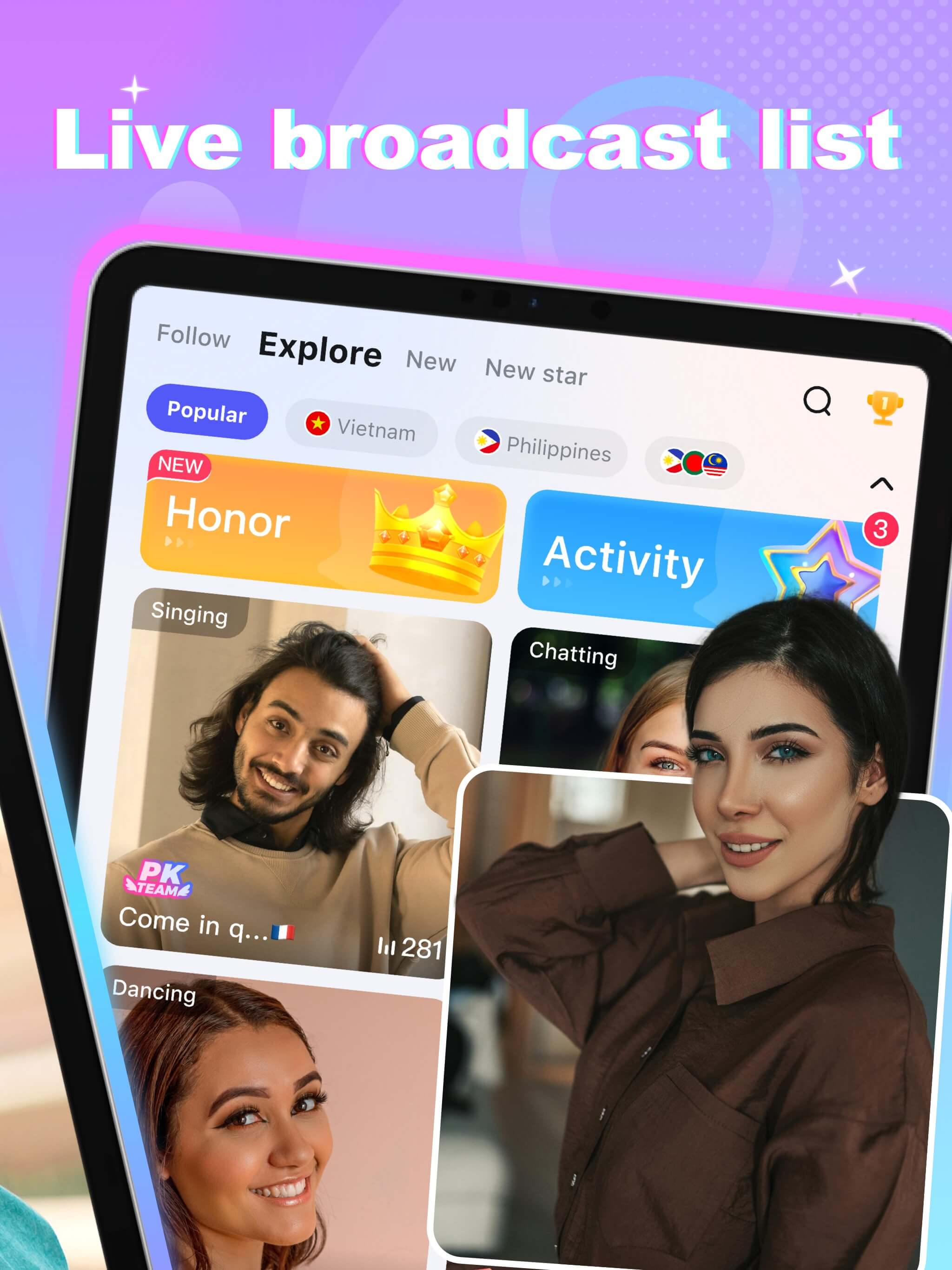 - Dynamische Live-Streams: Treffen Sie Moderatoren, schauen Sie sich Live-Shows an und nehmen Sie an lustigen Herausforderungen teil.