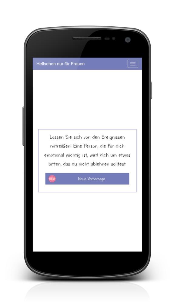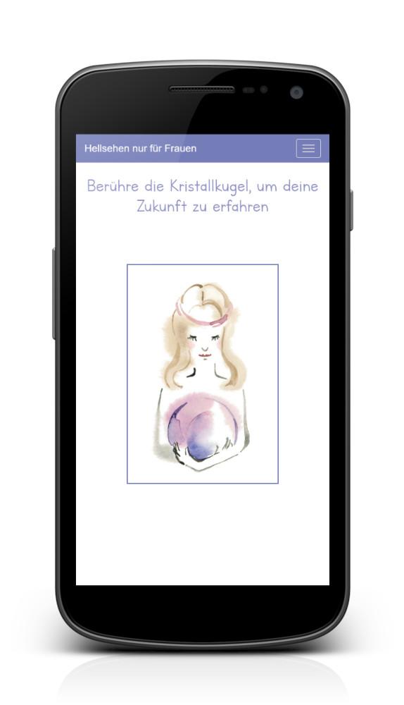 Wenn Sie eine Frau sind und sich über Ihre Zukunft, Ihre Liebe oder Ihr Leben im Allgemeinen wundern, ist diese Kristallkugel für Sie, für Sie Frauen gemacht. Dank Hellsehen erhalten Sie Antworten auf all diese kleinen Fragen des Lebens, das Warum, das Wie, das Wann ... Kostenlos! Empfohlen von der berühmten Frauenzeitschrift am Mittwochmorgen! Wie funktioniert es Sie müssen nur den Bildschirm Ihres Telefons auf der Ebene des Hellsehens berühren, und es bietet Ihnen eine personalisierte Vorhersage für Ihre nahe oder ferne Zukunft. Entworfen für Frauen und nur für sie, werden Sie bestimmte Informationen entdecken, manchmal vage, manchmal sehr präzise, darüber, was mit Ihnen und Ihren Lieben passieren kann. Sie werden der Meister Ihres eigenen Schicksals, besonders wenn Sie schwierige Entscheidungen treffen müssen, wenn Zweifel Sie angreifen oder wenn Sie diejenigen schützen müssen, die Sie lieben. Die Ergebnisse sind nicht vollständig garantiert, da bei jedem Hellsehen der Ball manchmal falsch ist. Ihre Beteiligung, Ehrlichkeit, Offenheit und Konzentration auf den Wahrsagungsprozess sind entscheidend, um die Erfolgschancen zu maximieren.