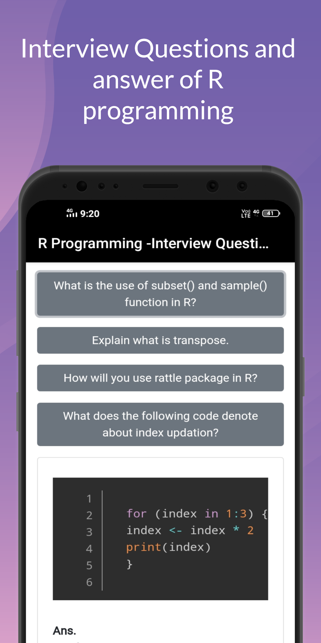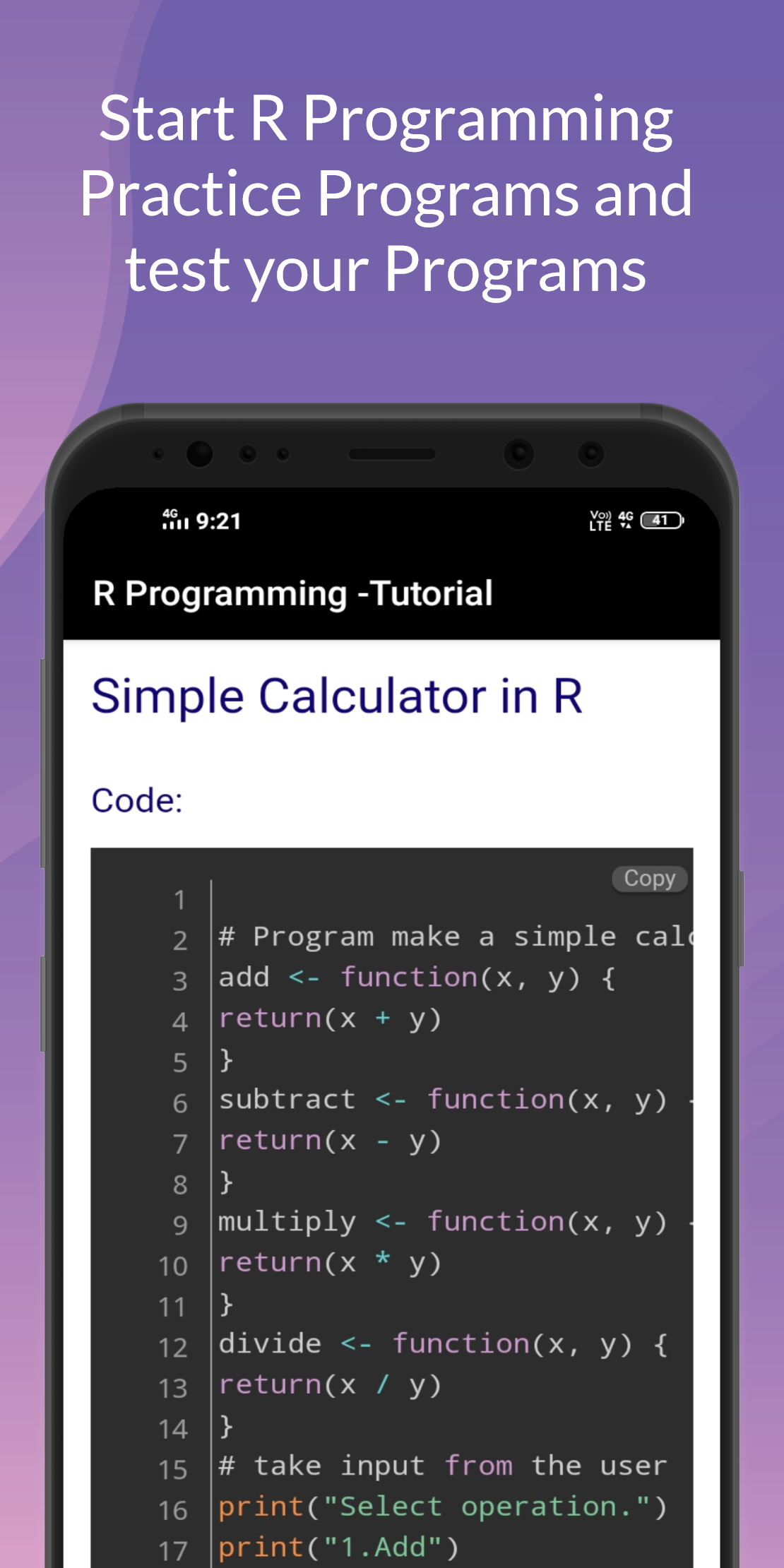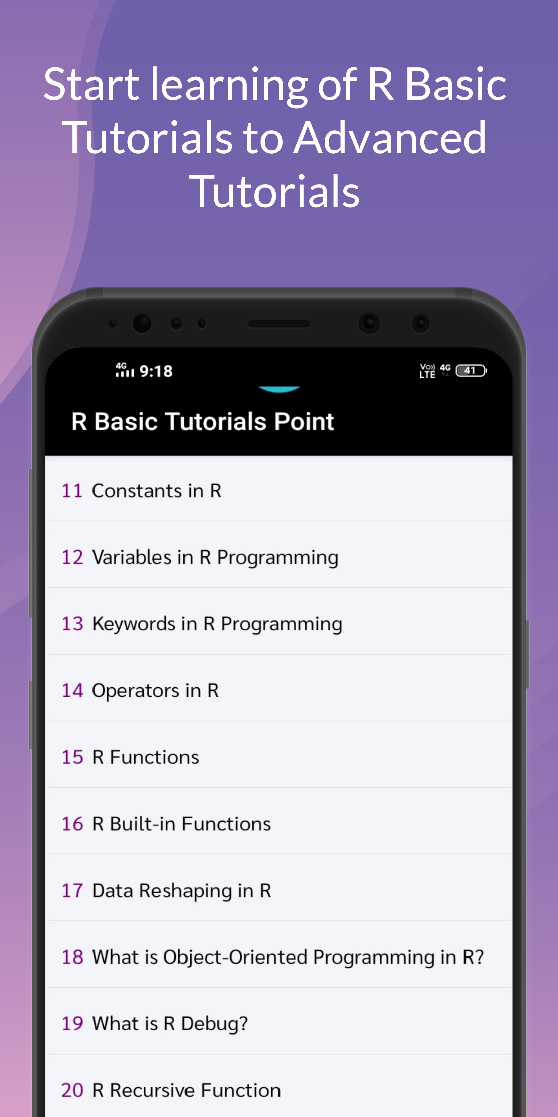 Sie lernen, in R zu programmieren und R für eine effektive Datenanalyse einzusetzen. Sie lernen, wie Sie Software installieren und konfigurieren, die für eine statistische Programmierumgebung erforderlich ist, und beschreiben generische Programmiersprachenkonzepte, wie sie in einer statistischen Hochsprache implementiert werden. Diese App behandelt praktische Probleme im statistischen Rechnen, einschließlich Programmieren in R, Einlesen von Daten in R, Zugreifen auf R-Pakete, Schreiben von R-Funktionen, Debuggen, Profilerstellung von R-Code sowie Organisieren und Kommentieren von R-Code. Themen der statistischen Datenanalyse werden Arbeitsbeispiele liefern. Das ist die Stärke der R-Programmierung, sie ist einfach genug, um sie im Handumdrehen zu lernen. Alles, was Sie brauchen, sind Daten und eine klare Absicht, auf der Grundlage der Analyse dieser Daten eine Schlussfolgerung zu ziehen. Tatsächlich baut R auf der Programmiersprache S auf, die ursprünglich als Programmiersprache gedacht war, die dem Schüler helfen würde, Programmieren zu lernen, während er mit Daten herumspielt. R-Programmierung - Projektbasierte Tutorials Punktanwendung Themen einschließen:- R-Programmierung Grundlagen-Tutorials - - Installation von R - R Studio-IDE - R Vor- und Nachteile - R-Pakete - Schlüsselwörter in der R-Programmierung - Operatoren in R - R-Funktionen - Saiten in R - R-Klassen und -Objekte und mehr R-Anweisungen und R-Schleifen - - R if-Anweisung - Wenn-sonst-Anweisung - R else if-Anweisung - R-Switch-Anweisung - R nächste Anweisung - R Break-Anweisung -R für Schleife - R Wiederholungsschleife - R while-Schleife und mehr Datenstrukturen in R - - R-Vektor -R-Listen -R-Arrays - R-Matrix - R-Datenrahmen - R-Faktoren und mehr Datenschnittstellen und Datenvisualisierung -R CSV-Dateien -R Excel-Datei -R-Binärdatei -R JSON-Datei -R XML-Datei - R-Datenbank - R-Datenvisualisierung -R-Kreisdiagramme - R-Balkendiagramme - R-Boxplot - R-Histogramm - R-Liniendiagramme und mehr R-Regression - - Lineare Regression - R-multiple lineare Regression - R Logistische Regression - R-Poisson-Regression und mehr R-Statistik - -R-Normalverteilung - Binomialverteilung - R-Klassifizierung - R-Zeitreihenanalyse - R-Random Forest - T-Test in R - Chi-Quadrat-Test - R gegen Python und mehr R Übungsprogramme - R Interviewfragen und Antworten - App-Funktionen:- es ist völlig kostenlos. Einfach zu verstehen. Sehr kleine App.
