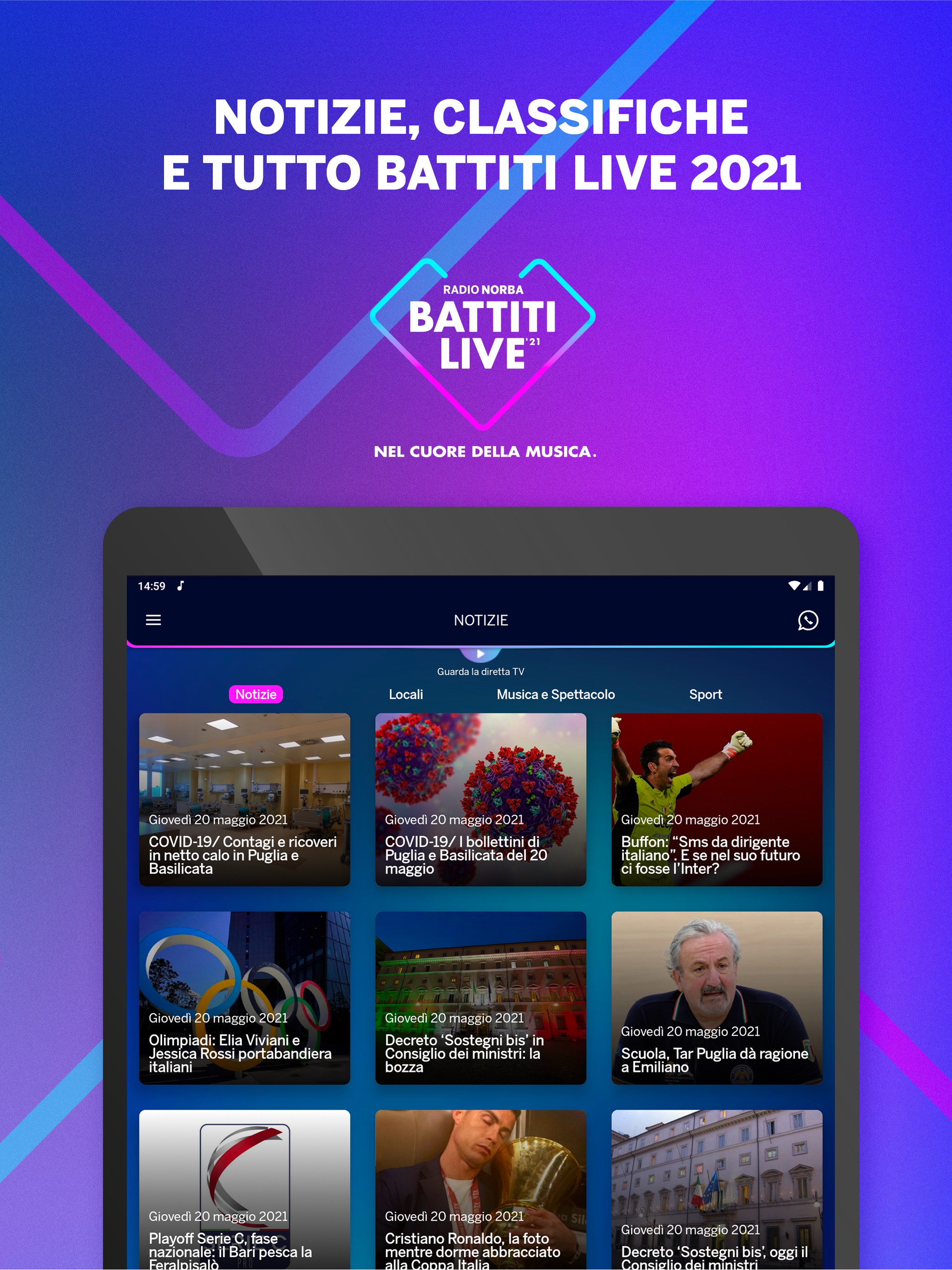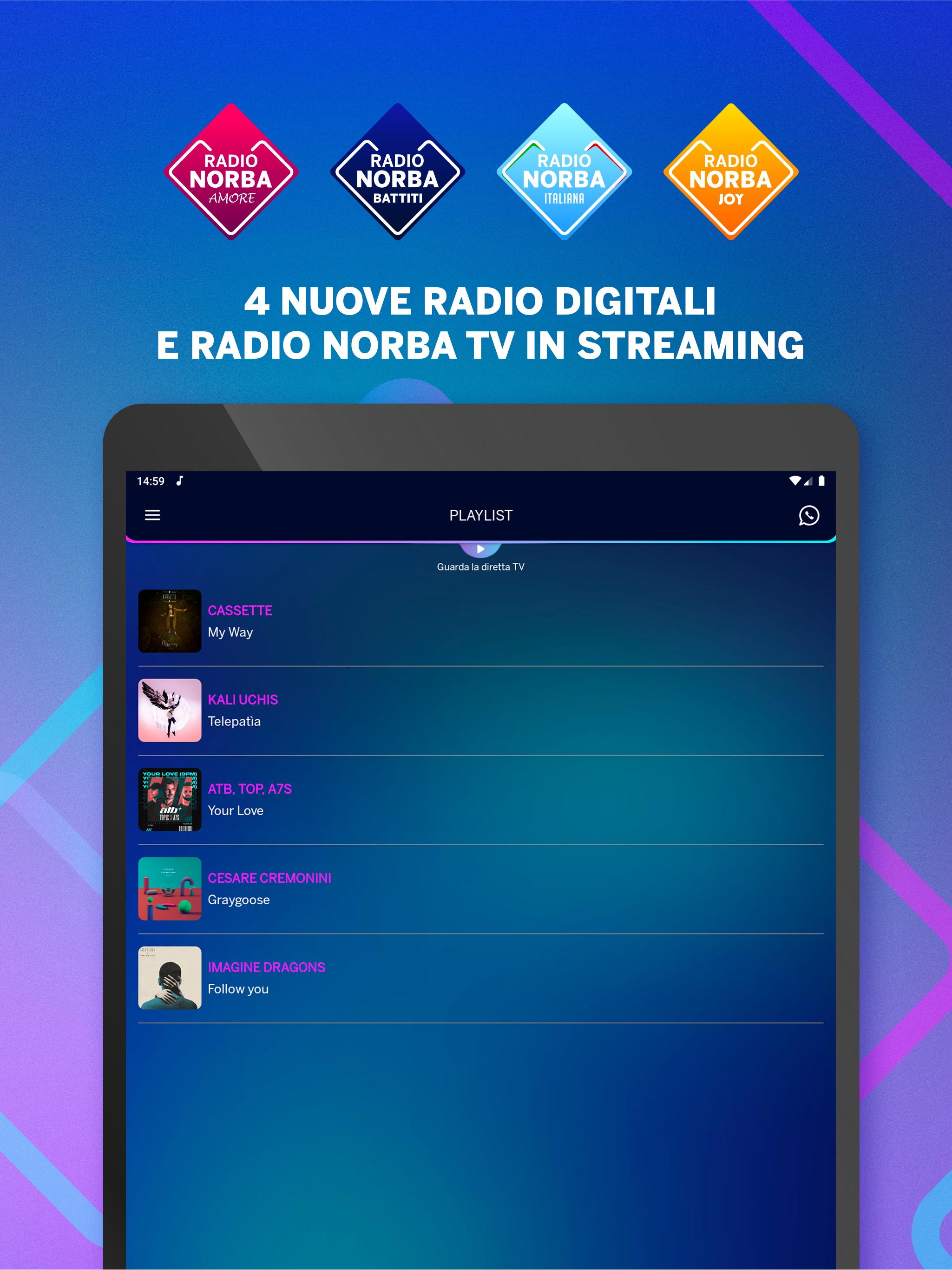 RADIO NORBA ist Musik! Und so viel mehr. Die neue innovative KOSTENLOSE APP von Radio Norba, La Radio del Sud. Laden Sie die neuen Grafiken und viele neue Funktionen herunter und entdecken Sie sie für noch mehr Leidenschaft. Hören Sie Radio Norba live. All die Musik, die Sie lieben, 24 Stunden am Tag, mit dem Programm von Radio Norba. Wischen Sie schnell zum Streaming von RADIO NORBA TV: Sky TV-Kanal 730 ist ebenfalls in der App enthalten. Denn das Radio ist jetzt auch zu sehen! Stöbern und genießen Sie die 4 neuen digitalen Radios für jeden Geschmack und jeden Moment… je nach Lust und Laune. * ITALIENISCHES NORBA-RADIO Für diejenigen, die italienische Lieder aller Zeiten lieben * RADIO NORBA LIEBE Für diejenigen, die sich für die großen Liebesklassiker begeistern * RADIO NORBA FREUDE Für diejenigen, die Musik lieben, die gute Laune macht * RADIO NORBA BATTITI Für diejenigen, die den Hits des Augenblicks nicht widerstehen können Entdecken Sie die Neuigkeiten italienischer und internationaler Musik, exklusive Interviews mit Künstlern, Events und der ganzen Welt von RADIO NORBA BATTITI LIVE. Tauchen Sie ein in die Funktionen der App: • Scrollen Sie im Zeitplan nach unten, um herauszufinden, wer in den nächsten Stunden dort sein wird. • Senden Sie NACHRICHTEN live über WhatsApp • TAP und sende Herzen an deine Lieblingslieder • Greifen Sie schnell auf alle SOZIALIEN von Radio Norba zu Bleiben Sie auf dem Laufenden: Top-Nachrichten, Clubs, Musik und Unterhaltung, Leichtgewicht. • Entdecken Sie jeden Tag Ihr HOROSKOP und das der Menschen, die Sie lieben. • Sehen Sie sich die GALERIE mit exklusiven Fotos und Videos an. • Nehmen Sie an Quiz- und Preiswettbewerben teil. RADIO NORBA. Eine neue App, endlose Möglichkeiten.