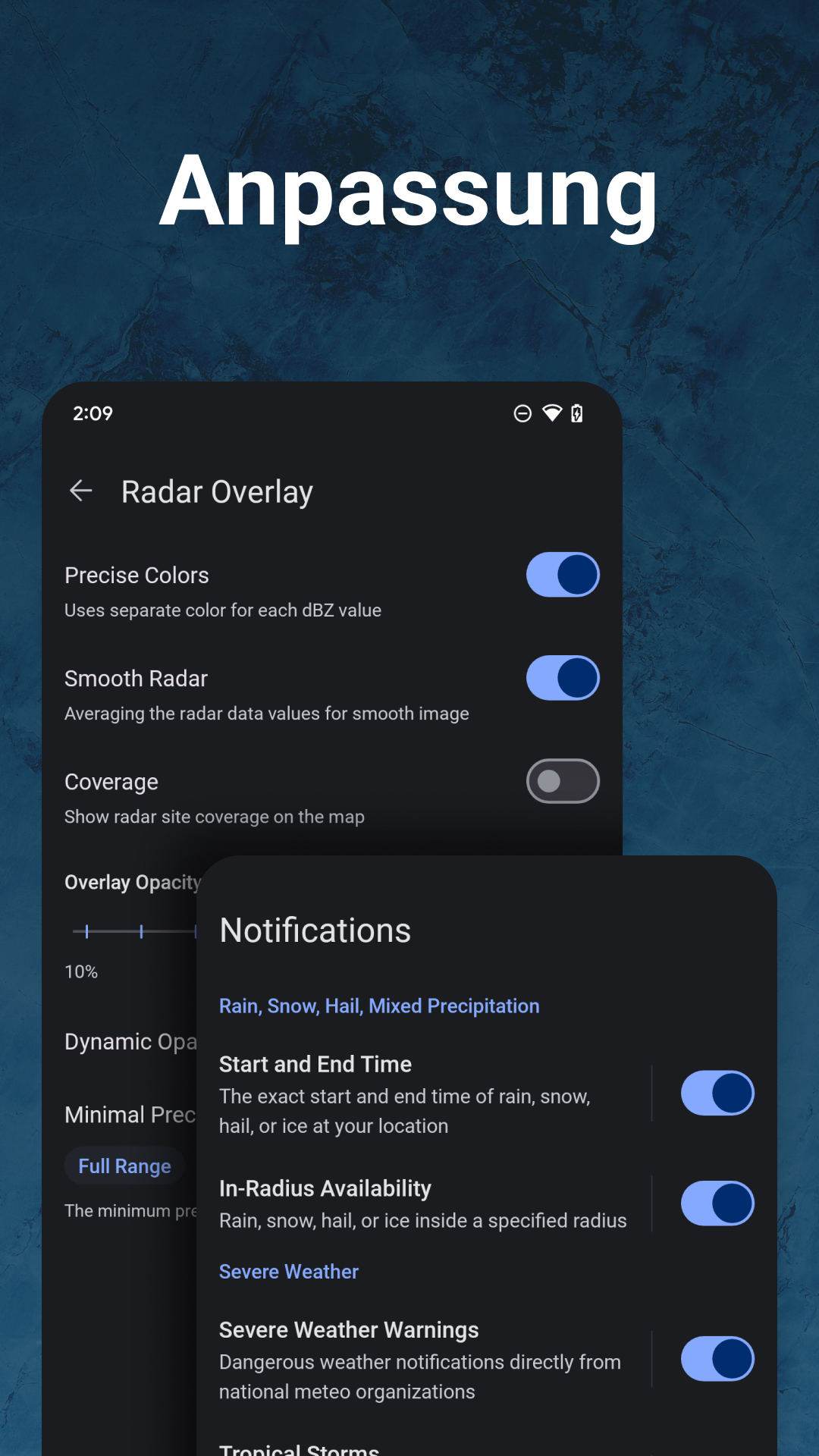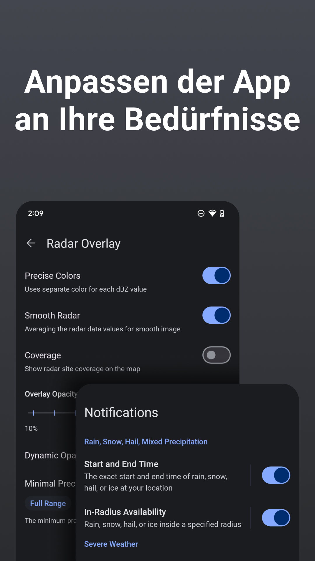 Individuelle Anpassung: Feinabstimmung von Regenwarnungen, Grenzwerten und Mehrstandort-Einstellungen für personalisierte lokale Wettervorhersagen und Sturm-Tracking.