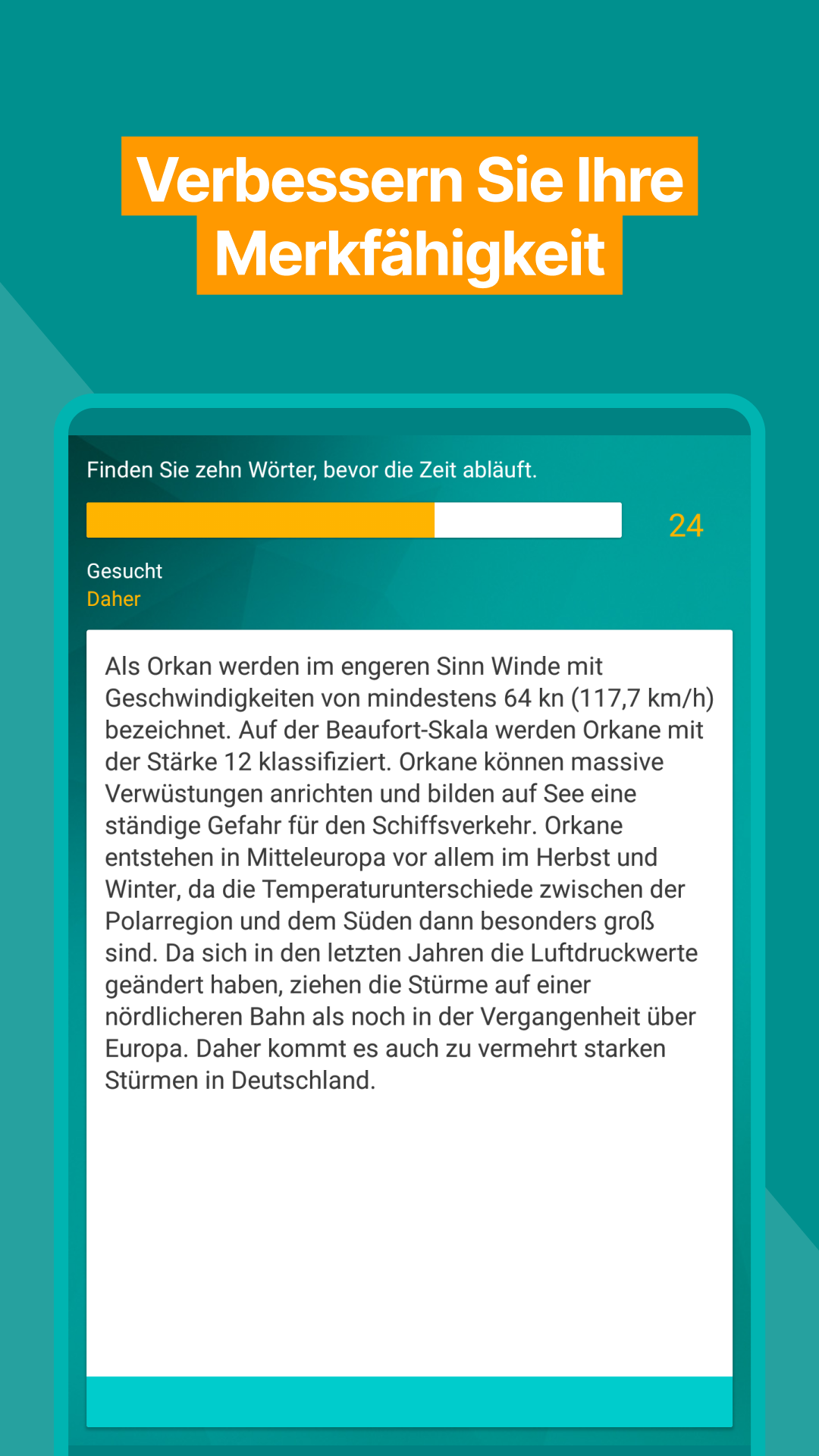 Lernen Sie schneller und effektiver Lesen mit ihrem persönlichen Speed Reading Trainer. Version 1.0 war bereits TESTSIEGER BEI STIFTUNG WARENTEST – jetzt ist Version 2.0 der beliebten Top-Bildungs-App endlich verfügbar! • Deutliche Erhöhung Ihrer Lesegeschwindigkeit • Augentraining und Verbesserung der mentalen Fitness • Besseres Textverständnis und gesteigerte Merkfähigkeit Mit dieser Speed Reading App haben Sie alles, um Texte aller Art in Zukunft schneller, effektiver und vor allem mit einer besseren Behaltensleistung zu lesen. Dabei ermöglicht der PowerReader es Ihnen, Ihre tägliche Arbeit zu erledigen und gleichzeitig wichtige Lesetechniken zu trainieren. Lesetechniken zu trainieren hat noch nie so viel Spaß gemacht! Sie verdoppeln Ihre Lesegeschwindigkeit in wenigen Tagen. Testpersonen erreichten mit Hilfe dieses Programms in 10 Tagen eine durchschnittliche Steigerung der Lesegeschwindigkeit um 143 %. Sie brauchen aktuell 30 Minuten für Ihre Tageszeitung? Lesen Sie bald zwei Zeitungen und zusätzlich noch ein Kapitel in einem spannenden Fachbuch; und das ohne Zeitverlust! Diese innovative App bietet ideale Voraussetzungen, um in kürzester Zeit überprüfbare Fortschritte zu erzielen. Doch damit nicht genug: Sie trainieren spielerisch alle notwendigen Techniken für eine effektive Lesetechnik und eine deutlich höhere Lesegeschwindigkeit; das bedeutet: - schnelles Erkennen von Zahlen, Buchstaben und Wörtern - flexible Augenbewegungen - Steigerung der Konzentration - Erweiterung der Blickspanne Die App führt Sie sicher durch die einzelnen Lernschritte. Das Programm erkennt sofort Ihre individuellen Stärken und Schwächen. Durch die Statistikfunktion haben Sie jederzeit Überblick über Ihren Lernfortschritt. Jedes Übungsergebnis wird durch ein grafisches Scoring bewertet. Je mehr Sterne Sie erreichen, desto näher sind Sie Ihrem Ziel: einer effektiven Lesetechnik und damit einer extrem hohen Lesegeschwindigkeit. Mit Hilfe von verschiedenen Lesetests aus unterschiedlichen Themengebieten können Sie jederzeit Ihre Lesegeschwindigkeit überprüfen. Anhand von Fragen zum Text kontrollieren Sie in einem zweiten Schritt Ihre Behaltensleistung. Die ideale Kombination, um eine effektive Lesetechnik und eine hohe Merkfähigkeit zu erreichen. Aber Vorsicht: Diese App macht „süchtig“, denn die schnellen Erfolge motivieren zu regelmäßigem Training. Es macht Spaß und gleichzeitig tun Sie etwas, um geistig fit zu bleiben. Unser Tipp: Trainieren Sie mäßig - aber regelmäßig. Dies garantiert den größten Erfolg. Wer braucht diese App: - jeder, der täglich mehr als eine halbe Stunde liest - Führungskräfte - Sekretärinnen - Schüler und Studenten - Einkäufer und Verkäufer Wem hilft diese App: - Sie haben häufig das Gefühl, langsam zu lesen? - Sie gehen in Texten zurück, weil Ihnen etwas unklar ist? - Sie lassen sich beim Lesen leicht ablenken? - Sie wissen hinterher nicht mehr, was Sie gelesen haben? Wenn Sie eine dieser Fragen mit „Ja!“ beantworten, dann ist diese App die Lösung.