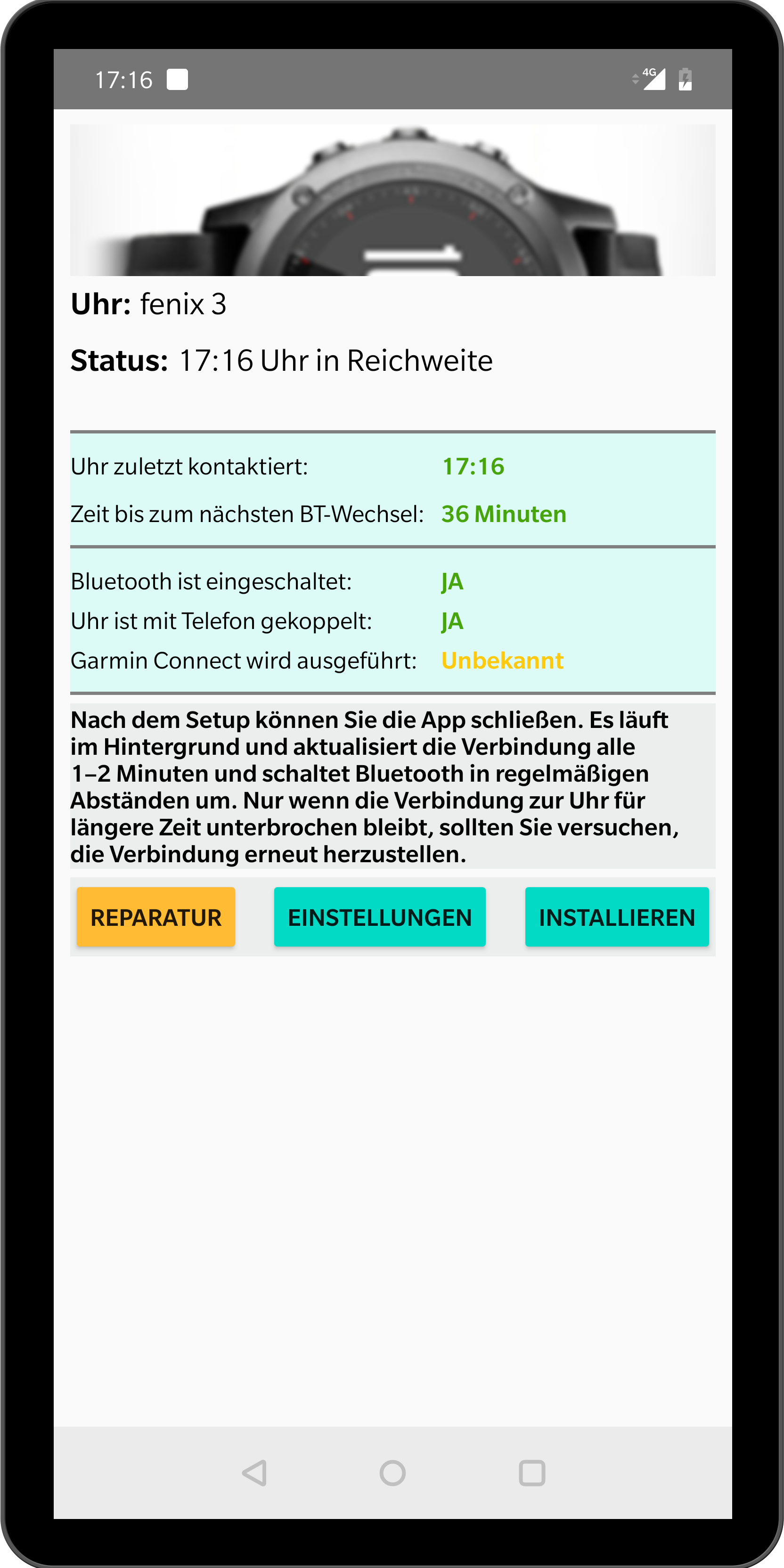 Reconnect Garmin Watch hält die Verbindung zu Ihrer Uhr aufrecht und stellt die Uhr wieder her, wenn Sie sich nicht am Telefon befinden. Es läuft im Hintergrund und der Batterieverbrauch ist sehr gering. Für die App muss Garmin Connect installiert sein. HINWEIS: Ich bin NICHT von Garmin. Die App funktioniert für Fenix 3/5, Forerunner 235 / 735XT / 920, vivoactive3, vivoactive HR, vivosmart HR, vivomove HR und andere Modelle. Wenn Sie die App zum ersten Mal ausführen, wird das Setup gestartet. Bitte folgen Sie genau den Anweisungen. Sie sollten auch die Akkuoptimierung für die Garmin Connect-App deaktivieren. Huawei-Handys: Bitte sehen Sie den Text unten. Fehlerbehebung: >> Bei Galaxy-Telefonen müssen Sie möglicherweise das Telefon neu starten und die App "Bluetooth-Freigabe" erzwingen (gehen Sie zu Telefon Einstellungen - Anwendungen, zeigen Sie System-Apps an - Bluetooth-Freigabe - Zwangsstopp). >> Wenn Vivoactive HR die Verbindung trennt, müssen Sie manchmal in das Garmin Connect-Menü - Garmin Devices - gehen und dann Bluetooth am Telefon ausschalten. Connect sollte Sie auffordern, Bluetooth wieder einzuschalten. Tun Sie es und warten Sie 10 bis 20 Sekunden, und dann sollte sich die Uhr wieder verbinden. (In den Android-Einstellungen sollten Sie auch Location Services aktiviert haben!) >> Einige Lenovo-Telefone funktionieren möglicherweise nur, wenn die Firmware der Uhr BLE-ANT herabgestuft wird. Sie müssen eine Datei mit dem Namen GUP1909.BIN bei Google veröffentlichen und von einem Computer auf die Uhr hochladen. >> Wenn die Uhr angezeigt wird, wird CONNECTED angezeigt, Sie erhalten jedoch keine Benachrichtigungen: * Öffnen Sie Garmin Connect und wählen Sie Einstellungen - Intelligente Benachrichtigungen. Deaktivieren und aktivieren Sie eine der Benachrichtigungen, z. B. Eingehende Anrufe. Dies kann dazu führen, dass Connect nach Berechtigungen fragt. * Wenn Sie nach Berechtigungen fragen, obwohl Sie die Erlaubnis erteilt haben, starten Sie das Telefon neu. - Wenn es nicht um Berechtigungen fragt: * Gehen Sie zu Einstellungen - Apps - Verbinden - Berechtigungen Ihres Telefons und aktivieren Sie alle Berechtigungen Probleme mit Garmin Connect bei einigen Huawei-Handys: Sie können folgendes versuchen. * Deaktivieren Sie die Ortungsdienste auf Ihrem Telefon und versuchen Sie, die Uhr in Garmin Connect hinzuzufügen - ODER - * Installiere und führe die App "Bluetooth Pair" aus - ODER - * Lösung von fin: https://forums.garmin.com/forum/on-the-trail/wrist-worn/fenix-3/1271446-unable-to-pair-fenix-3-with-android-7-0-phone Wenn Sie keine Benachrichtigungen von Ihrem Huawei-Handy erhalten, überprüfen Sie die App-Berechtigungen für Garmin Connect: Einstellungen> Apps & Benachrichtigungen> Apps> Einstellungen (kleines Zahnradzeichen unten)> Sonderzugriff> Benachrichtigungszugriff: Stellen Sie sicher, dass Garmin Connect Smart Notifications aktiviert ist. Letzter Status von Garmin zu diesem Problem: https://support.garmin.com/en-US/?faq=3qBFoCgeH428IUUfc0SpZ7&searchType=noProduct