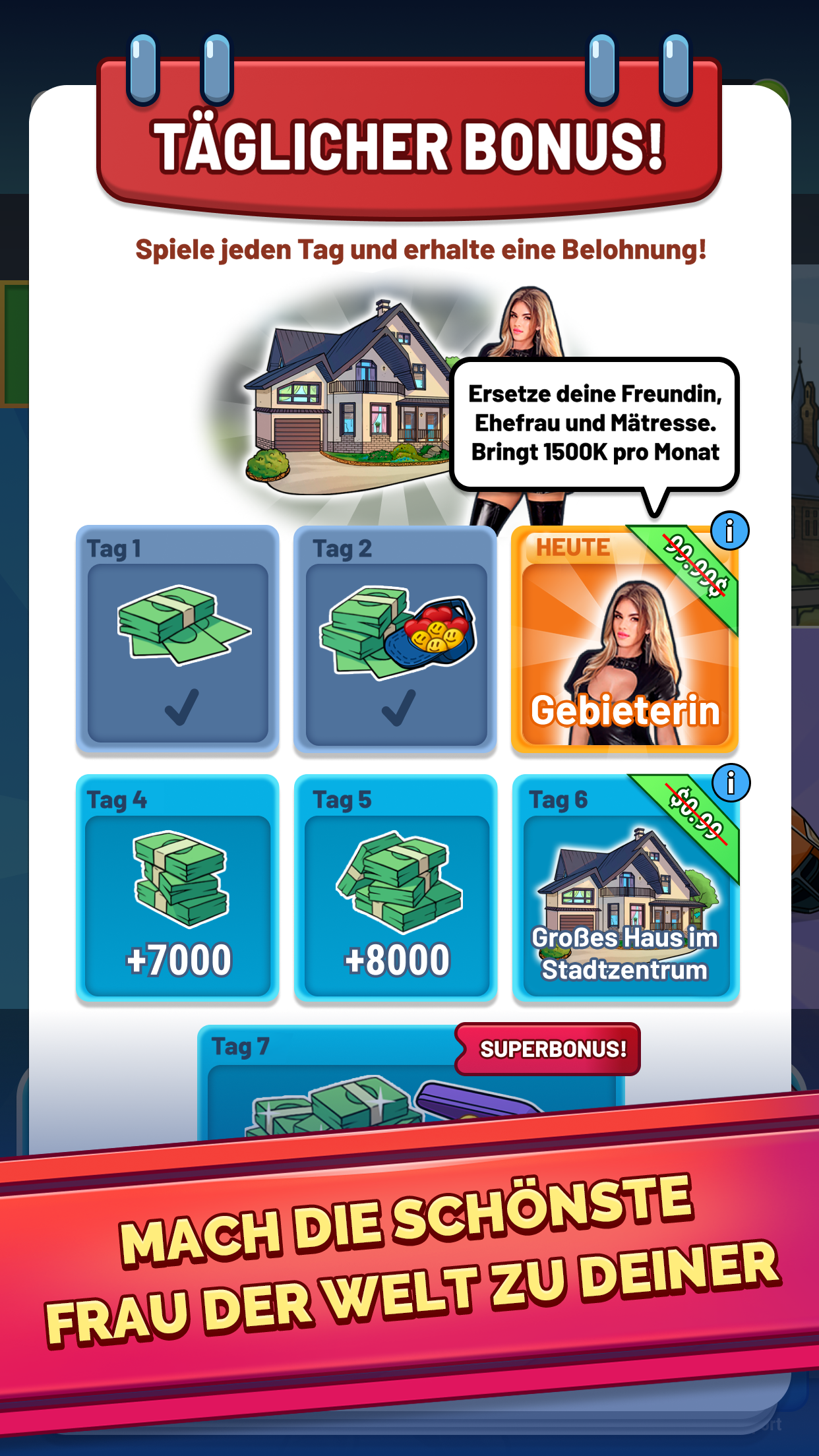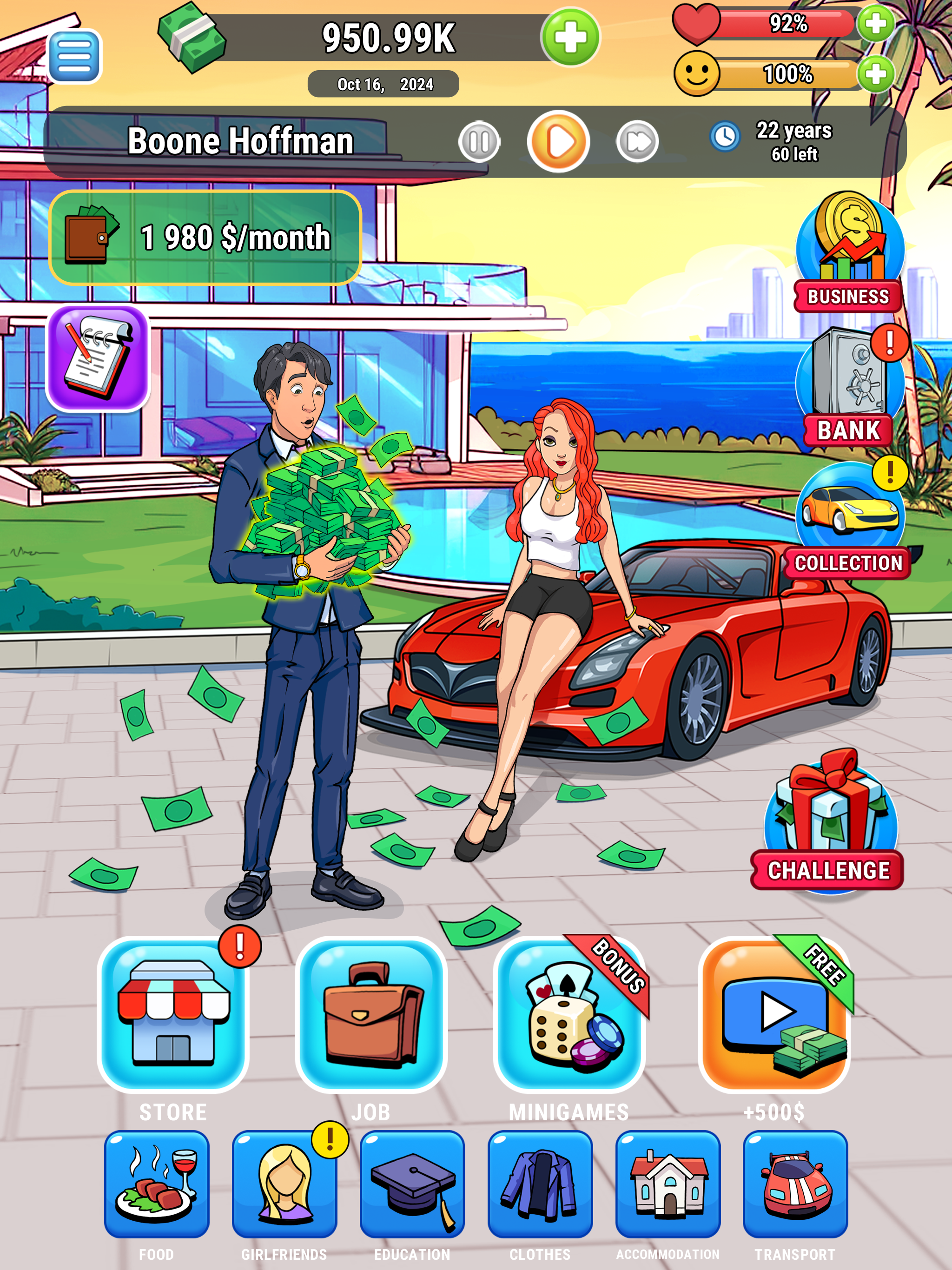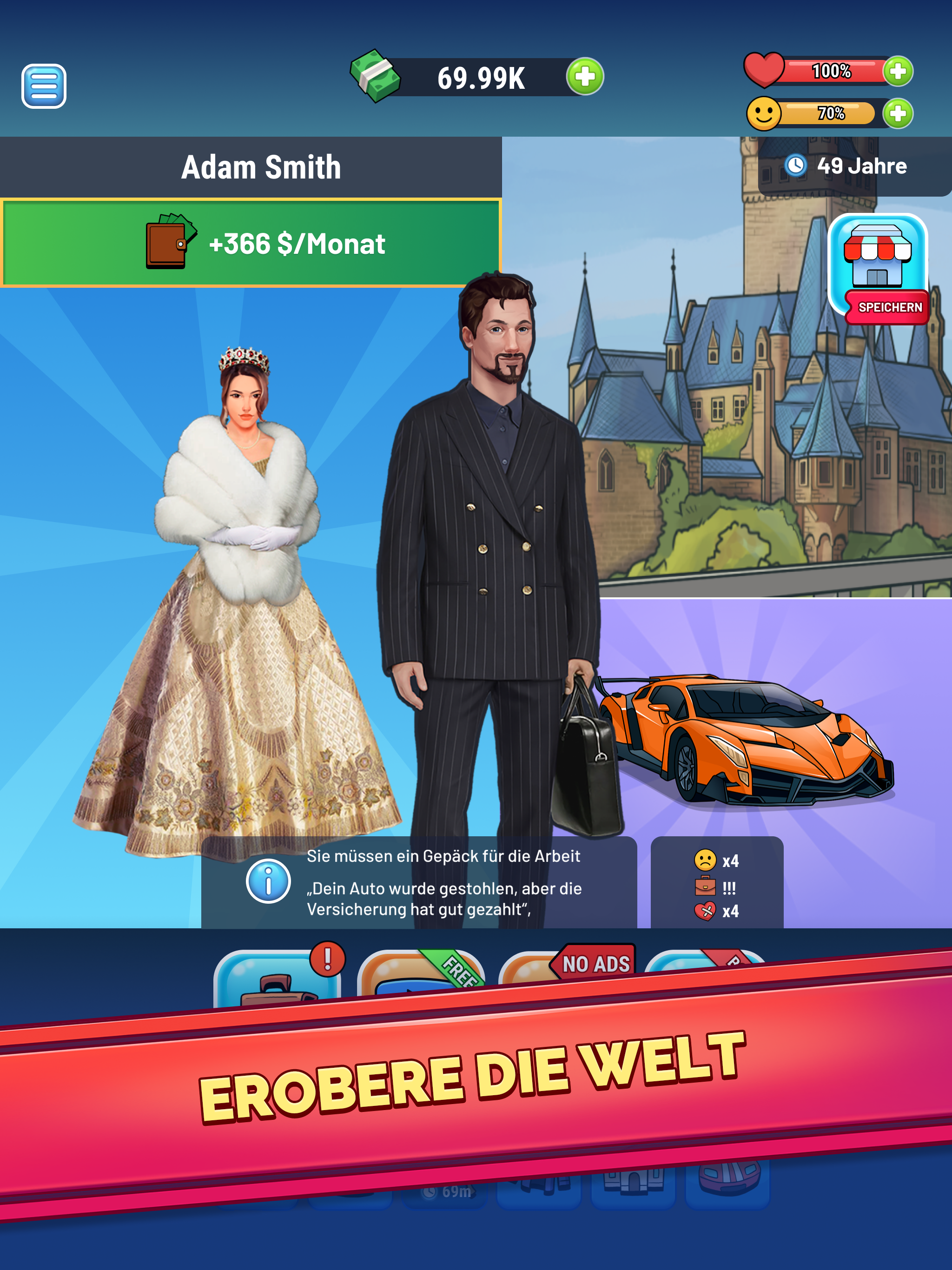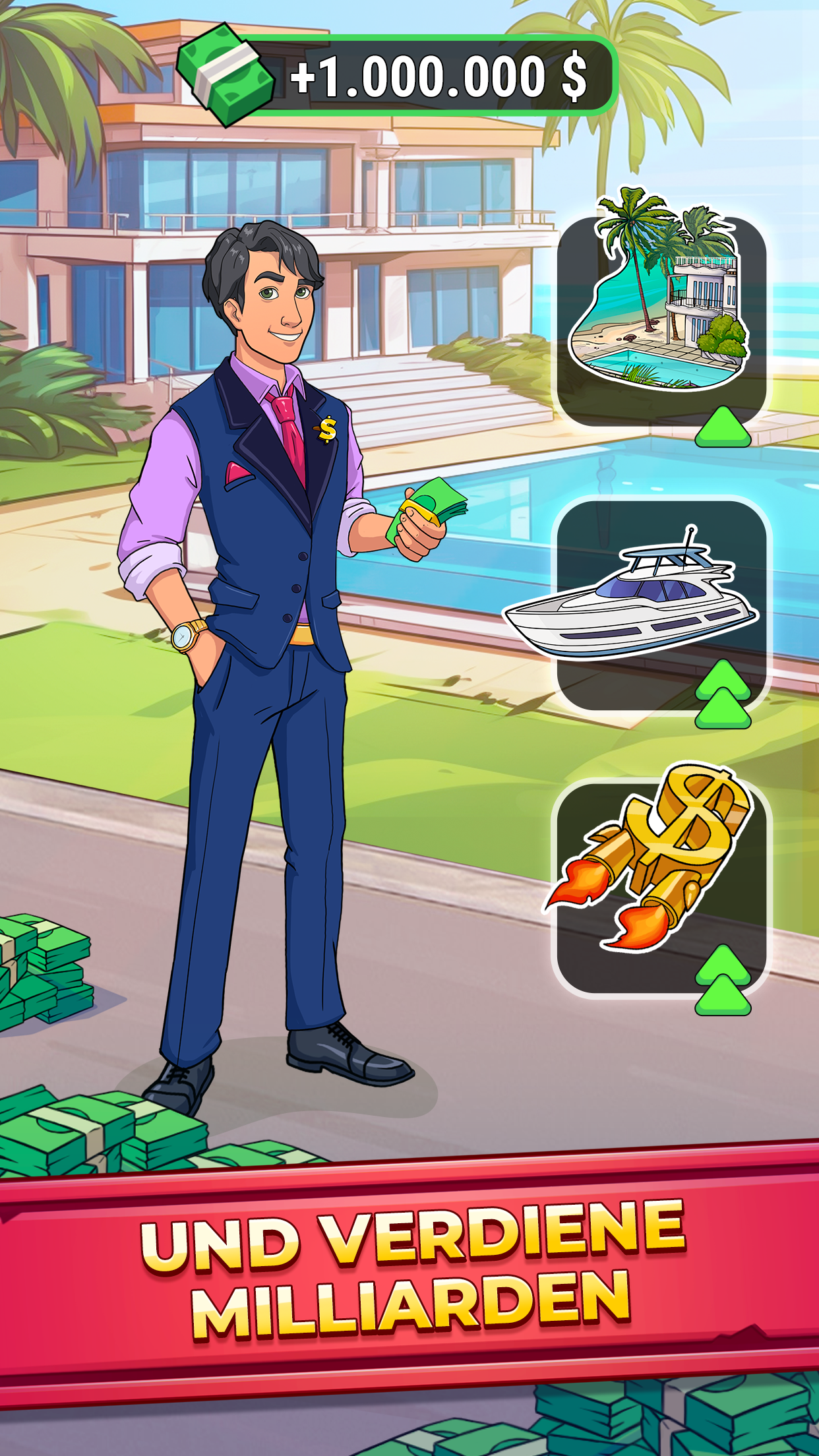 Hast du jemals davon geträumt, steinreich zu werden und wie ein millionenschwerer Tycoon zu leben? Spiele das Lebenssimulationsspiel, um von Null auf Hundert zu kommen und schreibe deine eigene Erfolgsgeschichte. Triff die richtigen Lebensentscheidungen und werde vom Tellerwäscher zum Millionär! FANGE VON GANZ UNTEN AN Hilf einem Arbeitslosen in diesem Idle-Lebenssimulator und mach ihn zum reichsten Menschen aller Zeiten! Der Weg von Armut zu Reichtum mag schwer sein, aber er ist sehr attraktiv, denn du kannst wählen, wo du studieren und arbeiten willst. Oder wirst du an der Börse oder im Casino spielen? BILDUNG FÜR EIN BESSERES LEBEN Schließe dein Studium ab und gewinne jeden Konflikt. Beginne deine Karriere vom Bettler aus und verbessere deinen Wissensstand. Wähle verschiedene Kurse, vom Verkaufsleiter bis zum Jurastudium. Freunde dich mit deinem Chef an und erhalte eine schnellere Beförderung. Das Geldsimulator-Spiel wartet auf dich! WERDE EIN ERFOLGREICHER KAPITALIST Werde ein Idle-Tycoon und finde heraus, wie es ist, ein reiches Leben zu führen. Entscheide, welche Art von Job du haben möchtest: Manager, Anlageberater, stellvertretender Direktor oder Startup-Finanzierer. Triff die richtigen Entscheidungen für deinen Helden. Willst du das große Geld machen und ein Milliardär werden? Tu es, sonst wird dein Sim am Ende auf der Straße verhungern. BESORG DIR DEINE EIGENE UNTERKUNFT Von der Straße in ein Wohnheim ziehen, hier mit mehr als 5 Leuten - macht Spaß, ist aber eng. Dann zieh in eine kleine, aber gemütliche Wohnung. In der Zukunft kannst du zwischen einem Stadthaus, einer Villa, einem Herrenhaus oder sogar einer privaten Insel auf Geldland wählen! Lebe das Leben des Simulator-Luxus! SCHAFFE EINE BEZIEHUNG Geh eine Beziehung ein, wähle das süßeste Hausfrauenmädchen aller Zeiten! Entscheide, ob du sie heiraten oder weiter nach dem Besten suchen willst. Ziehe zusammen ein, halte die Beziehung aufrecht und heirate schließlich! Bekomme Kinder und ziehe sie groß. KÜMMERE DICH UM DEINE GESUNDHEIT UND DEINE ZUFRIEDENHEIT Bringe den Prozentsatz der Gesundheits- und Zufriedenheits-Skala wieder auf ein stabiles Niveau. Erfülle die Wünsche des Charakters, damit der Zufriedenheits-Indikator stabil bleibt. RICH INC. LEBENSSIMULATOR SPIELMERKMALE: - Beginne als armer Bettler und versuche zu überleben; - Werde reich und verdiene so viel Geld wie du kannst; - Kaufe neue Kleidung, Wohnungen, Autos oder mache Investitionen; - Triff die richtigen Entscheidungen, um das Ziel zu erreichen und Milliardär zu werden - Sei der Lebenssimulator in diesem Money-Inc-Spiel; - Genieße einfaches Gameplay im Tycoon-Leben: Triff einfach Entscheidungen und tippe auf den Bildschirm. - Tippe dich von arm zu reich und werde der reichste Mensch; - Handle an der Börse oder gründe dein eigenes Unternehmen; - Werde Herr über dein Leben und sei glücklich! Nimm an diesem spannenden Spiel teil, verdiene Geld und genieße das Idle-Leben in einem 100-Jahre-Lebenssimulator. Baue eine große Karriere auf und verdiene viel Geld. Führe dein eigenes Unternehmen und werde Milliardär in unserem Geld-Business-Simulator-Spiel. Probiere den Lebensstil eines reichen Kapitalisten im Spiel Rich Inc. aus. Tippe dich zum Erfolg und fühle dich wie ein Tycoon!