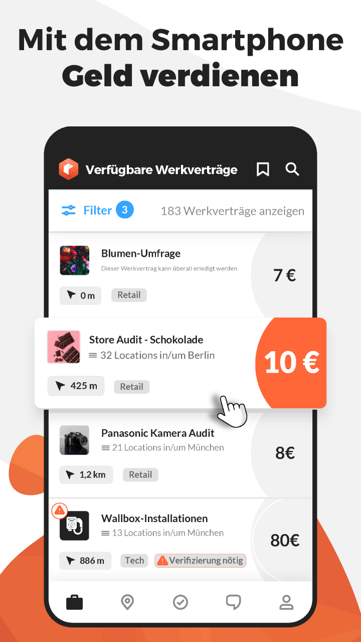 Lade die App kostenlos herunter und trete der Roamler-Community bei – die perfekte Möglichkeit, dein monatliches Budget aufzubessern und das in der Nähe deines Zuhauses!