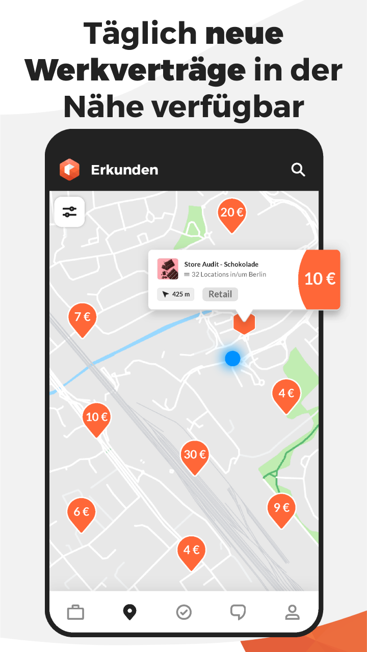 WIE FUNKTIONIERT ES?1. Buche einen Check 🎯Lokalisiere dich, wähle einen verfügbaren Check auf der Karte oder in der Check-Liste in deiner Nähe aus und nimm diesen an.