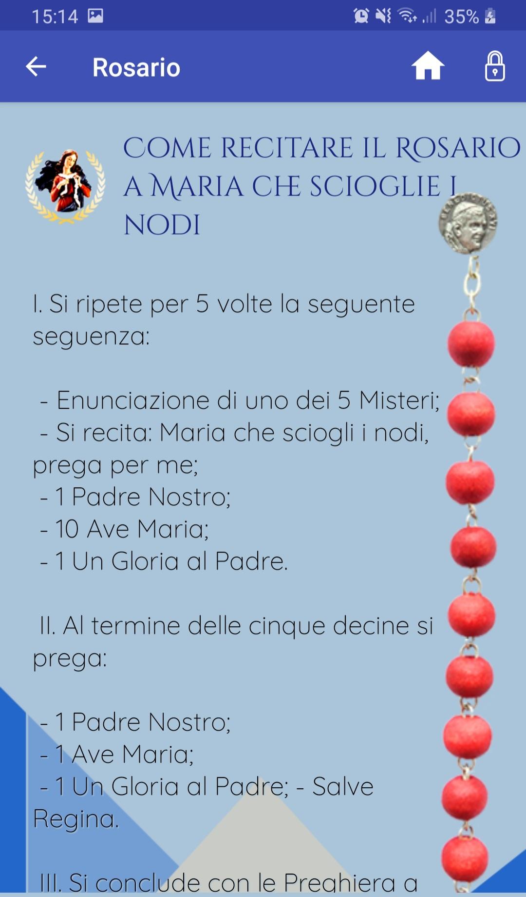 Diese App hat alle notwendigen Gebete, um Maria die Knoten zu lösen. Bewerbungsressource: https://www.tv2000.it/prega-con-noi/category/rosario-maria-che-scioglie-i-nodi/ Die Novene zu Maria zu beten, die die Knoten löst, bedeutet, alle Knoten unseres Lebens unserer himmlischen Mutter anzuvertrauen. Aber was sind Knoten? Mit dem Wort "Knoten" meinen wir all die Konflikte in unserem Leben, all die Probleme, die wir oft jahrelang mit uns herumschleppen und die wir nicht zu lösen wissen; all diese Sünden, die uns binden und uns daran hindern, Gott in unser Leben aufzunehmen und uns wie Kinder in seine Arme zu werfen; all diese Ressentiments, die es in unseren Familien schwierig machen, einander demütig und aufrichtig zu lieben; all diese Knoten, die unsere Seele ersticken, die uns niederreißen, die dem Herzen die Freude nehmen und auch den Willen zum Weiterleben. Die Jungfrau Maria übernimmt all diese Knoten, indem sie sie nacheinander löst. "Alle", erklärte der damalige Kardinal Bergoglio mehrmals, "wir haben Knoten im Herzen, Unzulänglichkeiten, wir haben Schwierigkeiten. Unser guter Vater, der allen seinen Kindern Gnade austeilt, möchte, dass wir ihr vertrauen, ihr die Knoten unseres Übels anvertrauen, die Verwicklungen unseres Elends, die uns daran hindern, uns mit Gott zu vereinen, damit sie sie und dich löst bringen uns ihrem Sohn Jesus näher, das ist die Bedeutung des Marienbildes "die Knoten lösen". Geschichte. 1986 war Papst Franziskus, damals einfacher Jesuitenpriester, für seine Doktorarbeit in Deutschland. Während einer seiner vielen Studienreisen nach Ingolstadt sah er das Bild der Jungfrau, das in der Kirche Sankt Peter die Knoten löste und verliebte sich sofort in es. Er war so beeindruckt, dass er einige Reproduktionen nach Buenos Aires mitbrachte, dass er begann, sie an Priester und Gläubige zu verteilen, was auf große Resonanz stieß. Eines der Bilder wurde an der Universität von El Salvador ausgestellt. Und genau von hier aus begann die Verbreitung der neuen Hingabe.