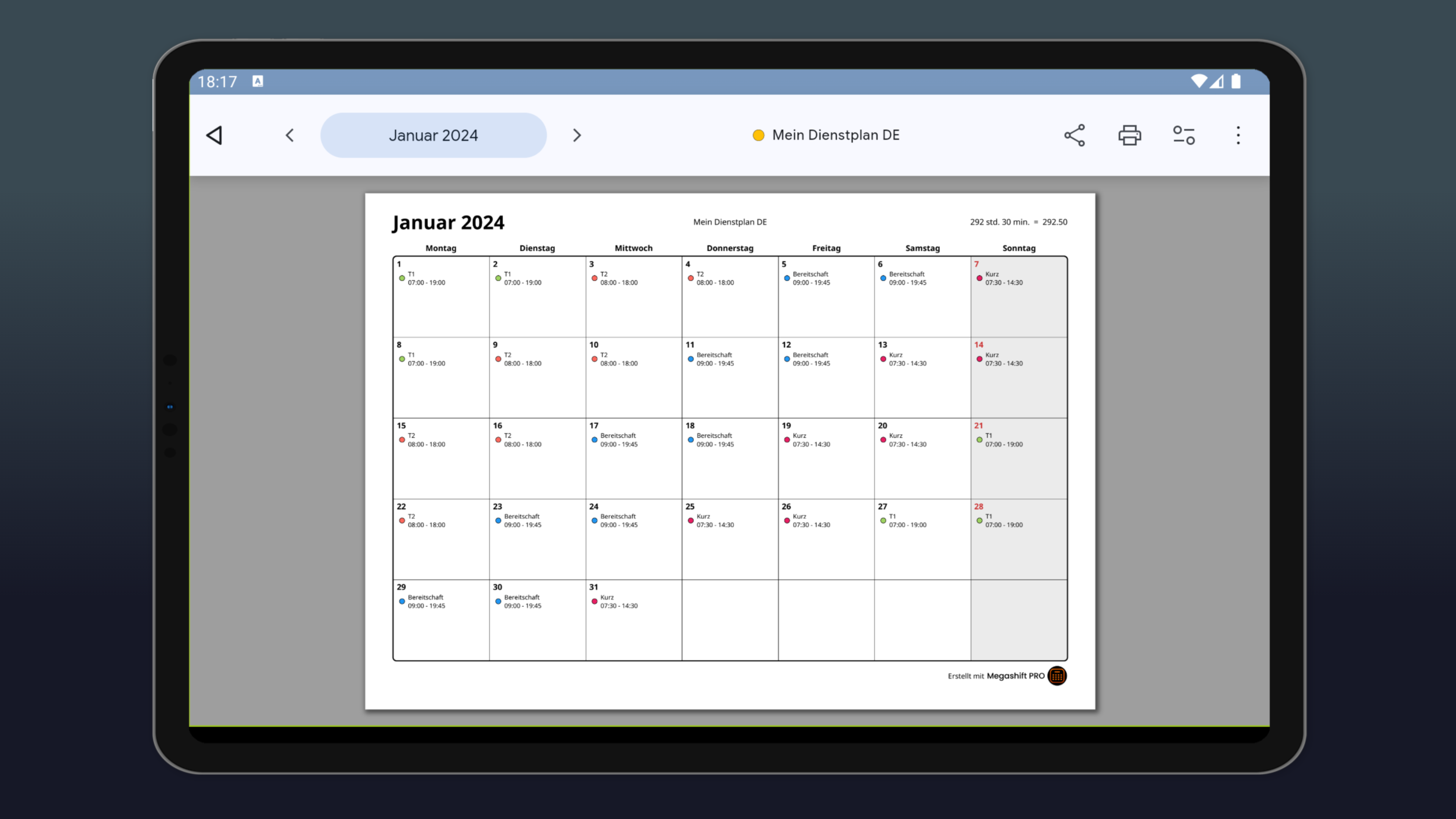 Mit Megashift verwaltest du deine Schichten, Arbeitszeiten und Kalendertermine effizient und intuitiv. Diese Dienstplan App wurde für Menschen entwickelt die Arbeit und Privatleben optimal organisieren möchten. Die wichtigsten Funktionen auf einen Blick: • Dienstplan erstellen & visualisieren Erstelle individuelle Schichtvorlagen (Früh-, Spät-, Nachtschicht, frei etc.) und füge sie unkompliziert in deinen Kalender ein. Die klare und benutzerfreundliche Oberfläche sorgt dafür, dass du deinen Schichtplan und deine Termine jederzeit im Blick behältst. • Stundenrechner Megashift berechnet deine Stunden für eingetragene Schichten automatisch – damit du deine Arbeitszeiten übersichtlich nachverfolgen kannst, ganz ohne manuelles Nachrechnen. • Wecker Lege für jede Schichtvorlage einen Wecker fest – z. B. 1 Stunde vor Schichtbeginn. Sobald du die Schicht in deinen Kalender einträgst, wird automatisch ein Wecker gestellt. • Statistiken Du siehst auf einen Blick die wichtigsten Zahlen zu deinem Schichtplan. Anzahl und geleistete Stunden pro Schicht im Monat/Jahr. Arbeitszeiten pro Tag, Stundenliste. Zusätzlich zeigt dir Megashift die Verteilung deiner Arbeitszeit an – so erkennst du schnell, wann und wie viel du tagsüber, nachts, an Feiertagen oder als Überstunden gearbeitet hast. • Rotationen Speichere wiederkehrende Schichtfolgen (z. B. 2 Früh – 3 Spät – 4 Nacht – 5 frei) und lasse sie automatisch für beliebige Zeiträume eintragen. Perfekt für feste Dienstpläne in Pflege, Polizei oder Produktion. • Dienstplan Teilen & Drucken (PRO) Erstelle hochwertige PDF Dateien und teile sie direkt aus der App – zum Beispiel per E-Mail oder Messenger. Alternativ kannst du die PDFs auch sofort ausdrucken. • Cloud Sync & Backup (PRO) Automatische Sicherung und Synchronisation über alle Geräte (iPhone, iPad, Android). Bei Gerätewechsel oder Verlust sind deine Daten sofort wieder da. • Externe Kalender integrieren (PRO) Google Calendar, Outlook, Apple Kalender & Co. nahtlos einbinden. Endlich alle Termine und Schichten, Arztbesuche, Geburtstage – an einem Ort. Für wen ist Megashift? Megashift ist ideal für: ✅ Menschen in Schichtarbeit (Pflege, Medizin, Rettungsdienst, Polizei, Produktion, Einzelhandel, Gastronomie etc.) ✅ Freiberufler & Selbstständige mit unregelmäßigen oder wechselnden Arbeitszeiten ✅ ALLE, die einen intuitiven Kalender suchen der Beruf und Privatleben perfekt zusammenbringt Weitere Highlights, die den Unterschied machen ✅ Vollständig offline nutzbar – keine Internetverbindung nötig ✅ Dark Mode – ideal für Nachtschichten und angenehme Augen ✅ Kontinuierliche Weiterentwicklung basierend auf echtem Nutzer-Feedback Lade Megashift jetzt kostenlos herunter und verwalte deinen Dienstplan endlich stressfrei und übersichtlich.