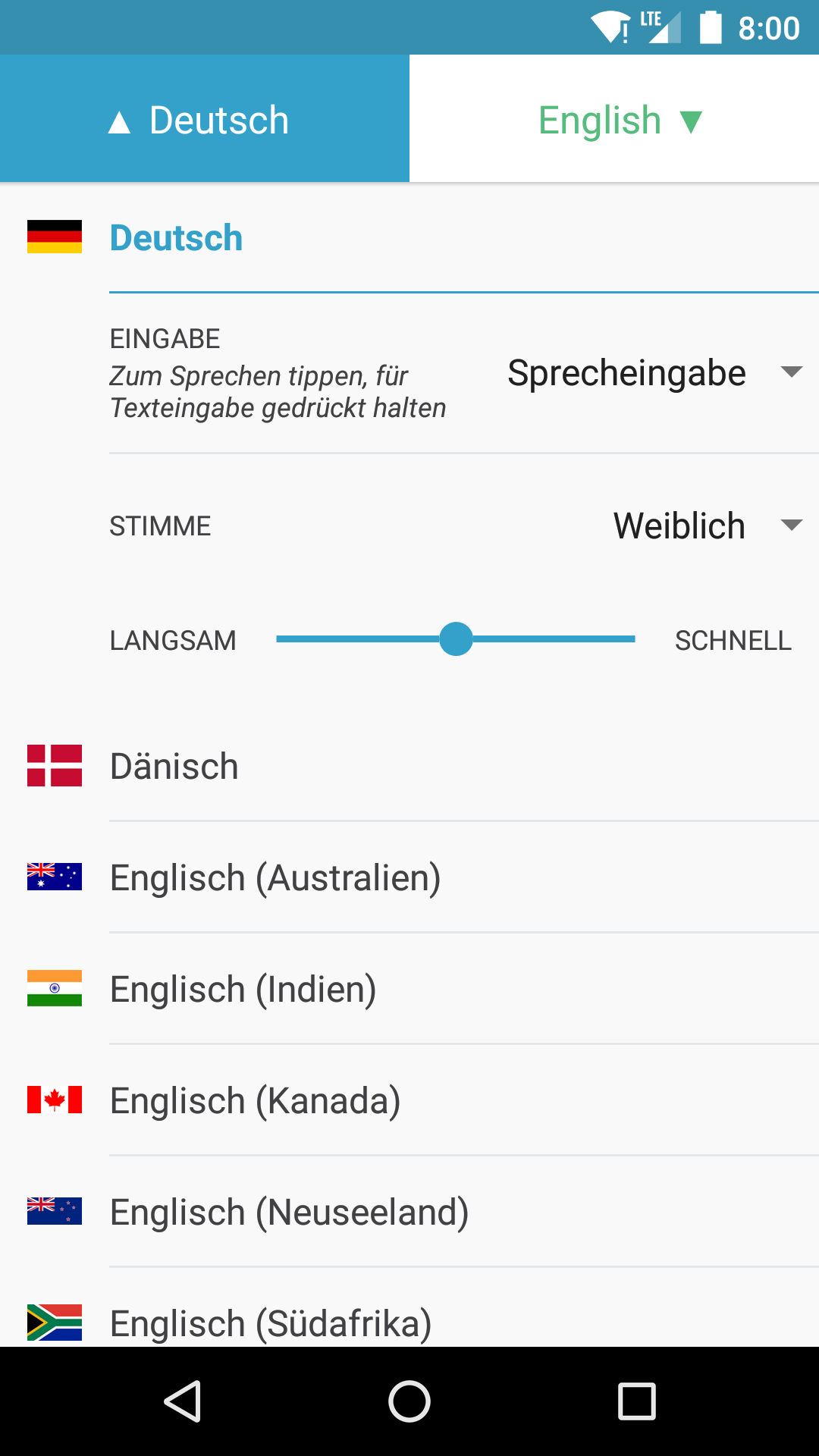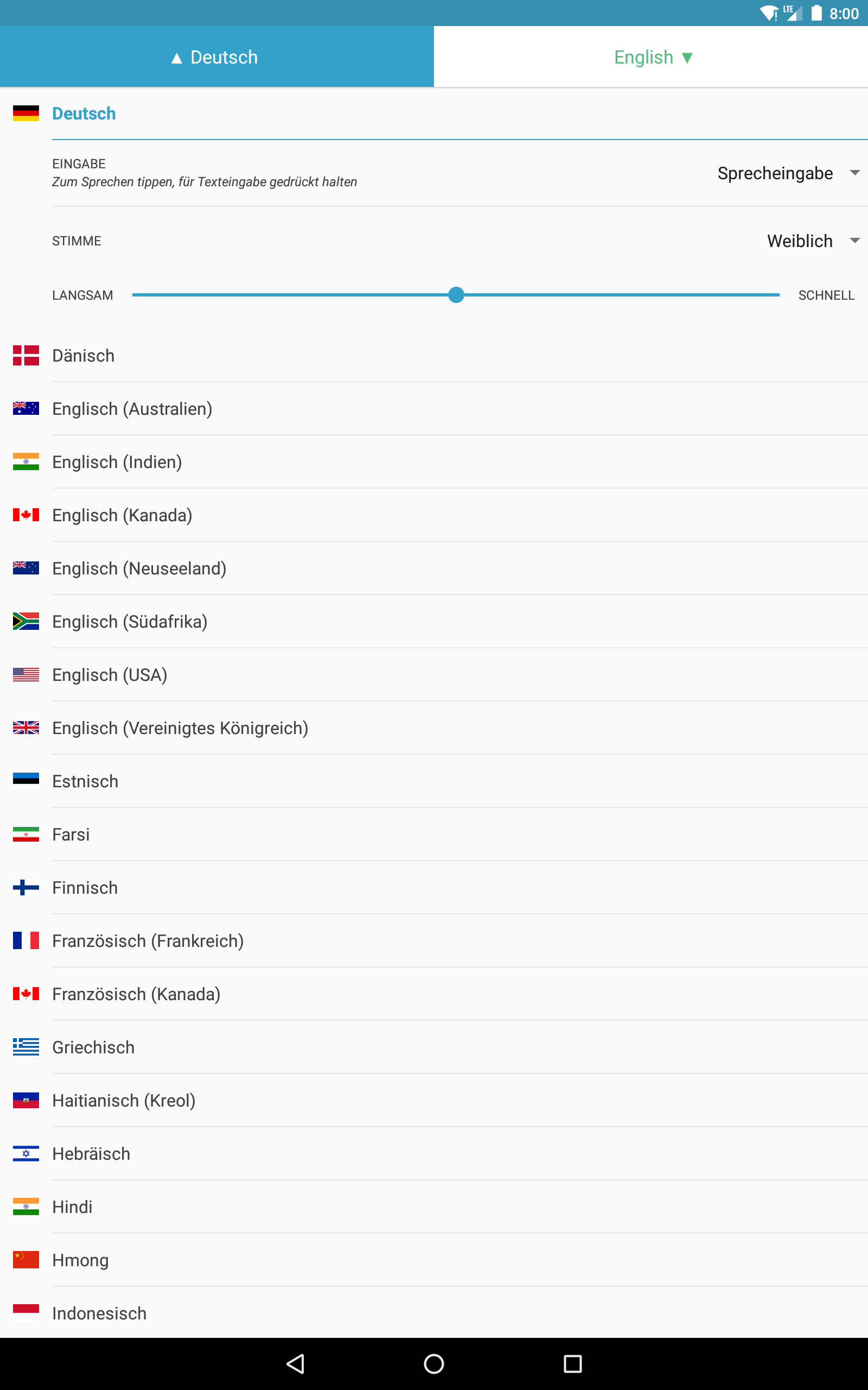 Schnelles Ändern der Sprache, Auswahl von Männer- oder Frauenstimmen (sofern verfügbar) und Beschleunigung oder Verlangsamung der Sprechgeschwindigkeit