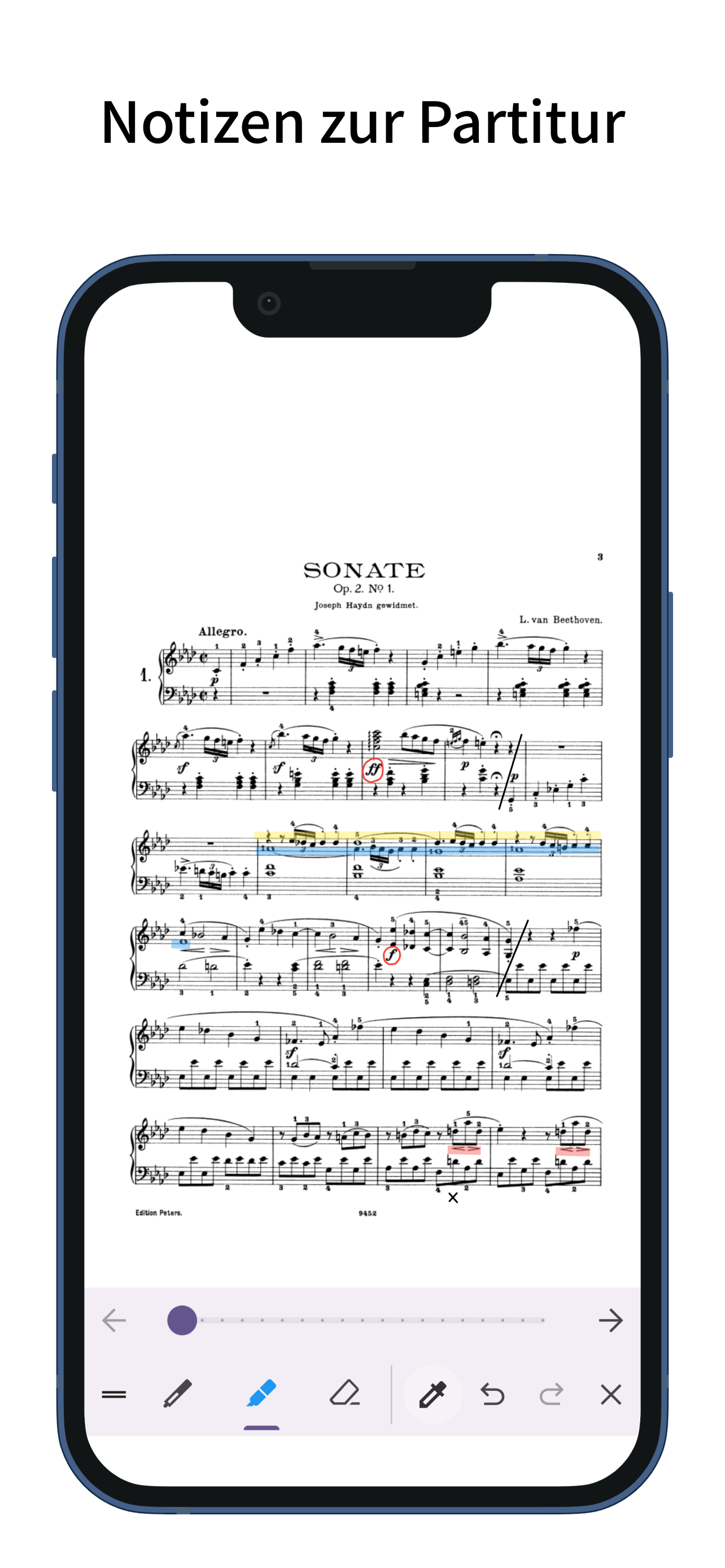 Eine Notenanzeige-App für einfaches Umblättern. Blättern Sie durch Ihre Noten per Tippen und Wischen. Sie können auch die Reihenfolge Ihrer Notenseiten ändern. Einfaches Umblättern - Sie können Seiten per Tippen und Wischen umblättern. - Unterstützt Bluetooth-Fußpedale zum Umblättern. - Die Tipperichtungen können auf „vorherige Seite“, „Links- /Rechts“, „Oben/Unten“, „nächste Seite“ oder „deaktiviert“ eingestellt werden. - Wischgesten können für oben, unten, links und rechts einzeln ein- oder ausgeschaltet werden. - Aktionen, die nicht dem Umblättern dienen (wie das Anzeigen des Menüs oder das Schreiben von Notizen), können Gesten zugewiesen werden, die das Umblättern nicht stören, beispielsweise langes Drücken oder Tippen an den oberen oder unteren Rändern. - Die Zoom-Funktion (Pinch oder Doppeltippen) für die Noten kann ebenfalls ein- oder ausgeschaltet werden. Seiten neu anordnen - Durch das Neuanordnen der Notenseiten wird das Umblättern bei Wiederholungen, Dal Segno, Codas und ähnlichen Situationen erleichtert. - Beim Hinzufügen von Seiten über die Neuanordnung können Sie mehrere Seiten gleichzeitig hinzufügen und per Drag & Drop verschieben – nicht nur eine. - Es ist auch möglich, Seiten zu löschen oder leere Seiten hinzuzufügen. Notizen auf Noten - Sie können handschriftliche Notizen auf Ihren Noten machen. - Zwei Stifttypen, Marker und ein Radiergummi stehen zur Verfügung, mit Funktionen zum Rückgängig- und Wiederherstellen. - Mit den Stiften und Markern können Sie die Linienstärke und -farbe wählen und gerade Linien zeichnen. - Ein Pipetten-Werkzeug ermöglicht es, Farben vom Bildschirm aufzunehmen. - Sie können ein PDF erstellen, das Ihre Notizen enthält. Setlist - Sie können mehrere Notenblätter zu einer Setlist zusammenfassen, um sie kontinuierlich anzuzeigen, ohne sie erneut öffnen zu müssen. - Durch Tippen auf den Titel in der Menüleiste wird die Liste der Noten in der Setlist angezeigt; ein Tippen springt zu dem jeweiligen Stück. Lesezeichen - Sie können Lesezeichen zu bestimmten Seiten Ihrer Noten hinzufügen. - Lesezeichen können individuelle Titel erhalten. - Durch Tippen auf den Titel in der Menüleiste wird eine Liste der Lesezeichen angezeigt; ein Tippen springt zu der entsprechenden Seite. Seitenlayout - Sie können für Ihre Noten zwischen den Layouts Einzelseite, Doppelseite, an die Breite anpassen, an die Höhe anpassen, halbe Seite (oben/unten) oder halbe Seite (links/rechts) wählen. - Das Layout kann sich je nach Bildschirmausrichtung automatisch ändern. - Wenn Sie "an die Breite anpassen" wählen, werden die Noten in voller Bildschirmbreite angezeigt, was die Ansicht auf kleinen Geräten erleichtert. Farbfilter - Sie können einen Farbfilter auf Ihre Noten anwenden, wobei Sie zwischen Sepia, Grün oder Invertiert wählen können. - Wenn Ihnen das Weiß der Noten zu grell erscheint, kann diese Einstellung die Lesbarkeit verbessern. Noten hinzufügen - Sie können Noten im PDF-Format hinzufügen. - In der Notenübersicht ermöglicht das Drücken der Plus-Schaltfläche in der rechten unteren Ecke das Hinzufügen von PDF-Dateien von Ihrem Gerät. (Im Setlist-Bereich öffnet die Plus-Schaltfläche den Bildschirm zum Hinzufügen einer Setlist.) - Sie können Noten auch hinzufügen, indem Sie PDF-Dateien aus anderen Apps teilen. - Mehrere Notenblätter können gleichzeitig hinzugefügt werden. Noten verwalten - Mit der Label-Funktion können Sie Noten oder Setlists mit Labels versehen, sodass eine Filterung mit mehreren Labels möglich ist. - Durch Tippen auf die Suchleiste können Sie Noten oder Setlists nach Titel durchsuchen. - Noten und Setlists können nach Titel, Erstellungsdatum oder letzter Ansicht sortiert werden. Anpassung - Unterstützt den Dunkelmodus. - Ermöglicht die Änderung der Themenfarbe. - Verfügt über ein schlichtes Design, das den Material Design-Prinzipien entspricht.