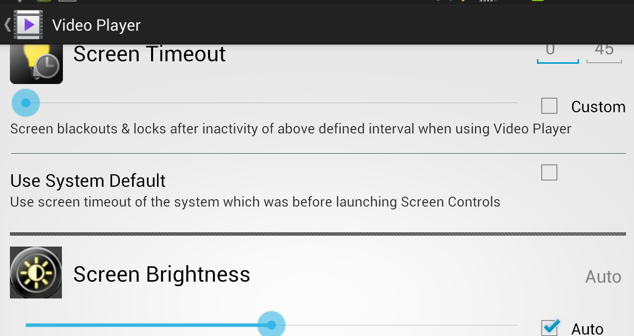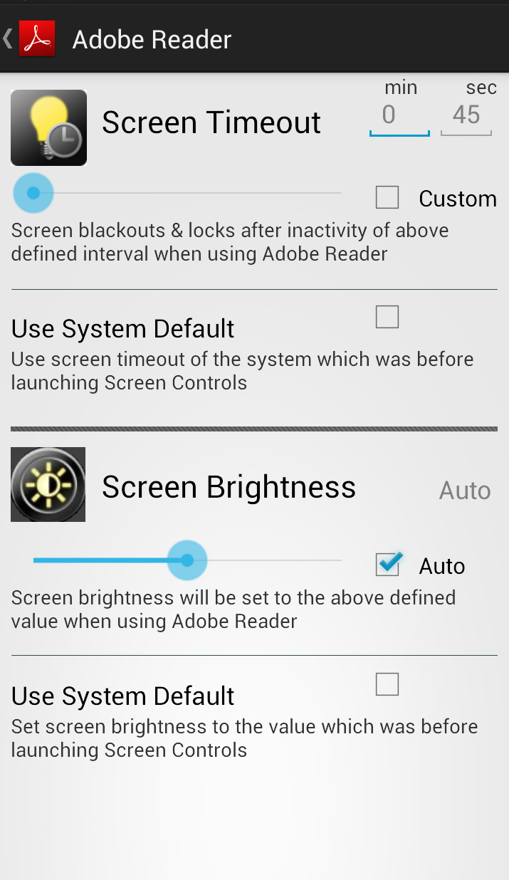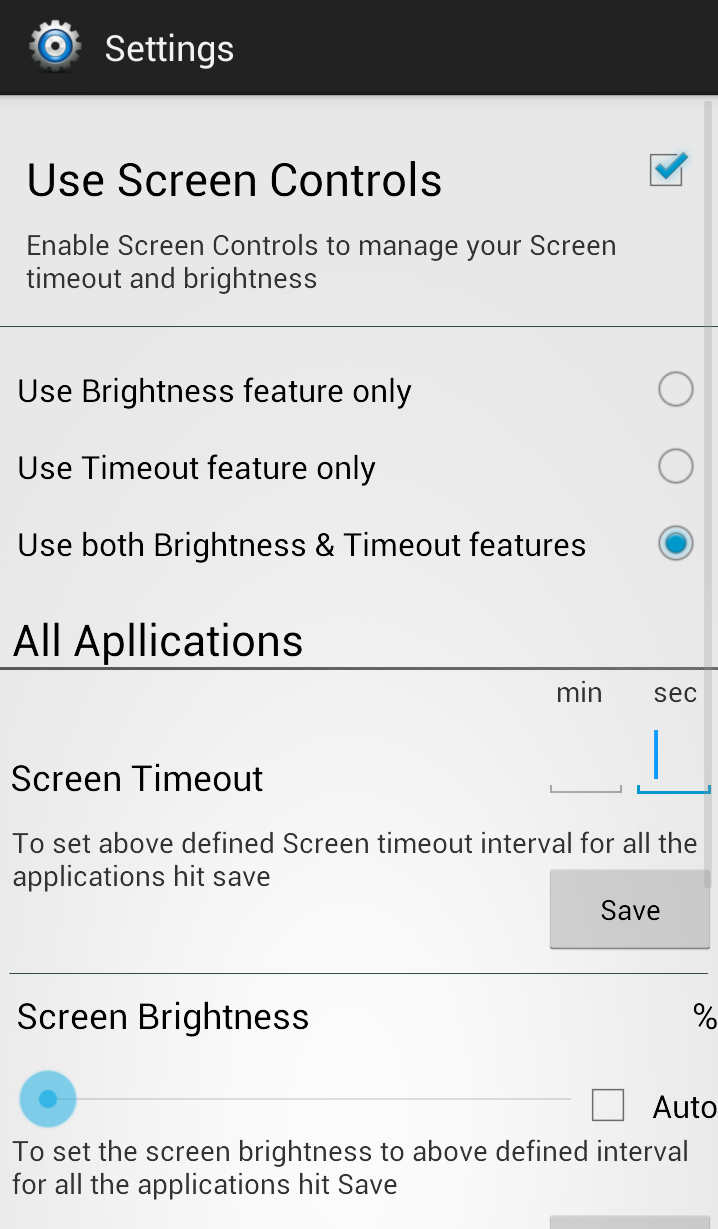 NOTE Please make sure to Uninstall the previous version of Screen Controls in order to avoid conflicts (Strongly recommended) Take customization to the limits with “Screen Controls” control the screen of your android smart phone or tablet For each Application on your device according to your needs. With “Screen Controls” customize Screen brightness & Screen timeout For each application on your device, So now Each Application on your device can have its own Screen brightness & Screen Timeout which is chosen by ‘you’. Easy to use User Interface helps you find & customize the application for its timeout & brightness. Features • Set Screen timeout for each app on the device ( by default it is set to 45 seconds for each app). • Set Screen Brightness for each app on the device ( by default it is set to Auto for each app ). • You can use system settings for any application you like. • Gives the option to get running after boot up so that there is no need to start the application service again by launching “Screen Controls”