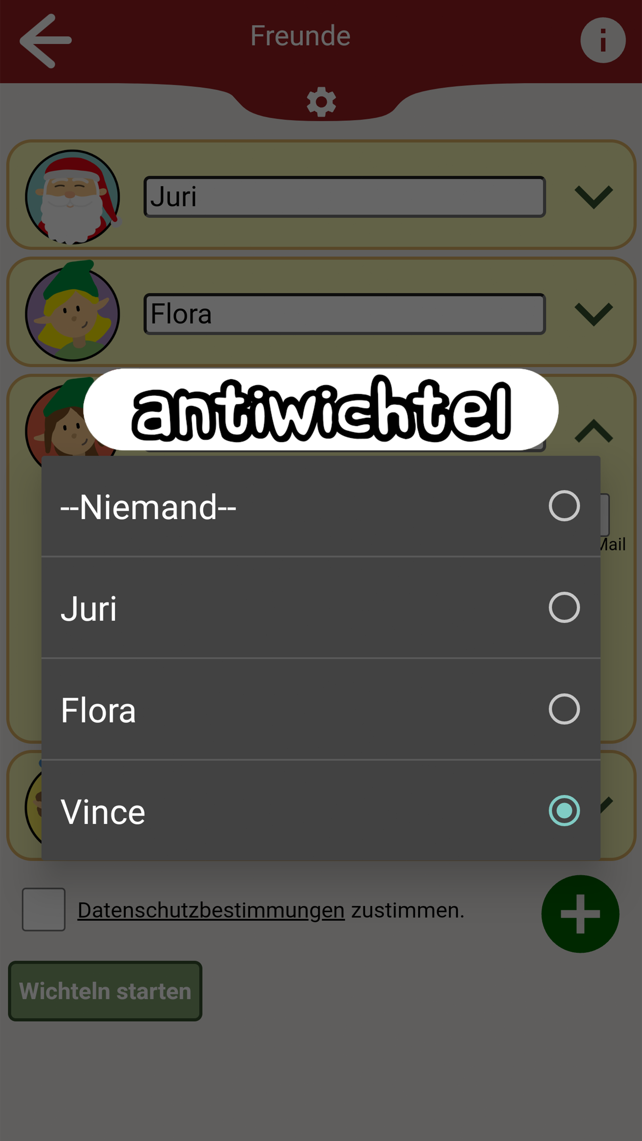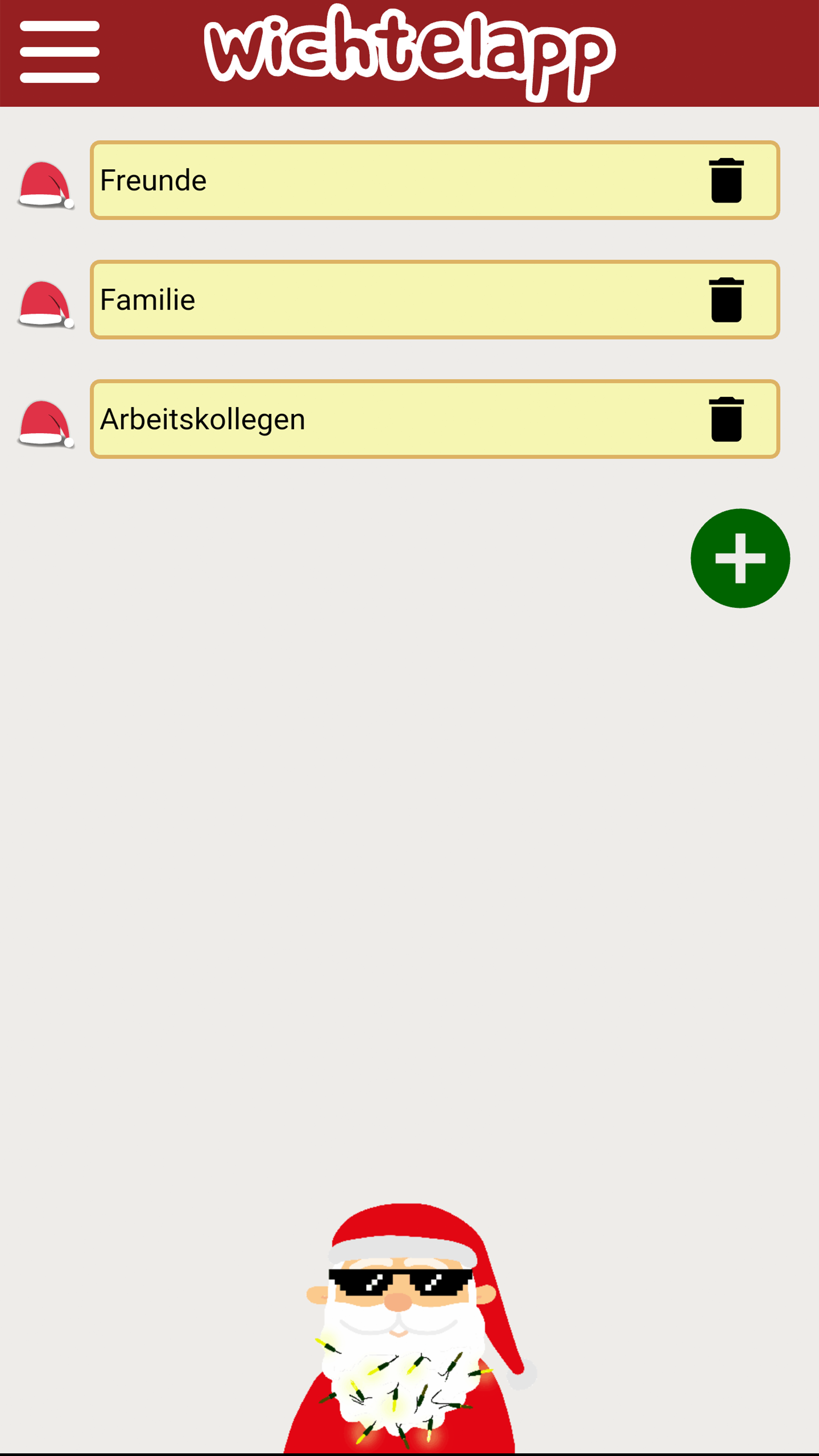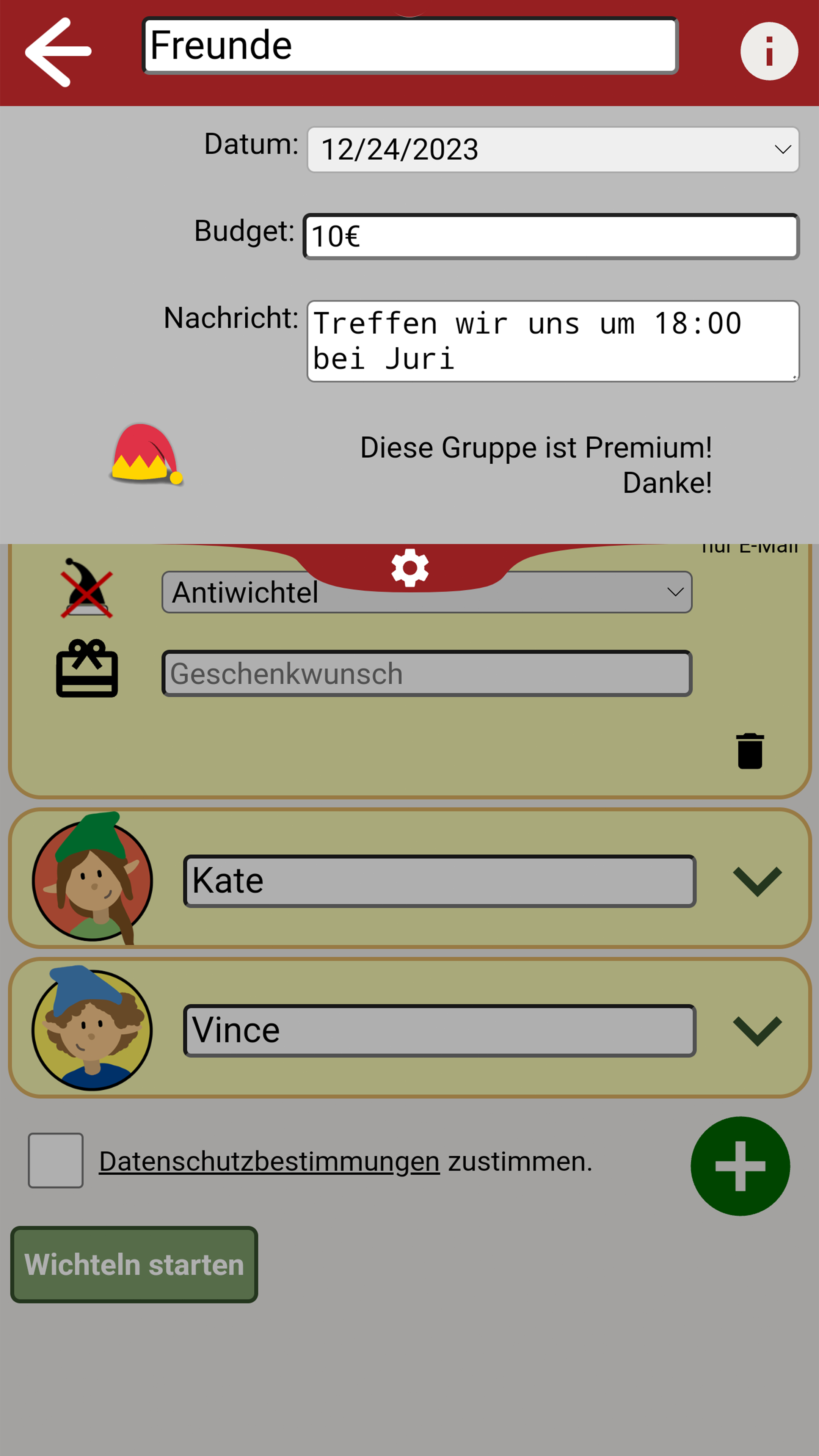 Hohoho... 🎅 schon bald steht Weihnachten vor der Tür. 🎄 Damit ihr stressfrei durch die schöne Weihnachtszeit kommt, hilft diese App das Wichteln für euch so einfach wie möglich zu machen! In der App können mehrere Gruppen erstellt werden, in denen dann jeweils ausgelost wird wer wen beschenkt. Diese Wichtel App kann sowohl beim gemütlichen zusammensitzen mit Freunden und Familie als auch zum Online-Wichteln über E-Mail, SMS oder verschiedene Messanger verwendet werden. Wichteln ist eine bekannte Weihnachtstradition, die auch unter folgenden Namen bekannt ist: Secret Santa, Engerl-Bengerl, Julklapp, Kris Kringle, Chris Kindle (Christkind), Amigo Secreto, Monito-Monita, Angelito. Besonders in Zeiten wie diesen, kann man es mit Hilfe der App vermeiden sich persönlich zu treffen und die Wichtel-Ergebnisse gemütlich online versenden. Funktionen: ✔ Lokales-Wichteln: Das Wichteln erfolgt, während alle Wichtel anwesend sind. Nicht-anwesende bekommen ihren Zufallswichtel per Mail oder einen anderen Messenger. ✔ Fern/Online-Wichteln: Alle Wichtel bekommen ihr Ergebnis per Mail. ✔ Zufallsgenerator Der intelligente Zufallsgenerator verhindert eine Selbstziehung und ermöglicht die Bestimmung von Antiwichteln. ✔ Antiwichtel: Weißt du einem Wichtel einen Antiwichtel zu wird er/sie diesen nicht bei der Verlosung ziehen. (praktisch für Pärchen oder auch den Wichtel des Vorjahres) ✔ Die App kann komplett ohne Registrierung verwendet werden. ✔ Optionales versenden der Ergebnisse per E-Mail, SMS oder verschiedene Messenger Apps. ✔ Man kann einzelne Geschenkswünsche hinzufügen, um seinem Wichtel einen Hinweis zu geben. ✔ Es können zu jeder Gruppe weitere Informationen (z.B. Event Datum, Budget oder eine Nachricht) angegeben werden. Viel Spaß beim Wichteln! Ein Projekt von JHSV mit Vincent Haupt und Juri Seelmann.