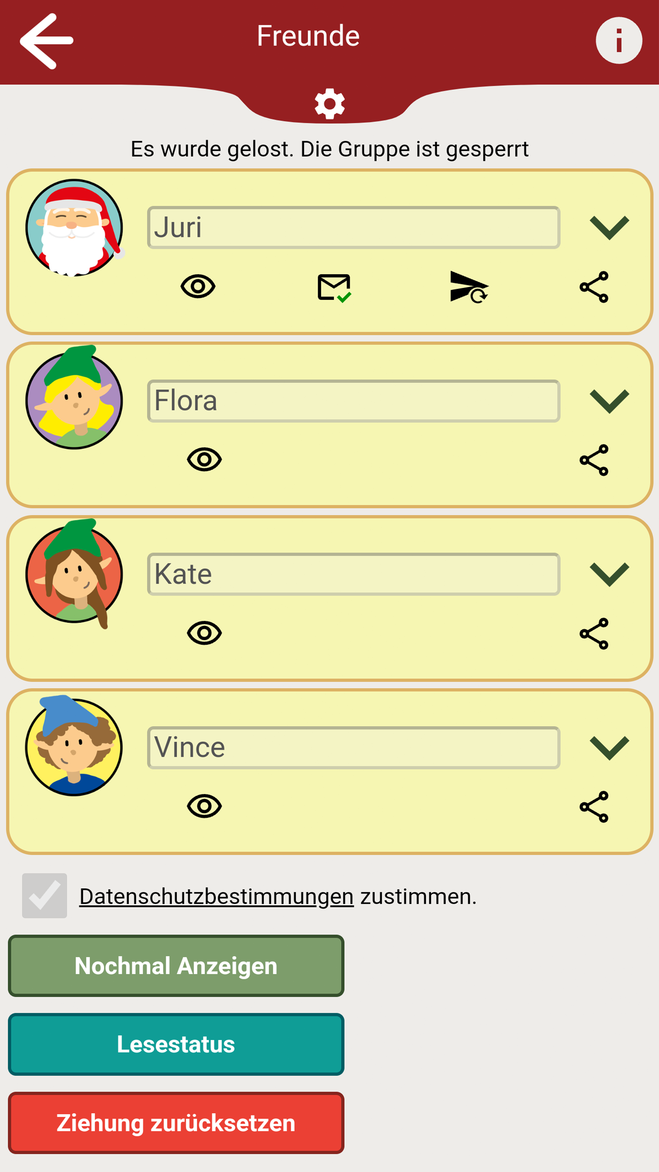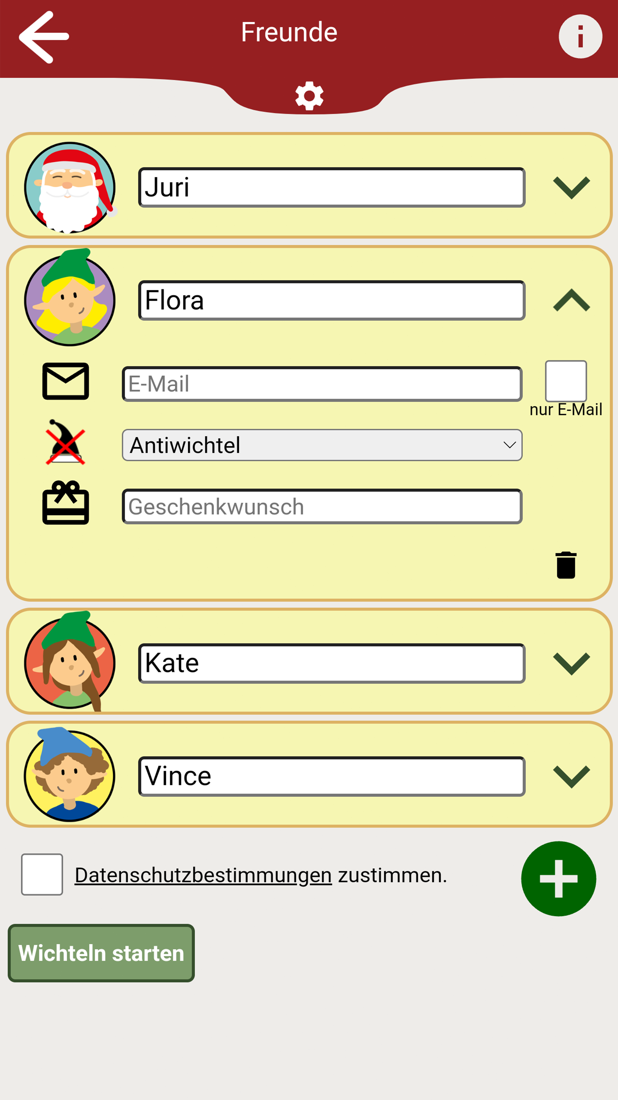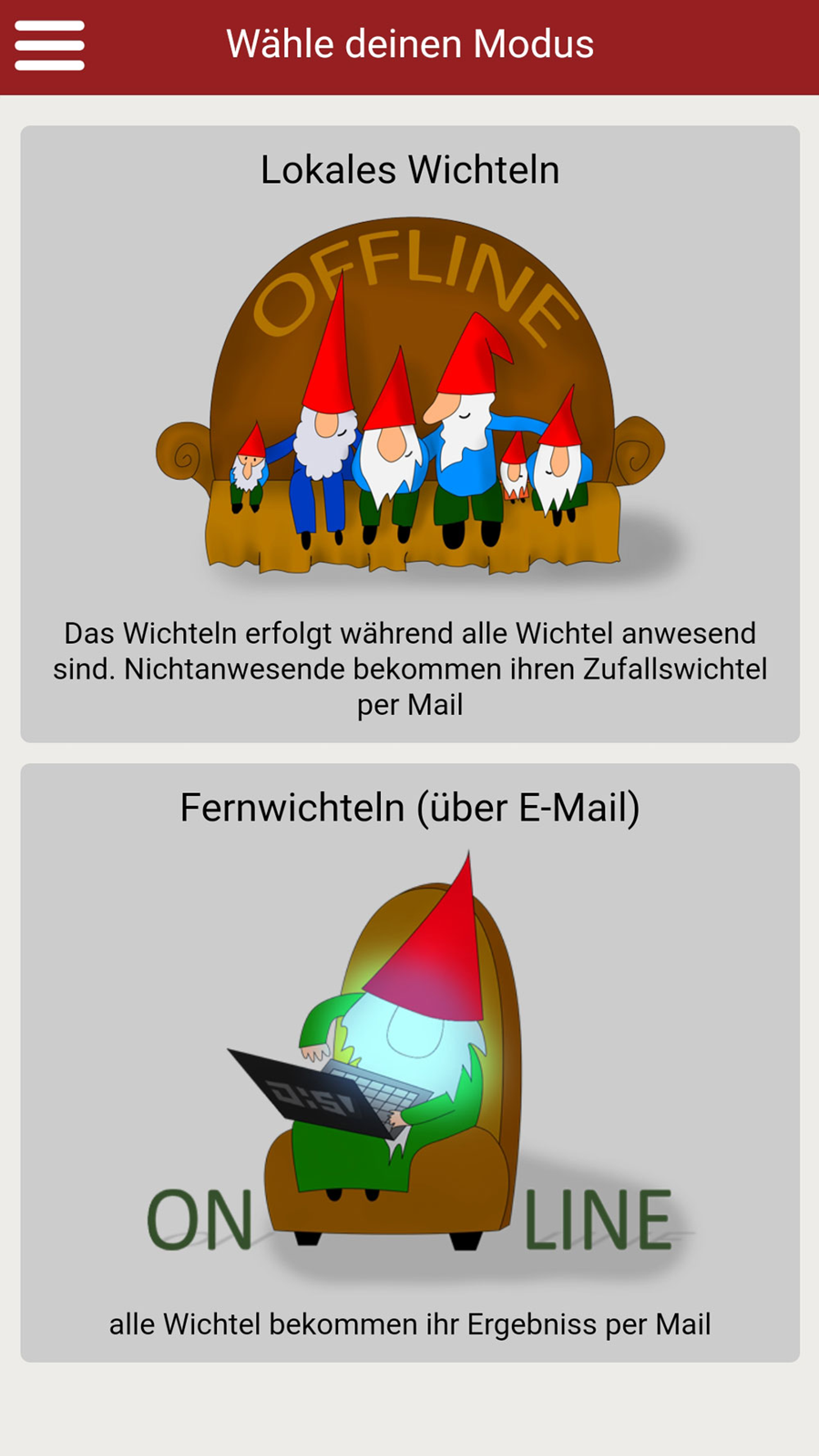 Hohoho... 🎅 schon bald steht Weihnachten vor der Tür. 🎄 Damit ihr stressfrei durch die schöne Weihnachtszeit kommt, hilft diese App das Wichteln für euch so einfach wie möglich zu machen! In der App können mehrere Gruppen erstellt werden, in denen dann jeweils ausgelost wird wer wen beschenkt. Diese Wichtel App kann sowohl beim gemütlichen zusammensitzen mit Freunden und Familie als auch zum Online-Wichteln über E-Mail, SMS oder verschiedene Messanger verwendet werden. Wichteln ist eine bekannte Weihnachtstradition, die auch unter folgenden Namen bekannt ist: Secret Santa, Engerl-Bengerl, Julklapp, Kris Kringle, Chris Kindle (Christkind), Amigo Secreto, Monito-Monita, Angelito. Besonders in Zeiten wie diesen, kann man es mit Hilfe der App vermeiden sich persönlich zu treffen und die Wichtel-Ergebnisse gemütlich online versenden. Funktionen: ✔ Lokales-Wichteln: Das Wichteln erfolgt, während alle Wichtel anwesend sind. Nicht-anwesende bekommen ihren Zufallswichtel per Mail oder einen anderen Messenger. ✔ Fern/Online-Wichteln: Alle Wichtel bekommen ihr Ergebnis per Mail. ✔ Zufallsgenerator Der intelligente Zufallsgenerator verhindert eine Selbstziehung und ermöglicht die Bestimmung von Antiwichteln. ✔ Antiwichtel: Weißt du einem Wichtel einen Antiwichtel zu wird er/sie diesen nicht bei der Verlosung ziehen. (praktisch für Pärchen oder auch den Wichtel des Vorjahres) ✔ Die App kann komplett ohne Registrierung verwendet werden. ✔ Optionales versenden der Ergebnisse per E-Mail, SMS oder verschiedene Messenger Apps. ✔ Man kann einzelne Geschenkswünsche hinzufügen, um seinem Wichtel einen Hinweis zu geben. ✔ Es können zu jeder Gruppe weitere Informationen (z.B. Event Datum, Budget oder eine Nachricht) angegeben werden. Viel Spaß beim Wichteln! Ein Projekt von JHSV mit Vincent Haupt und Juri Seelmann.