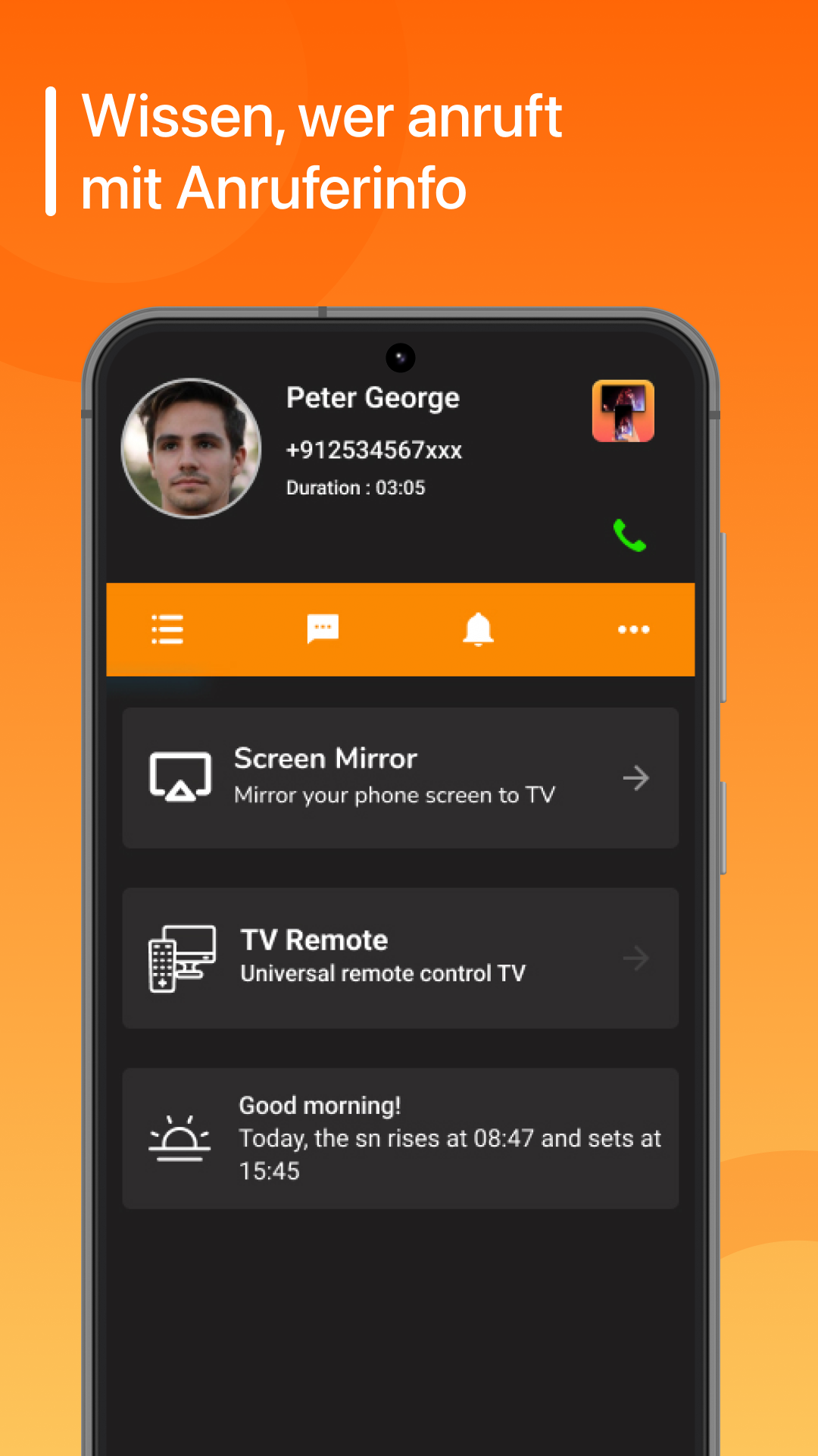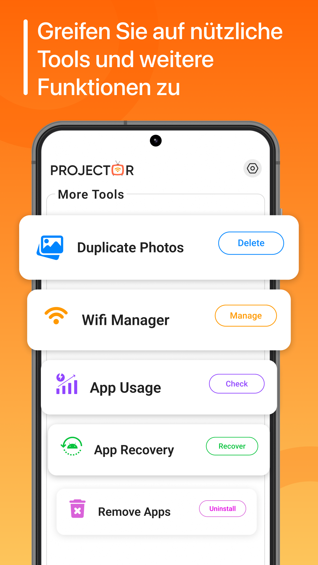Der Projector-Screencast to TV ist eine mobile Bildschirmspiegelungs-App, mit der Sie Ihren Telefonbildschirm in hoher Qualität spiegeln und Dateien einfach direkt freigeben können. CALL ACTIVITY SCREEN oder CALLER ID Erhalten Sie Anrufinformationen in Echtzeit, während Sie Ihren Bildschirm werfen. Mit dieser App können Sie Ihre Musik, lokale Fotos/Videos und Online-Videos auf den Smart-TV übertragen. Sie können auch Ihre Lieblingsfernsehsendungen ansehen, Live-Streams und Spiele auf dem großen Bildschirm spielen und Ihr mobiles Gerät auf Ihrem Home TV spiegeln und während der Verwendung dieser App auf die Gerätebenachrichtigungen zugreifen. Diese mobile Bildschirmspiegelungsanwendung ist perfekt für - Erstellung einer effektiven Präsentation in einer Geschäftsbesprechung oder einer Screen-Sharing-Sitzung. - Teilen Sie Gesundheits- und Fitnessvideos mit dem Heimfernsehen, damit Sie besser trainieren können. - Spiegeln Sie den Telefonbildschirm auf Ihren Heimfernseher, einschließlich Spiele, Live-Streams und andere beliebte mobile Apps. - Übertragen Sie Online-Videos vom Handy mit Chromecast auf das Heim-TV, damit Sie Webvideos auf der TV-App ansehen können. - Sehen Sie sich Ihre Lieblingssendungen, Filme und Live-Kanäle auf einem größeren Fernsehbildschirm an. - Werfen Sie Ihre Familienfotos und Reisefotos auf einer Familienfeier ins Fernsehen. - Spielen Sie Musik von Ihrem Telefon auf Ihren Heimfernseher ab. - Diese Screencast-App unterstützt mehrere Sprachen. WA Status Saver: Mit dieser Mira-Cast-App können Sie den WA-Status auch mit einem Tippen speichern und direkt aus der Screencast-App freigeben. Alarm für neue Funktionen Die Universal-TV-Fernbedienung verwandelt Ihr Smartphone in eine TV-Fernbedienung, so dass Sie Ihren Fernseher mit einem einfachen Tippen steuern können. Keine verlegten Fernbedienungen mehr! Keine wechselnden Batterien mehr! Ihr Smartphone dient jetzt als Ihre TV-Fernbedienung, die normalerweise in Reichweite ist. Genießen Sie ein vertrautes Erscheinungsbild mit den gleichen Tasten und der gleichen Benutzeroberfläche und entdecken Sie gleichzeitig neue Funktionen. Es spielt keine Rolle, was Sie verwenden, da es universell mit allen großen Smart-TV-Marken und Roku TV funktioniert. Hinweis: Ihr Telefon und Ihr Smart-TV müssen sich im WiFi-Netzwerk befinden, damit die Fernbedienung funktioniert. Wie verwende ich Projector-Screencast zum Fernsehen? 1. Installieren Sie die Bildschirmspiegelungs-App, Projector-Cast to TV auf Ihrem Android-Handy. 2. Stellen Sie sicher, dass Ihr Telefon und Ihr Fernseher/Monitor mit demselben WLAN-Netzwerk verbunden sind. 3. Klicken Sie auf "Start", um mit dem Scannen in der Cast-App für Fernseher/Monitore in der Nähe zu beginnen. 4. Wählen Sie das Gerät aus, das Sie screencasten möchten. 5. Sie können die Bildschirmspiegelung stoppen, indem Sie auf "Stopp" drücken. Was tun, wenn die Chromecast-App abstürzt? Wenn die Projektor-App abstürzt, reinigen Sie bitte die Daten der Chromecast-App, indem Sie in die Einstellungen gehen. Wenn es nicht hilft, installieren Sie die Bildschirmspiegelungs-App neu und starten Sie Ihr Telefon neu. Wenn das Problem trotzdem weiterhin besteht, wenden Sie sich bitte an den Screencast-Support. Intelligent Tools 1) Duplicate Photo Cleaner - Reinigen Sie Duplikate oder Replikate mit Leichtigkeit. 2) Junk Cleaner - Reinigen Sie Junk effektiv und effizient. 3) WiFi-Manager - Verwalten Sie WiFi-Netzwerke, Internetgeschwindigkeit, WiFi-Verbindungsmetriken. 4) App-Nutzung - Beobachten Sie die App-Metriken, die Zeitnutzung, die Datennutzung usw. 5) Batch Uninstaller - Deinstallieren Sie Apps in Stapeln. 6) App-Wiederherstellung - Stellen Sie deinstallierte Apps problemlos wieder her.