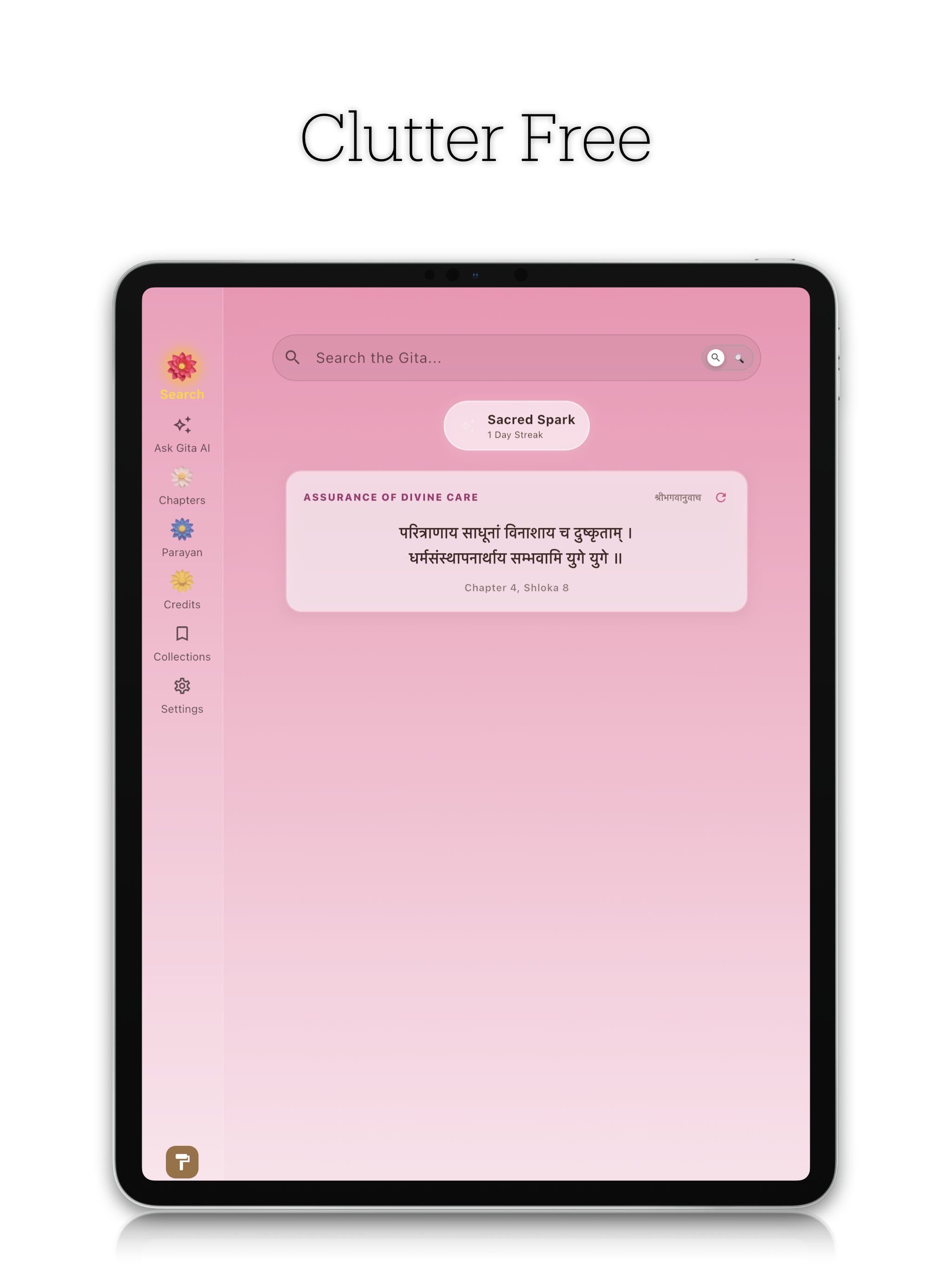 Begeben Sie sich auf eine spirituelle Reise mit der Shrimad Bhagavad Gita, dem ultimativen Leitfaden für Leben, Motivation und zeitlose Weisheit. Entdecken Sie den göttlichen Dialog zwischen Arjuna und Krishna mit modernen Tools für das digitale Zeitalter. Ob Sie sie nun Geeta oder Gita nennen – diese wunderschön gestaltete App ist Ihr Begleiter für tägliches Lesen, tiefgehendes Studium und innere Ruhe. ✨ Neue Flaggschiff-Funktionen: 🤖 Fragen Sie die Gita-KI: Haben Sie eine Lebensfrage? Suchen Sie nach spiritueller Klarheit? Nutzen Sie unsere fortschrittliche KI, um personalisierte Anleitungen und Antworten direkt aus den Lehren der Shrimad Bhagavad Gita zu erhalten. 📈 Aura-Aufstieg: Ihr Seelenwegplan: Verfolgen Sie Ihre spirituelle Disziplin mit dem neuen System „Tägliche Streaks“. Entwickeln Sie Ihren „Seelenstatus“ und Ihre Aura, während Sie die Kapitel der Gita lesen. ✨ Hauptfunktionen: 🔍 Unübertroffene Suchfunktionen: Umfassende Suche in Shlokas, Anvas, Tikas oder Meisterkommentaren. Unterstützung mehrerer Schriftsysteme: Suche in Hindi, Englisch, Sanskrit, Gujarati, Telugu, Kannada, Bengali und Tamil. Phonetische Suche: Finde Verse mithilfe englischer Wörter (z. B. „Karma“, „Dharma“, „Yoga“). 📖 Intensives Lesen & Lernen: Entdecke jeden Shloka mit Wort-für-Wort-Bedeutung (Anvay), Bhavarth und Kommentaren von Experten. 🎧 Perfekte Rezitation & Audio: Höre reinen Sanskrit-Gesang mit einem neuen Suchplayer, Hintergrundwiedergabe und intelligenten Wiederholungsmodi zum Auswendiglernen. 🌅 Tägliche Inspiration & Widgets: Beginne deinen Tag mit einer schönen Shloka-Karte oder bringe die Weisheit der Bhagavad Gita mit unserem neuen täglichen Widget auf deinen Startbildschirm. 🤝 Teile die Weisheit: Erstelle beeindruckende Karten und ansprechende QR-Codes zum Teilen, um Freunde und Familie mit Shlokas zu inspirieren. ⚡ Offline & Optimiert: Lies die gesamte Bhagavad Gita offline. Optimiert für alle Geräte mit vollständiger Unterstützung des Dunkelmodus für ein komfortables und ungestörtes Erlebnis. Diese App ist Ihr moderner Begleiter, um die Herausforderungen des Lebens mithilfe der zeitlosen Lehren Krishnas zu meistern. Jetzt herunterladen und Ihren Aura-Aufstieg beginnen.