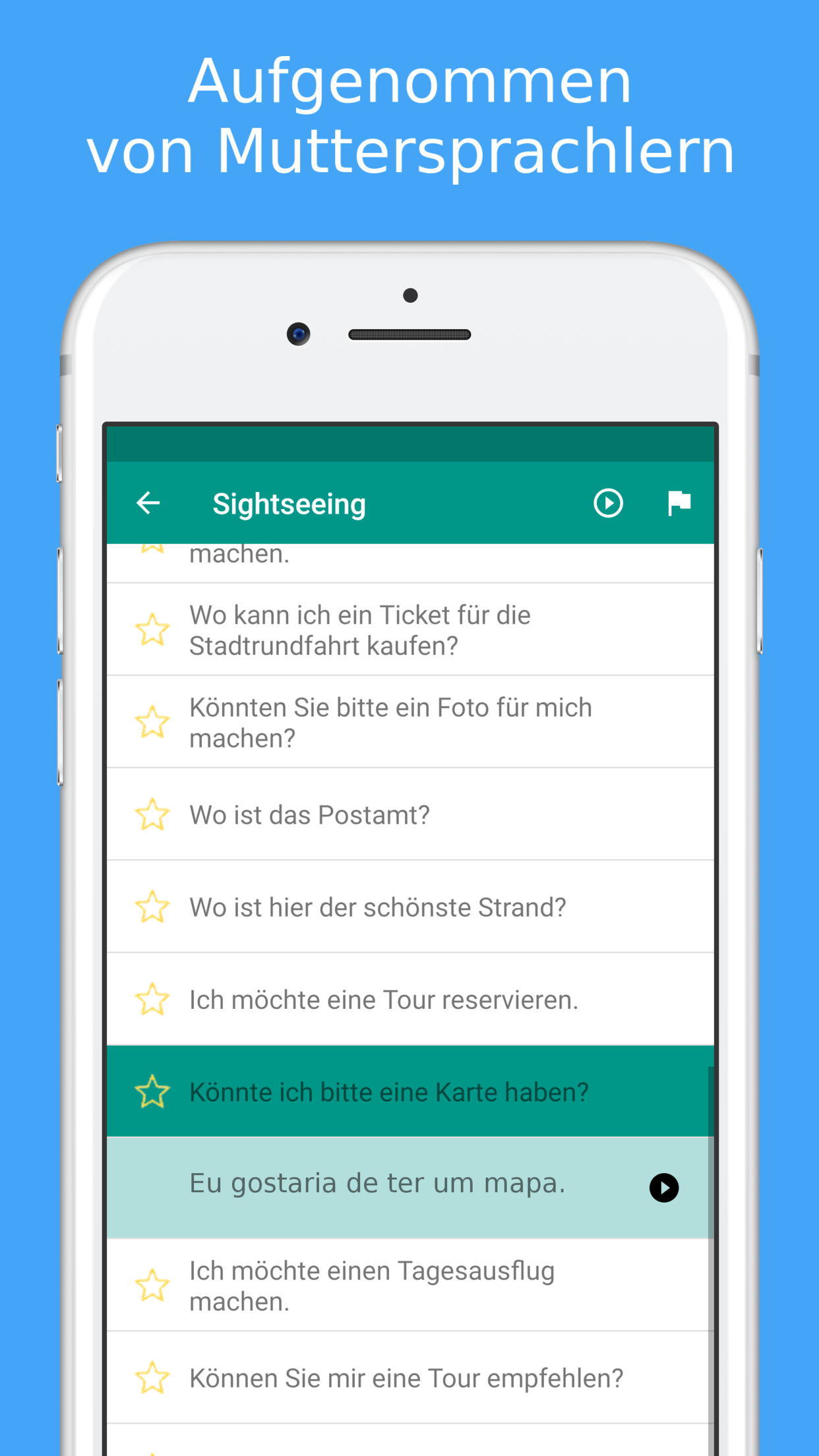 einer Muttersprachlerin aus Portugal.Deine Lieblingsphrasen können gespeichert und komfortabel in der Favoritenansicht erreicht werden.Lerne alle Sätze und Vokabeln mit speziellen Vokabelkarten, die sich automatisch deinem Wissensstand anpassen (Spaced Repetition-Technologie). Nutze das portugiesisch-Quiz, um Deine Sprachkenntnisse zu überprüfen.
