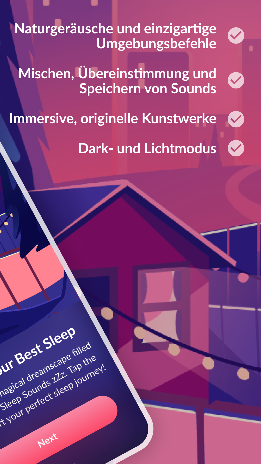 Sleep Sounds hilft Ihnen mit sorgfältig zusammengestellten, beruhigenden Klängen, schnell einzuschlafen, sodass Sie im Handumdrehen ins Traumland abdriften. Verabschieden Sie sich von schlaflosen Nächten und wachen Sie erholt und erfrischt auf.