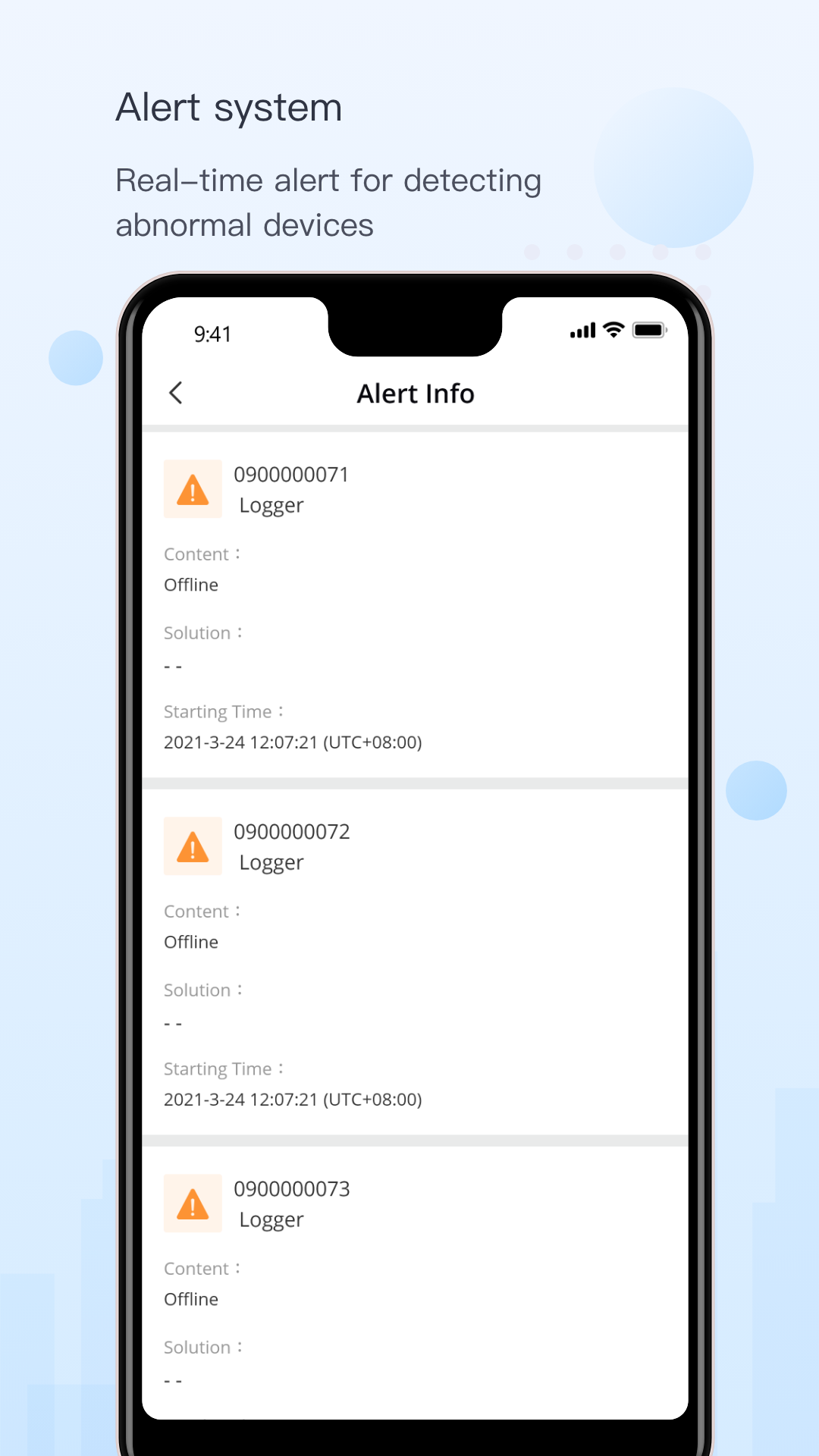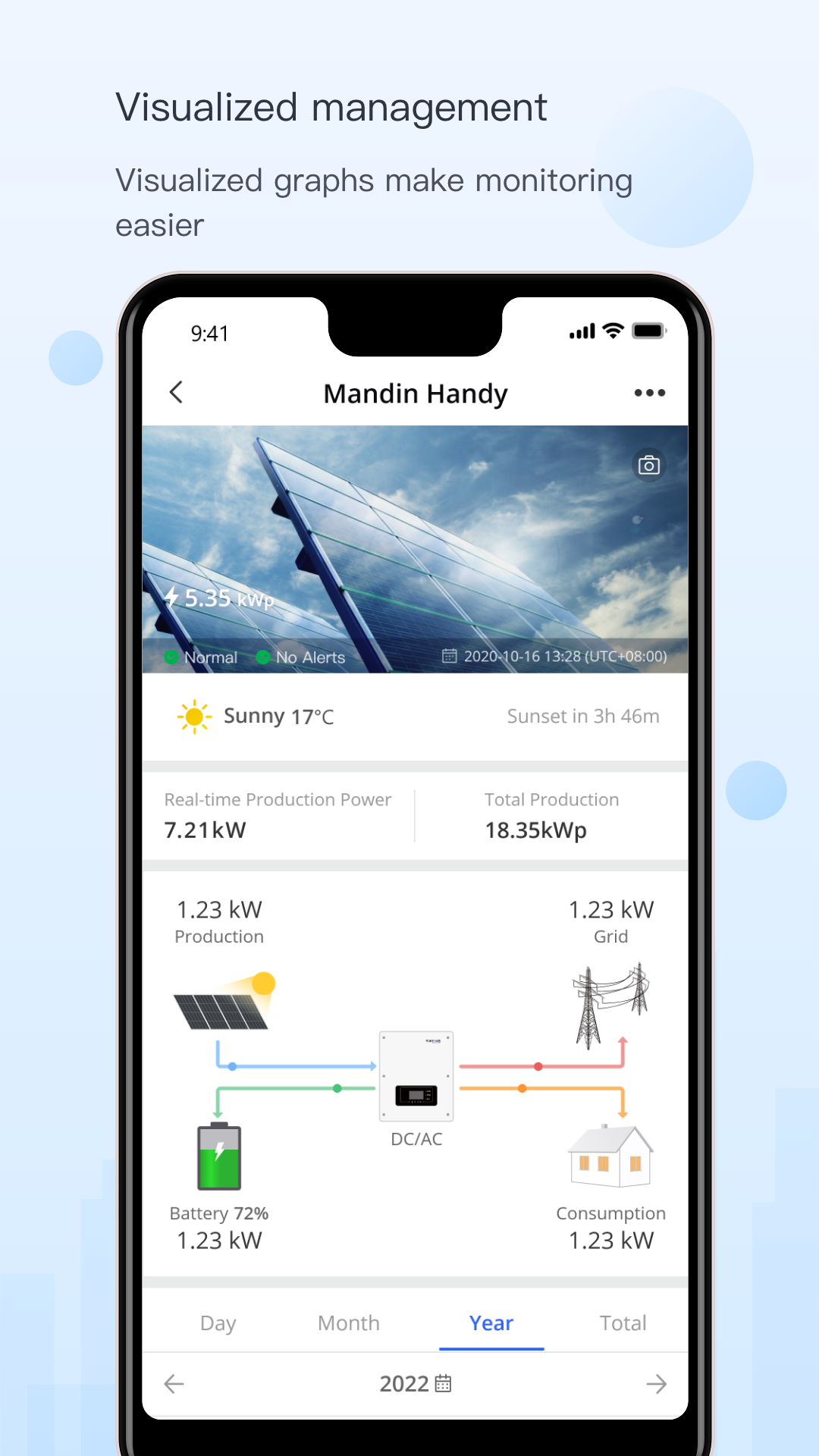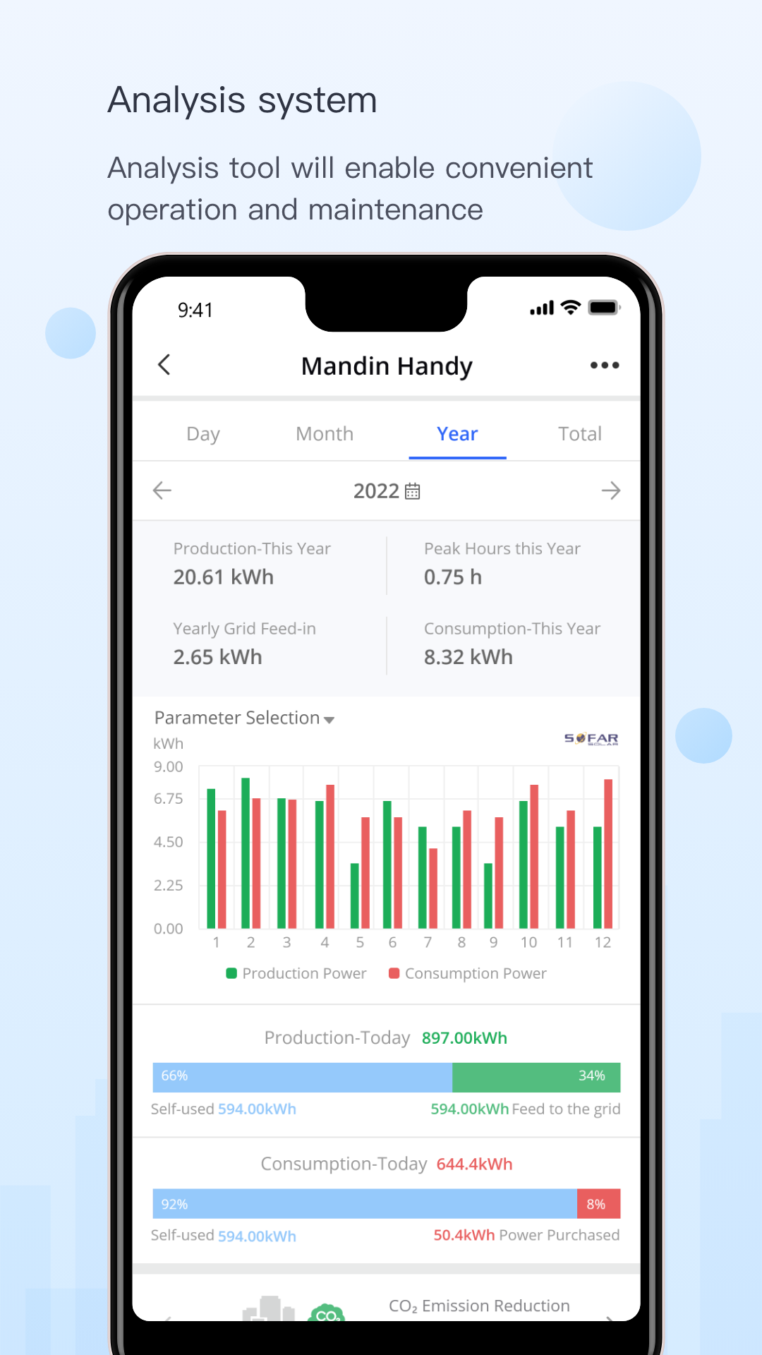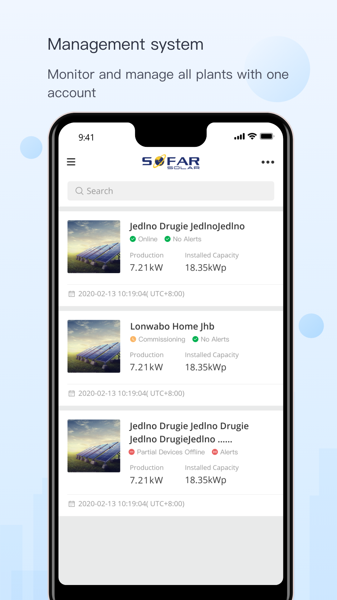 "SOFAR View ist eine brandneue Generation von intelligenten Energiemanagementanwendungen, die speziell für globale Benutzer entwickelt wurden. Mit den Grundmerkmalen vollwertiges visuelles Erlebnis, exzellente Datendarstellung und Rundum-Überwachung erreicht es das Ziel einer komfortablen Bedienung. 【Baue eine Anlage innerhalb von 1 Minute】 Sie müssen keine langwierigen Informationen eingeben. SOFAR View Big Data wird dazu beitragen, mehr Inhalte anzureichern. 【24-Stunden-Fernüberwachung】 Gehen Sie zur SOFAR View APP, um den Betriebsstatus des PV-Kraftwerks jederzeit und überall zu überprüfen. Zeigen Sie alle Daten (Produktion, Verbrauch, Batterie, Netz, Echtzeit, historische Daten usw.) auf einen Blick an. 【Effiziente Koordination】 Autorisierungsfunktion hinzufügen. Benutzer können die von Ihnen erstellte Anlage gegenüber Ihrem Geschäftspartner autorisieren, um O&M kooperativ durchzuführen. Inzwischen können Anwender die Anlage von Ihrem Geschäftspartner erhalten, sodass Anwender keine Anlage erstellen oder die Geräte konfigurieren müssen.“