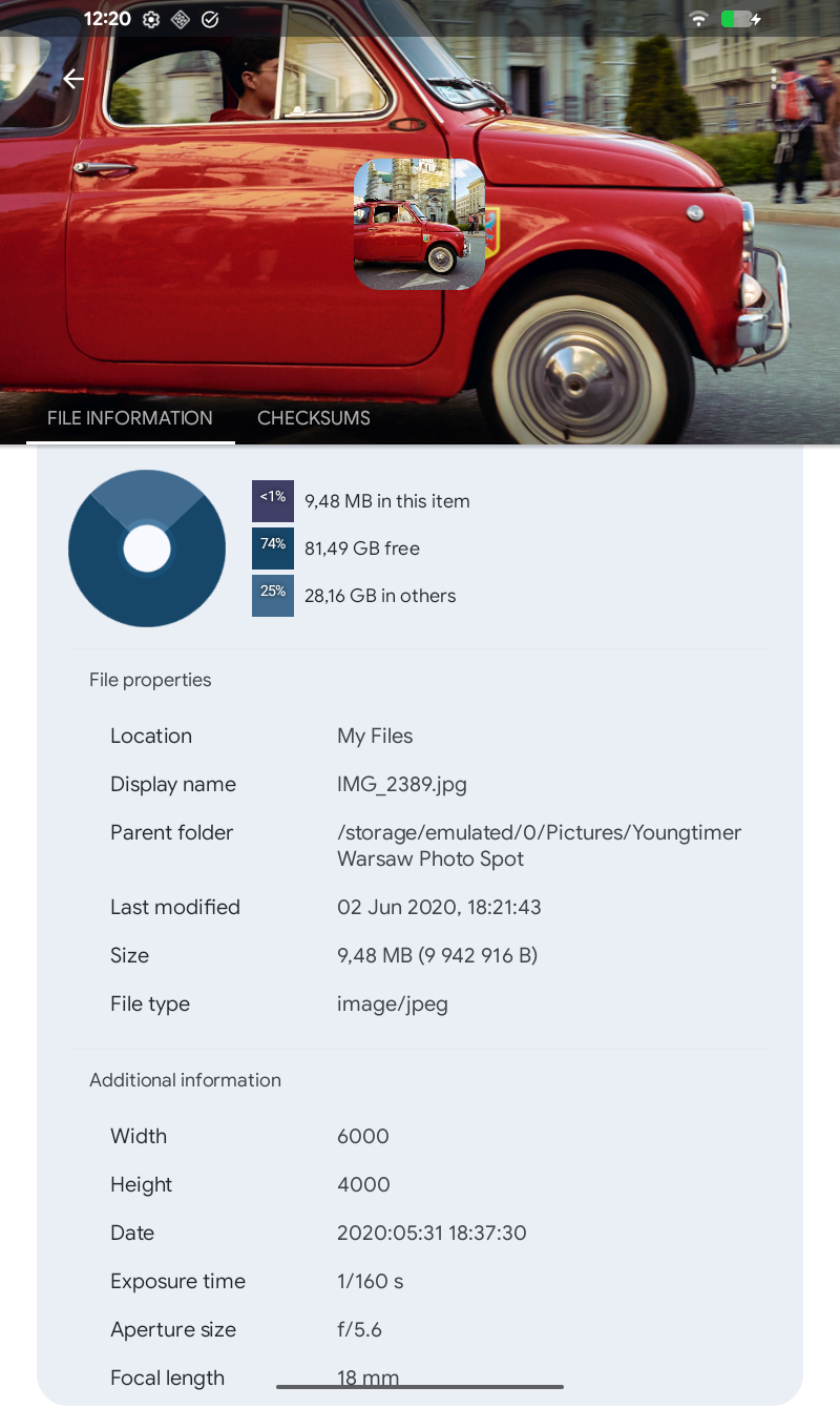 Obwohl dieser Dateimanager keinen dedizierten Speicheranalysator enthält, können Sie anhand der Ordnereigenschaften des internen Speichers oder der SD-Karte herausfinden, welche Dateien den größten Speicherplatz beanspruchen. Sie finden Informationen zum prozentualen Speicherplatz jedes Ordners und die Liste der größten Dateien. Sie können die Suche auch mit einem Dateigrößenfilter verwenden.