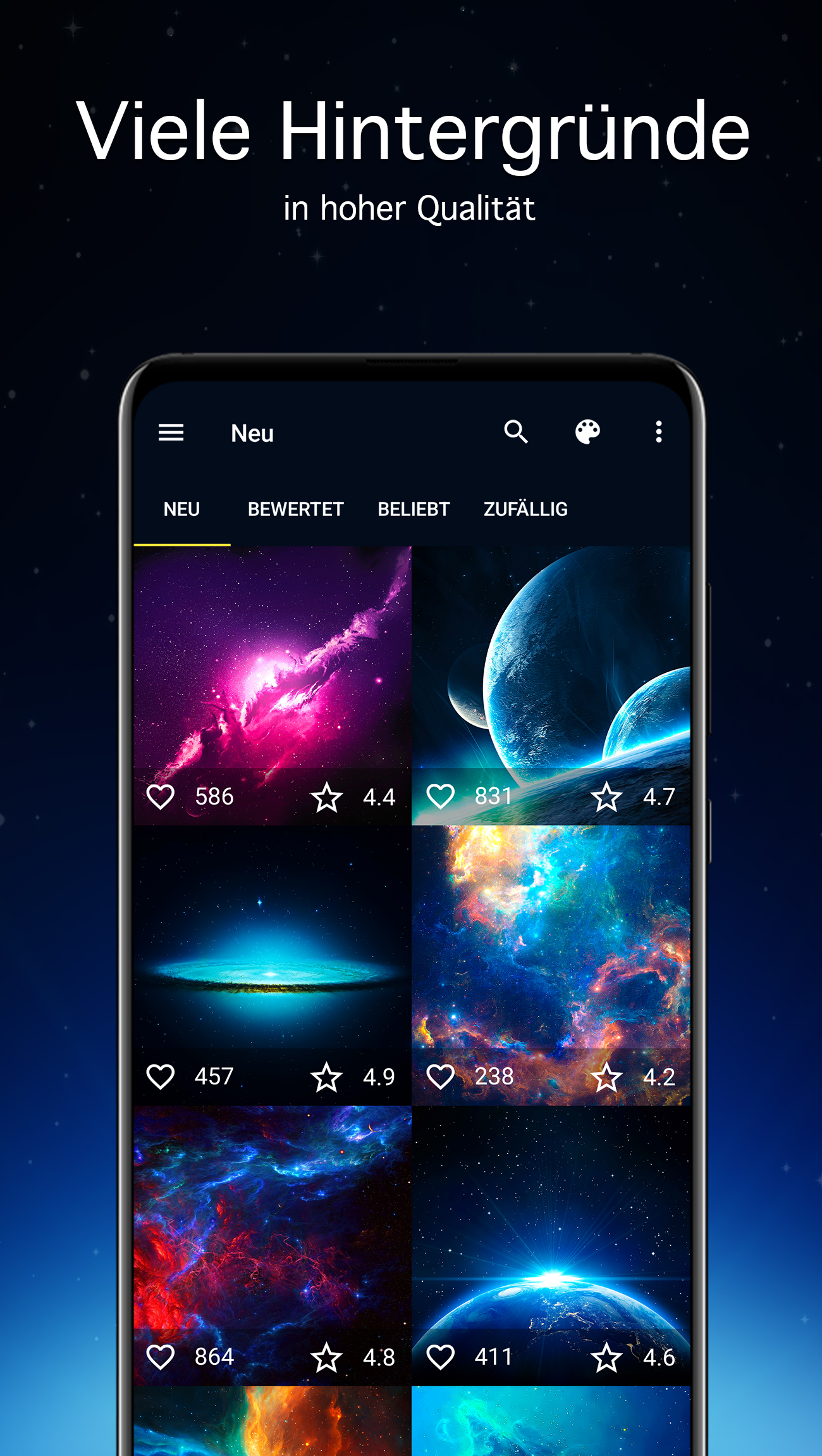 Weltraum Hintergrundbilder in 4K – Space-Wallpapers, die auf deinem Display sauber wirken. Finde Galaxien, Sternenhimmel und Planeten über Kategorien, Tags und Farbsuche. Auto-Wechsel, Favoriten und Verlauf machen deine Sammlung im Alltag bequem. Weltraum-Design, das du schnell findest Ob du einen ruhigen Kosmos-Hintergrund, leuchtende Nebel oder detailreiche Galaxy-Wallpapers suchst: Mit Filtern und Sortierung kommst du ohne langes Scrollen zum passenden Motiv. Beliebte Themen im Katalog sind Galaxien, Sterne, Planeten, Sternenfelder und farbige Nebel. Katalog mit Prüfung vor der Veröffentlichung Bevor Bilder im Katalog landen, werden sie manuell geprüft. Diese Moderation ist ein fester Bestandteil des Workflows in der 7Fon-App und sorgt für eine konsistente Auswahl. Auflösung & Details • Full HD (1080p), QHD, UHD und 4K-Wallpapers • Im Katalog gibt es auch vereinzelt Varianten bis 5K/6K/8K Viele Motive wirken dadurch auch auf hochauflösenden Displays scharf – auf Smartphone und Tablet. So findest du „deinen“ Weltraum-Wallpaper • Nach Farben (Farbpalette): wenn der Hintergrund zu Icons und Theme passen soll • Nach Tags: um ähnliche Space Backgrounds im gleichen Stil zu entdecken • Nach Stichwörtern: wenn du ein bestimmtes Motiv suchst • Nach Sortierung: „Neu“, „Bewertung“ oder „Beliebtheit“ Kategorien & Sortierung • 70+ Kategorien und eine klare Navigation • Schneller Wechsel zwischen neuen Bildern, Top-bewerteten und beliebten Motiven Favoriten, Verlauf und Empfehlungen • Speichere Hintergründe in Favoriten und rufe sie jederzeit wieder auf • Der Verlauf bringt dich mit einem Tipp zurück zu zuletzt angesehenen Bildern • Bewertungen helfen, Empfehlungen besser an deinen Geschmack anzupassen Passend für Smartphone und Tablet Die App wählt eine passende Auflösung für dein Gerät und unterstützt verschiedene Bildschirmformate. Vor dem Setzen kannst du den Ausschnitt anpassen und die Vorschau prüfen – so sitzt der Hintergrund am Ende sauber, ohne unnötige Ränder. In 1–2 Schritten anwenden • Bild öffnen → optional zuschneiden → als Hintergrund festlegen • Je nach Gerät: Startbildschirm, Sperrbildschirm oder beides • Bei Bedarf in die Galerie speichern, um es später zu nutzen oder zu teilen Dunkle Auswahl & AMOLED Für Fans von tiefem Schwarz gibt es dunkle Hintergründe und AMOLED-Wallpapers – ideal abends oder in der dunklen UI. Automatischer Wallpaper-Wechsel Lege Quelle (Favoriten oder Kategorie) und Intervall fest, damit sich dein Hintergrund automatisch ändert. Optional kannst du Startbildschirm und Sperrbildschirm getrennt konfigurieren – so wirkt dein Gerät jedes Mal ein bisschen anders. Offline, Speicherort, Daten sparen • Wallpaper herunterladen und offline verwenden • In Galerie oder auf SD-Karte speichern (falls unterstützt) • Preview-Qualität anpassen, um mobiles Datenvolumen zu schonen Benachrichtigungen • „Bild des Tages“ und „Bild der Woche“, damit du Updates nicht verpasst Zusätzliche Nutzung • Als Chat-Hintergrund nutzbar, z. B. in WhatsApp und anderen Messengern Kompatibilität & Performance Funktioniert mit gängigen Launchern und ist auf den Alltag ausgelegt. Der Katalog wird regelmäßig ergänzt – entdecke neue Weltraum- und Universum-Hintergründe, wenn du Lust auf Abwechslung hast.