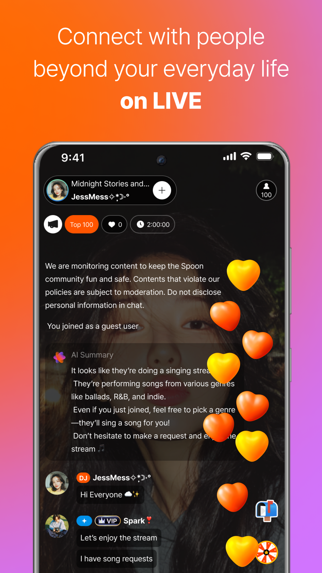 - Haben Sie sich jemals zu Tode gelangweilt? - Wollten Sie schon immer etwas Neues ausprobieren, abgesehen von YouTube oder Twitch? Wenn Sie eine dieser Fragen mit „Ja“ beantwortet haben, ist es Zeit für Spoon, die reine Audioplattform für Livestreams und Podcasts, die von über 30 Millionen Menschen weltweit geliebt wird. Finden Sie jetzt Ihren nächsten Lieblingsstreamer. [Für Zuhörer] - Exklusive Livestreams und Podcasts – über Musik, Nachrichten, Spiele, Schule und vieles mehr. - Unterstützen Sie Ihre Lieblingsstreamer, indem Sie sie abonnieren oder exklusive Aufkleber versenden. Durch das Abonnieren erhalten Sie Zugang zu den verschiedenen Vorteilen, die nur Abonnenten vorbehalten sind und die die Streamer selbst festlegen. - Sprechen Sie direkt mit Ihren Lieblingsstreamern und Podcast-Erstellern. - Springen Sie ganz einfach in die Live-Streams ein und aus, die Sie hören möchten. - Erstellen Sie Ihre eigene Playlist. [Für Streamer] - Gehen Sie live oder starten Sie einen Podcast mit Ihrem Telefon. Vergessen Sie ausgefallene Mikrofone und OBS. - Keine Kamera erforderlich. Lassen Sie Ihre Kamera beim Streamen ausgeschaltet. - Sprechen Sie über alles, worüber Sie sich freuen. Den Rest erledigen wir. - Drücken Sie eine Taste, um die Aufnahme zu starten und Ihren Podcast hochzuladen. Keine zusätzlichen Schritte erforderlich. - Treten Sie der Spoon-Mitgliedschaft bei und bringen Sie Ihre Fans dazu, Sie direkt zu unterstützen. Teilen Sie exklusive Inhalte nur für Abonnenten, um Ihre Wertschätzung zu zeigen. [Sicherheit ist wichtig] Unsere größte Priorität ist die Gewährleistung der Sicherheit unserer Benutzer auf unserer Plattform. Spoon ist bestrebt, eine einzigartige und ungiftige Online-Plattform zu schaffen, und unser Moderationsteam überwacht die Inhalte aktiv rund um die Uhr, um die Sicherheit von Spoon zu gewährleisten. Weitere Informationen darüber, wie wir Spoon großartig und sicher halten, finden Sie in unseren Community-Richtlinien hier: https://www.spooncast.net/service/communityguideline. [Gemeinschaft] Website: www.spooncast.net Instagram: https://www.instagram.com/spoon_us/ Twitter: https://twitter.com/spoon_us [Benötigen Sie Hilfe?] In der App: Profil > Menü > Kontakt > Hilfe [App-Berechtigungen] Erforderliche Berechtigungen - Keine Optionale Berechtigungen - Mikrofon: Berechtigung zur Nutzung von Livestream- und Sprachinhalten - Speicherplatz: Berechtigung zum Speichern von Livestream- und Sprachinhalten - Kamera: Erlaubnis zur Nutzung von Bildern und Medien - Benachrichtigung: Erlaubnis zur Benachrichtigung über DJ-Nachrichten und Inhaltsinformationen - Telefon: Berechtigung zur Nutzung des Live-Anrufs während eines Live-Streams Weitere Informationen finden Sie unter dem folgenden Link. - Nutzungsbedingungen: https://www.spooncast.net/service/termsofuse - Datenschutzrichtlinie: https://www.spooncast.net/service/privacypolicy Laden Sie Spoon jetzt herunter, um Live-Streams zu finden und daran teilzunehmen, Podcasts anzuhören und Gespräche zu beginnen. Vergessen Sie Wizz, Yubo und Bigo Live – es ist Zeit, auf Spoon aufzuspringen!