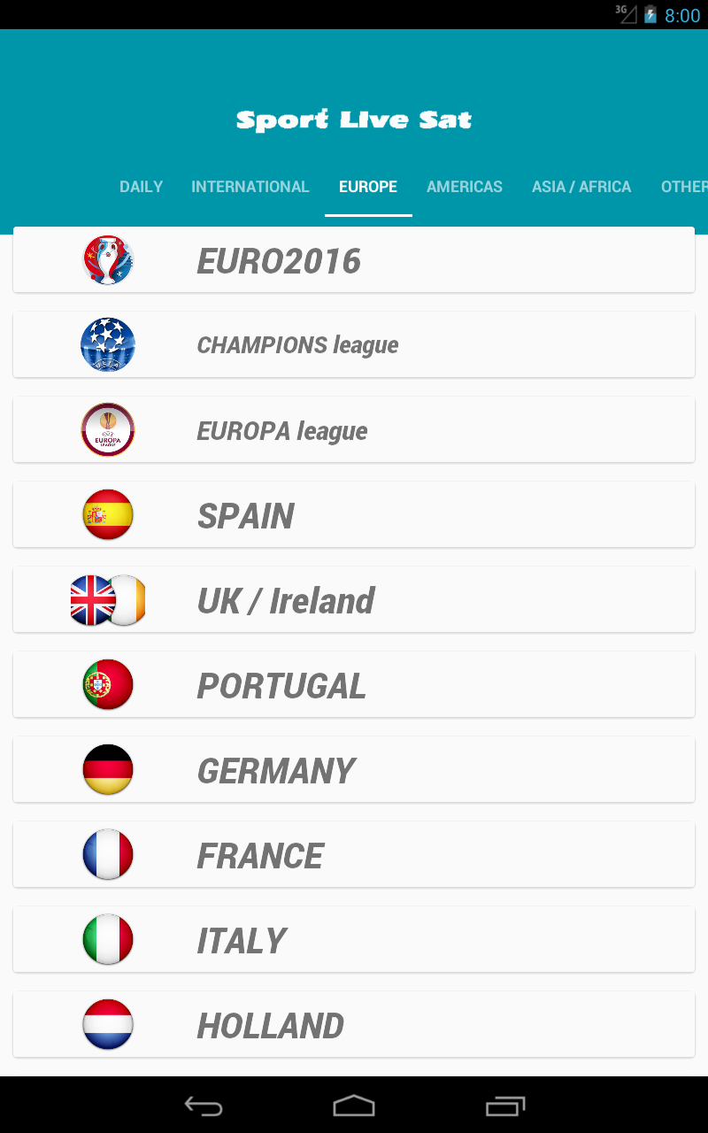 Neue Schnittstelle !! Keine Sport, vor allem Fußball Verpassen Sie nicht !. Zeitpläne einzuhalten verschiedenen Sportveranstaltungen in der Welt, und warum, und dass Satétile Kanal und Frequenz ausgegeben! Mit Live-Sport Sat wissen Sie: Fußball: - Aktivitäten heute sehen. Alle Spiele, die Sie an einem bestimmten Tag zu beobachten. - Fußball-Freundschaftsspiele und Teams. - EURO 2016 Spiele und europäischen Champions League. - Europäische Ligen: - Spanisch (Liga BBVA und Liga Adelante, Copa del Rey, Super Cup, ...). - English (Premier League, League One, League Two, ...). - Portugiesisch (Portugiesischer Pokal, Portugiesisch Superliga, ..) - Italienisch (Serie A, Serie B, Coppa Italia, ...) - Deutschland (Bundesliga, German Cup, ...) - Französisch, Niederländisch, Türkisch, Griechisch, usw. - League of America: - CONCACAF, CONMEBOL - MLS, Argentinien, Brasilien, Kolumbien, Mexiko - League of Asia: - China, Japan, Saudi-Arabien, Südkorea, Australien, ... - Afrikanische Liga: - Southafrica - Marokko. Alles in einer leicht zu identifizieren: Die Flaggen der verschiedenen Länder. Außerdem: - Basketball (NBA und FIBA / ULEB) - Rugby (Rugby-Liga und Union League). - Formel-1. - Boxen. ... Etc. Ideal für motorisierte Antennen.