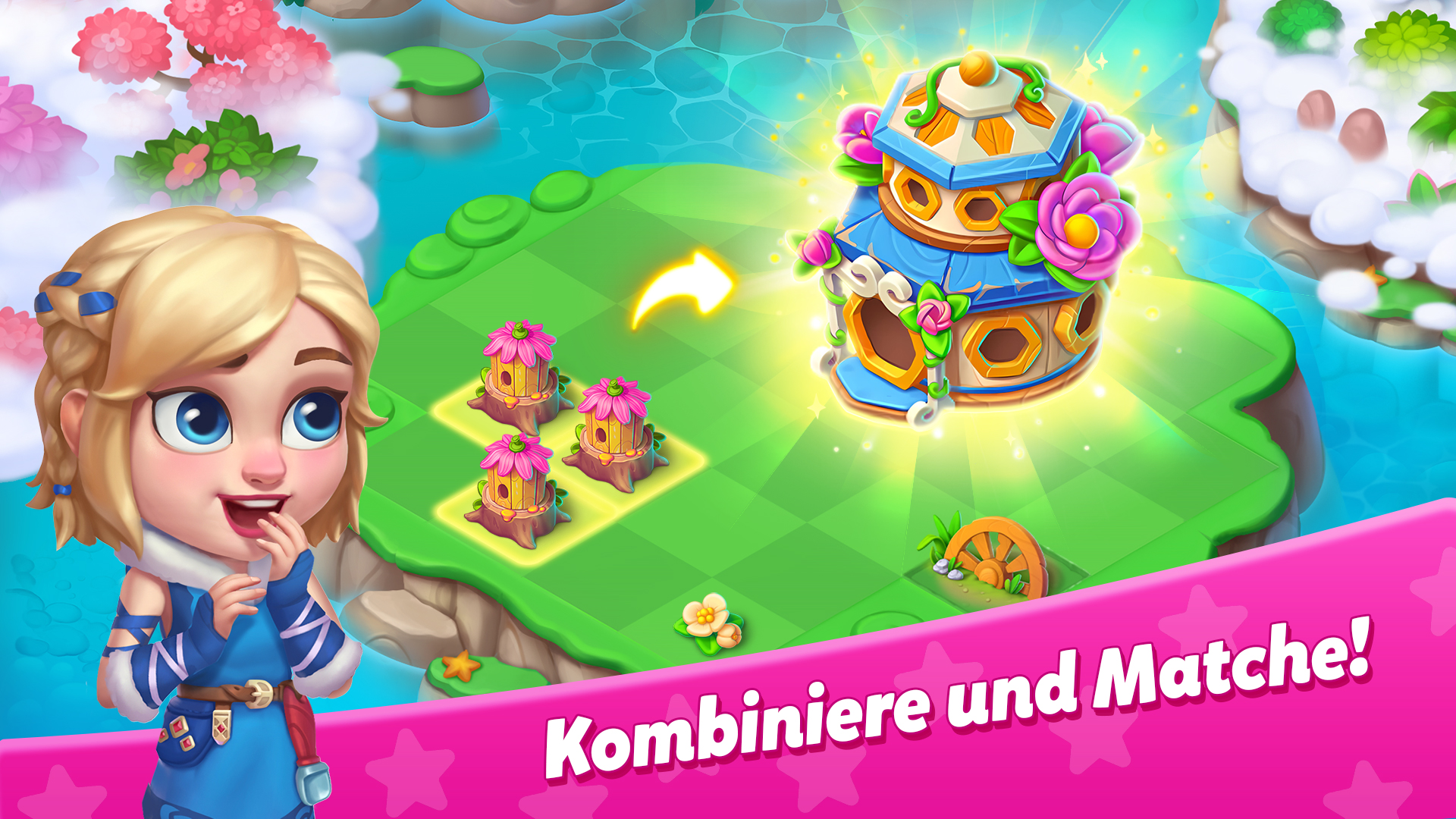 • Kombiniere alles auf der Karte, merge Setzlinge zu Pflanzen, Häuser zu Villen!