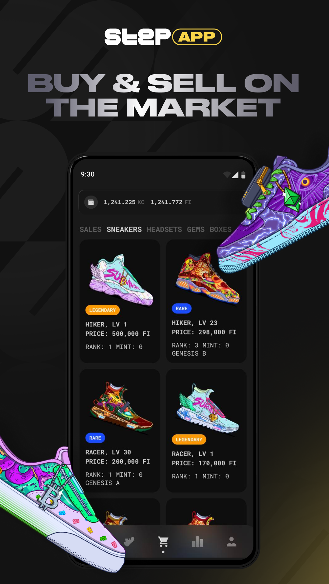 Kaufen und verkaufen Sie Step App Gear auf unserem Marktplatz – Turnschuhe, Kopfhörer, Uhren und Edelsteine. Der Wert jedes Artikels hängt von seiner Klassenstufe, seinen Statistiken und den Marktbedingungen ab.