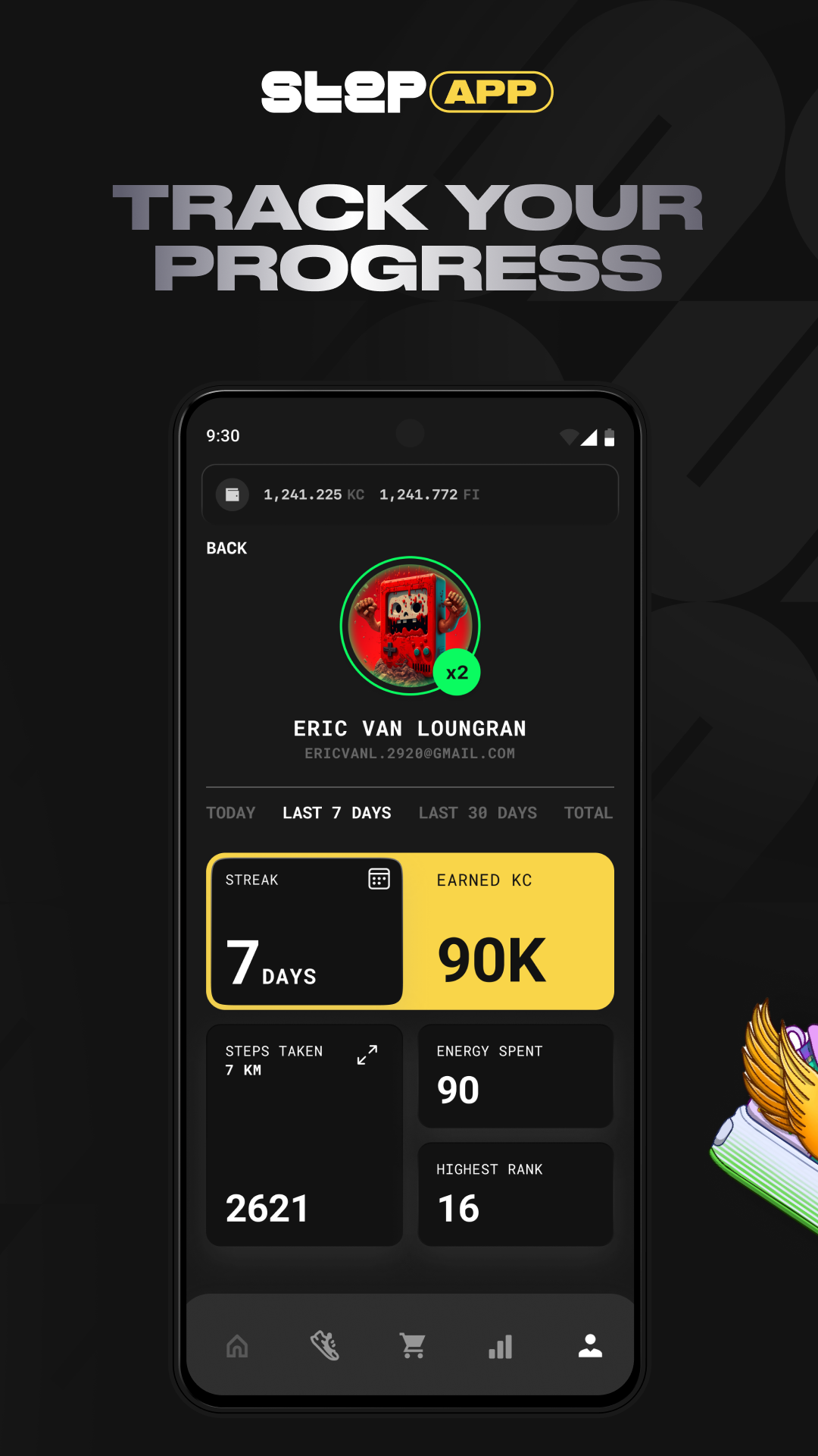 • Holen Sie sich Ihre einzigartige In-Game-Ausrüstung, um Einnahmen aus Ihren Schritten zu generieren und Ihre Bewegungen zu verfolgen