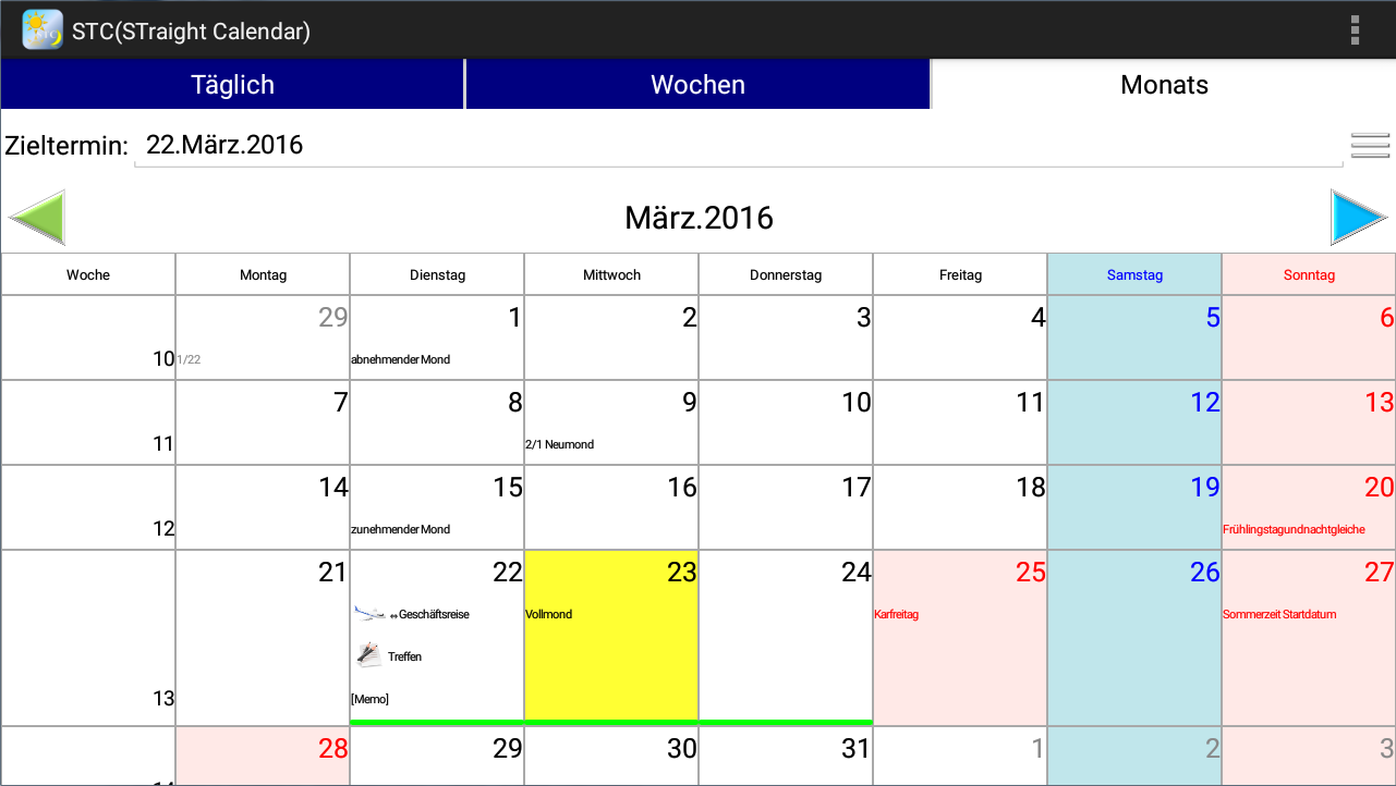 - In Monats/Wochen Kalender, Es kann zu Beginn alle Tage der Woche festlegen.