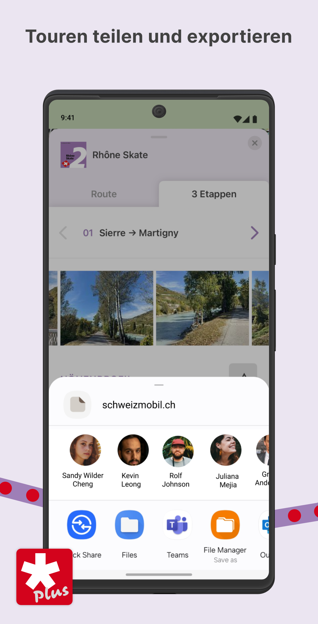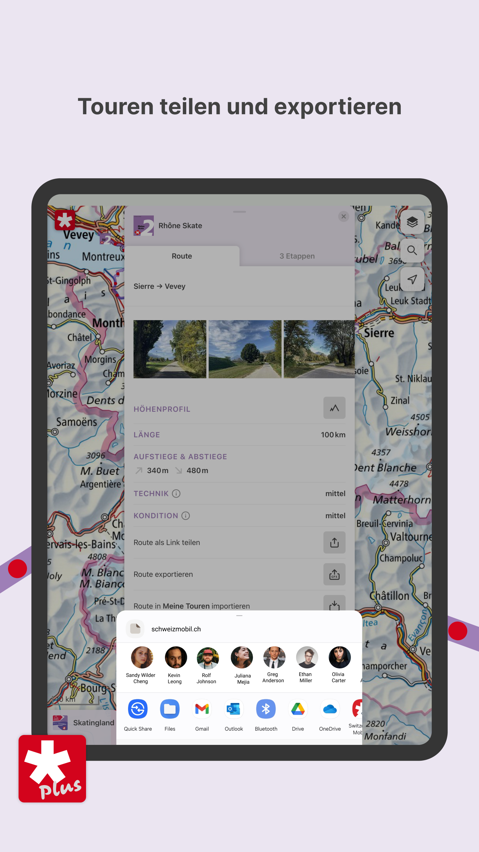 Share and export routes Share your favorite routes via link. With SwitzerlandMobility Plus, export them as GPX and import them into your tour list to adapt SwitzerlandMobility routes to your own planning.