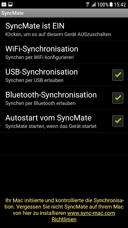 Dieses spezielle Android-Modul des SyncMate hilft Ihnen dabei, Daten auf Ihrem Android-Gerät über Wi-Fi, USB oder Bluetooth mit einem Mac zu synchronisieren. Kontakte und Kalendar Ihres Android-Gerätes können völlig kostenlos mit einem Mac synchronisiert werden. Andere Optionen wie die Synchronisierung von Ordnern, Safari-Lesezeichen (Android 3.x-5.x), iTunes und iPhoto oder die Möglichkeit, Android als neues Laufwerk auf einem Mac einzubinden sowie die Verwaltung von SMS sind in der Experten-Edition (kostenpflichtig) verfügbar. ANMERKUNG: SyncMate für Android ist lediglich eine Synchronisierungs-Applikation. Die Hauptsoftware für die Synchronisierung muss auf Ihrem Mac installiert sein. Sie können die App downloaden unter http://goo.gl/JrKCAS Richtlinien https://goo.gl/bxvBzZ