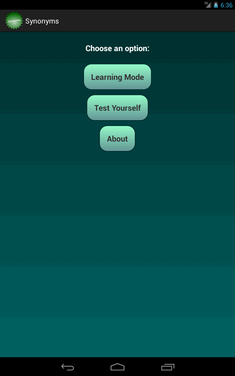 Synonyms is an application that helps to learn similar words (also known as Synonyms) in the English language. By similar words, it means words which have the same meaning. E.g. ready = alert, transient = temporary. Features: • Learn Synonyms or Similar words in the English language • 500+ words • 2 Modes : Learning and Test Mode • Quick Quiz of Random 5 Questions