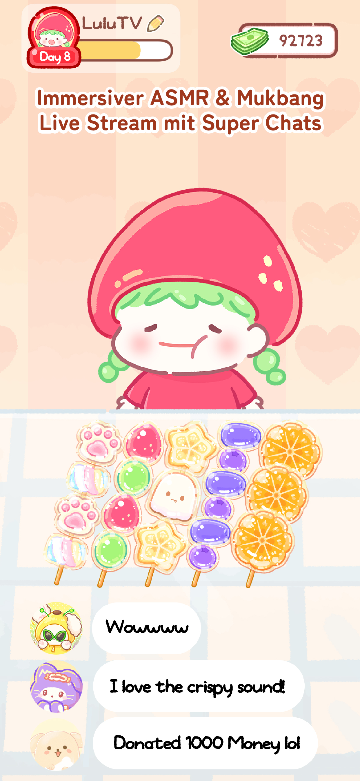 Wieder einmal ein knuspriger Livestream-Erfolg! Lecker! Der Chat war heute sehr belebt. Jetzt ist es Zeit, frische Zutaten mit den Super Chats zu besorgen, die ich durch das Abschließen von Zuschaueraufgaben verdient habe!